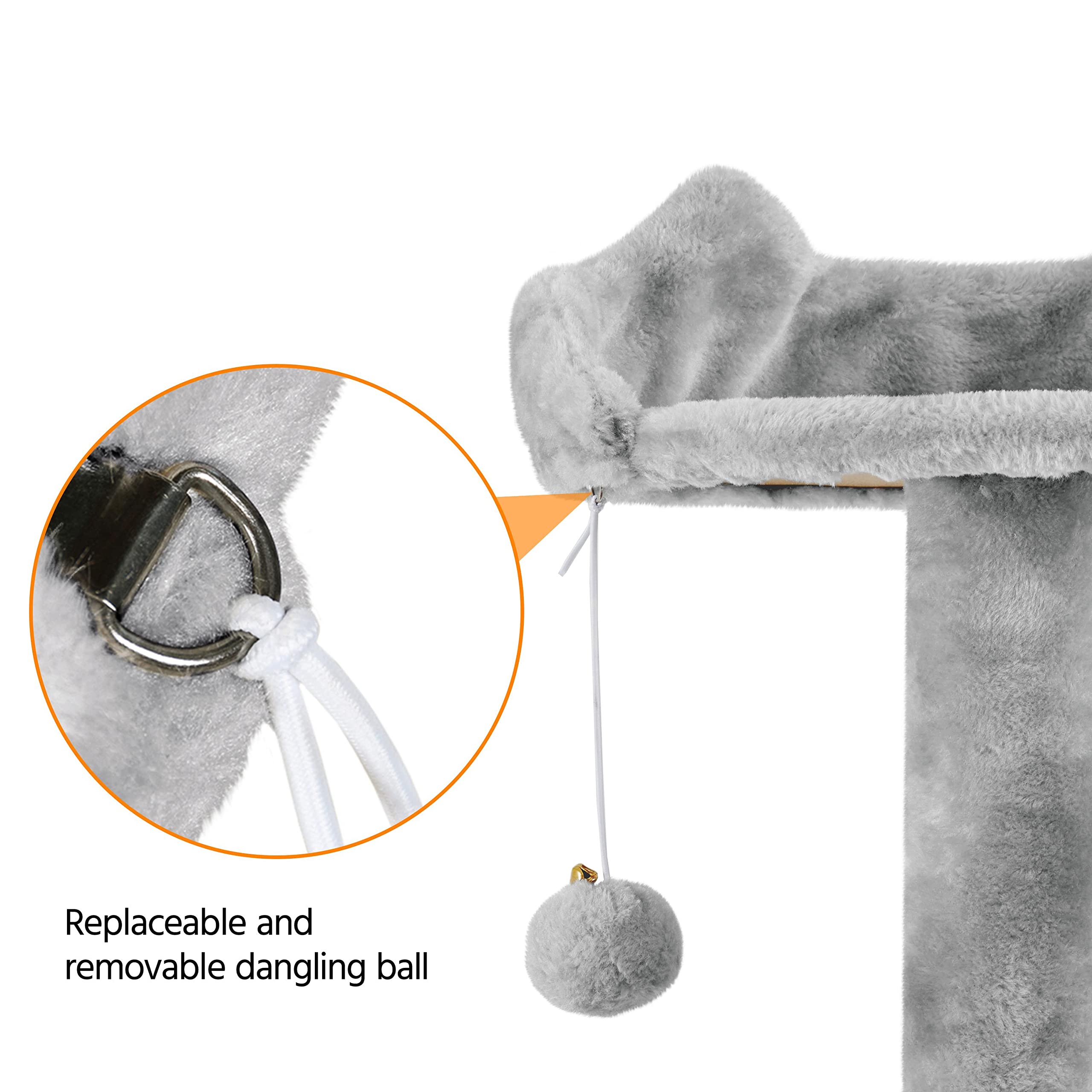 DANGLING BALL: The cat condo and the top perch hang a ball for more excitement, and you can remove it or replace it with your own balls