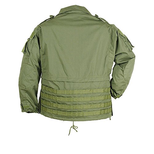 Description A great shooting jacket or field coat, made of rip stop poly/cotton with an abundance of features; full front YKK two-way zippers with button over and hook-n-loop storm flap, two vertical YKK zippered chest pockets, two upper bellows button flap pockets, two lower bellows button flap pockets with YKK side zip access, cord lock drawstring waist, cord lock drawstring hem, two upper chest ID patch panels, button down epaulettes, two hook-n-loop flap-covered sleeve pockets with two ID patch areas on each pocket, reinforced elbows, adjustable sleeve cuffs, inside YKK zippered pocket and back lower PALS webbing for attaching your gear.