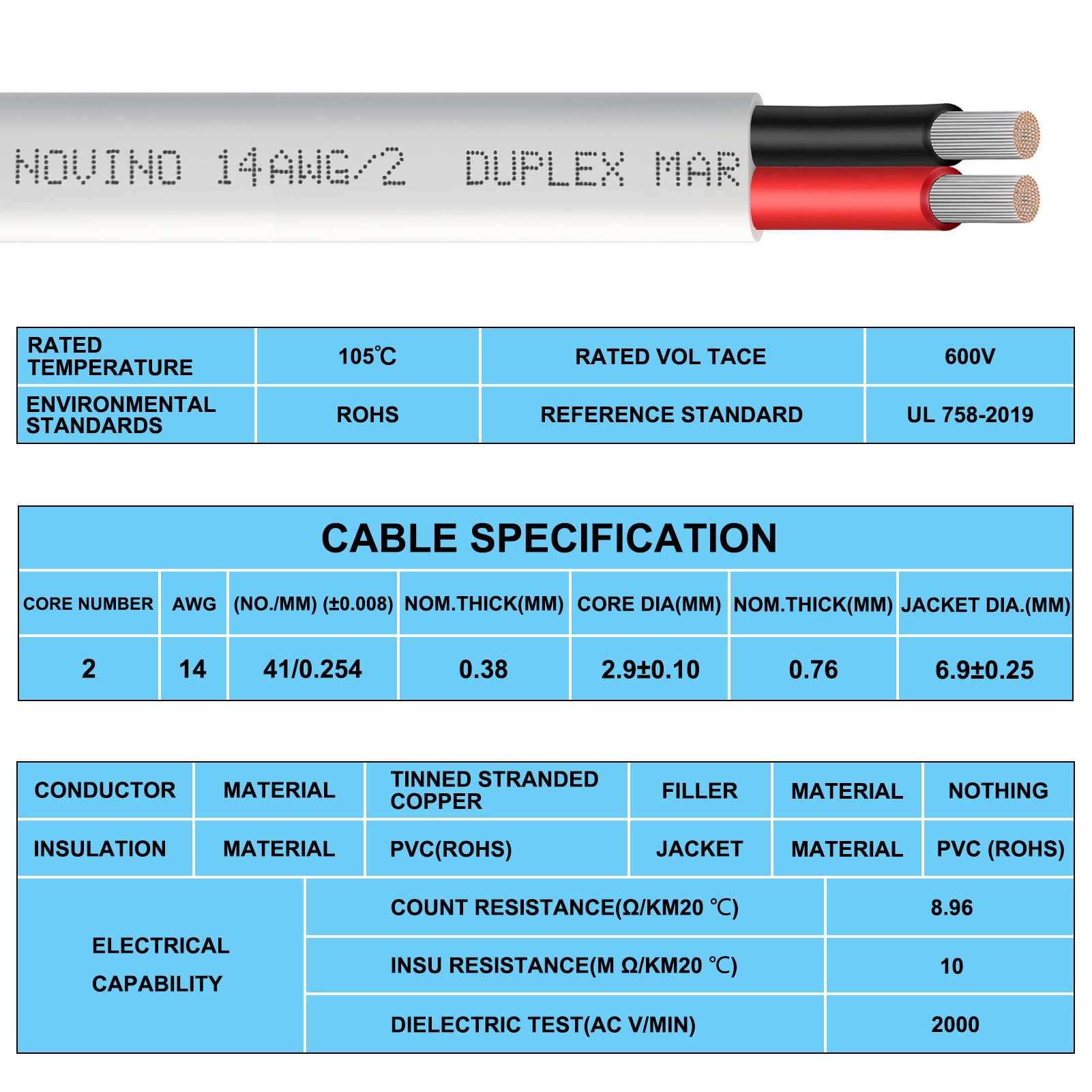 Marine grade wire Spec:white PVC jacket, red&black conductor sheaths, tinned & stranded true 14 AWG 14/2 flat copper wire,14 awg wire is insulation rated to 600v, 105 degrees C dry, and 75 degrees C wet