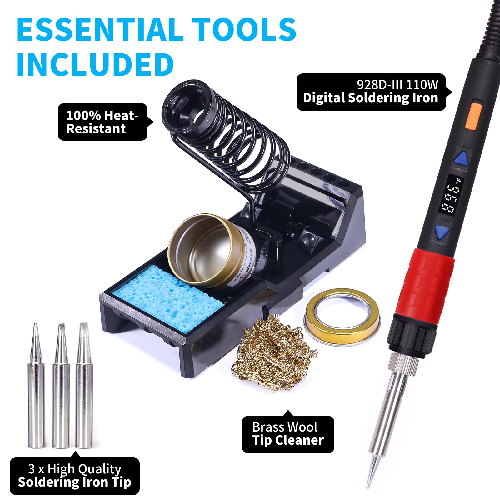 Extra Accessories – 4 x Quality Soldering Tips (Default Type-B, K, 2.4D, 3.2D), 1 x X-4 Heat-Resistant Soldering Iron Stand, 1x Tip Cleaner (includes brass wool), 1x Cleaning Sponge.