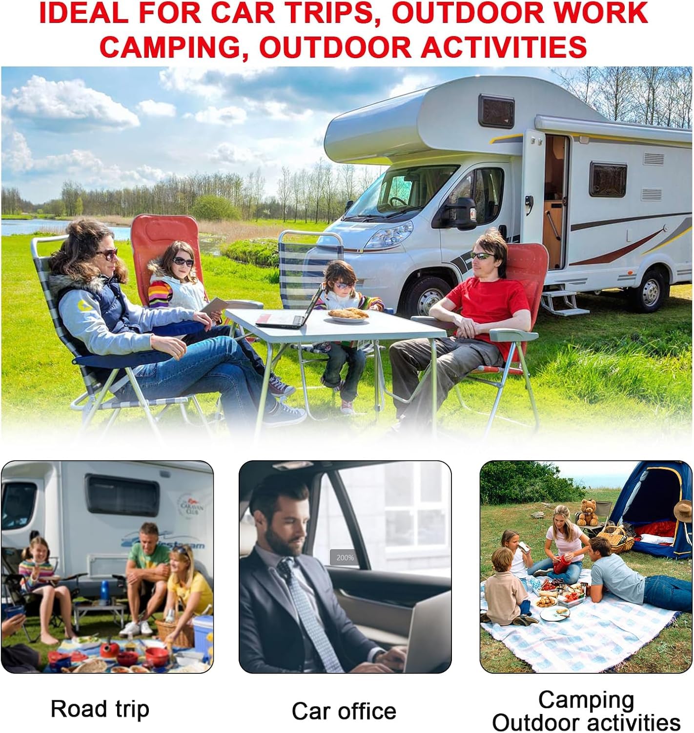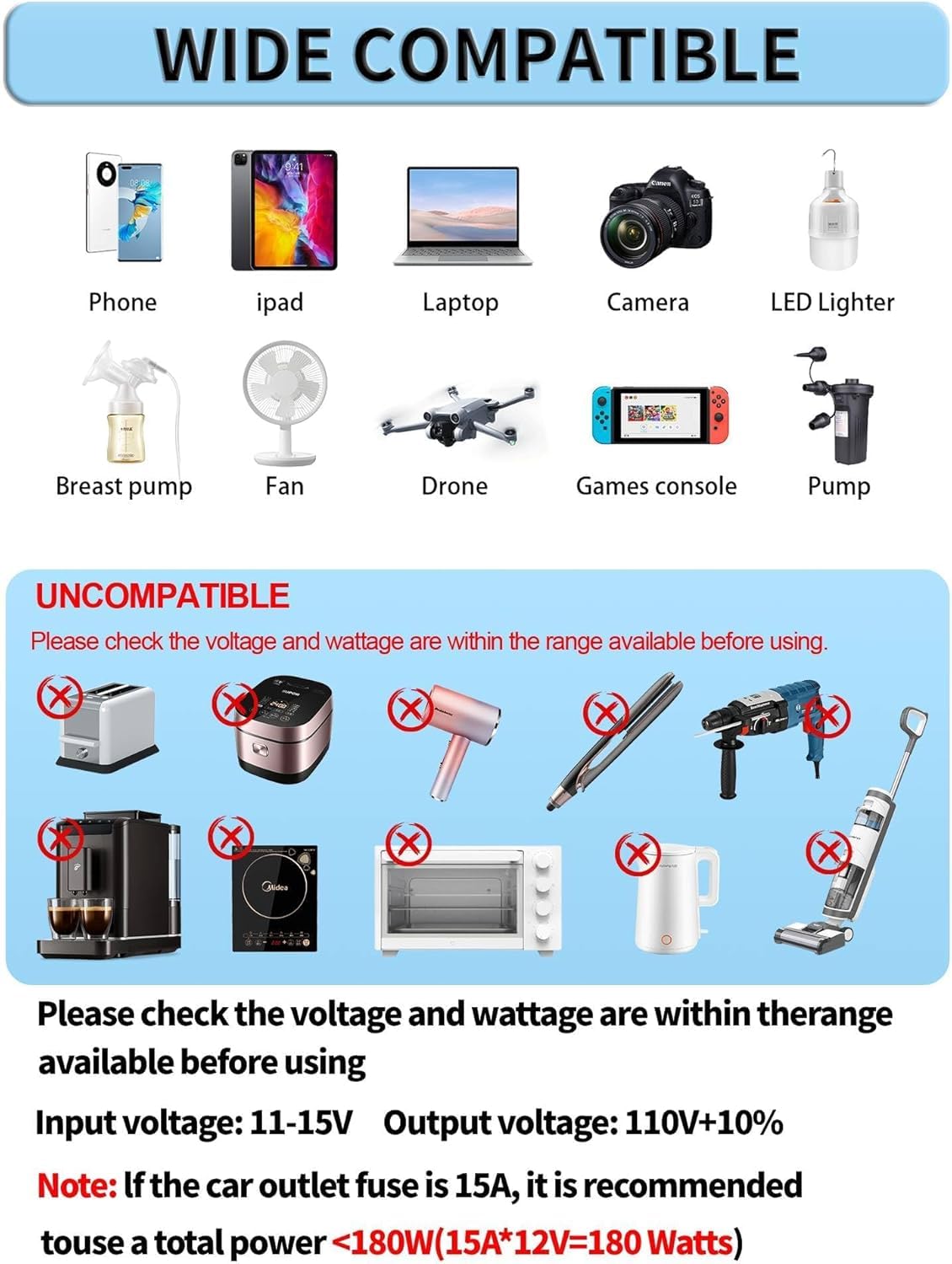 【Ideal for Road Trips】: Can be connected to the power supply using a cigarette lighter (less than 150W) or cables. The USB-A ports are suitable for charging devices such as Kindles, smartphones, iPads, tablets, cameras, and AirPods. The AC outlets provide a reliable power supply for appliances requiring 1000W to 1200W, including laptops, DVD players, breast pumps, bottle warmers, and other similar devices.