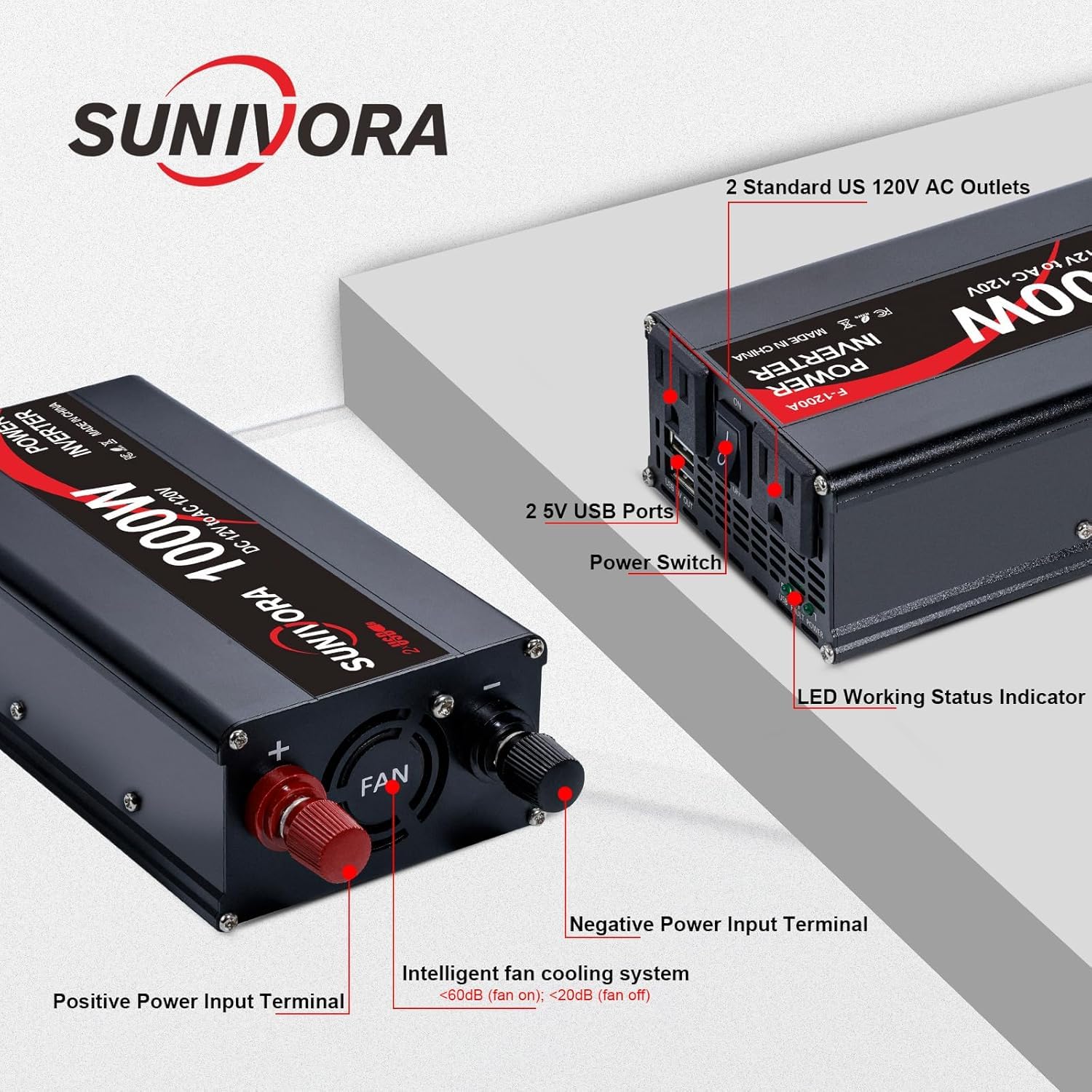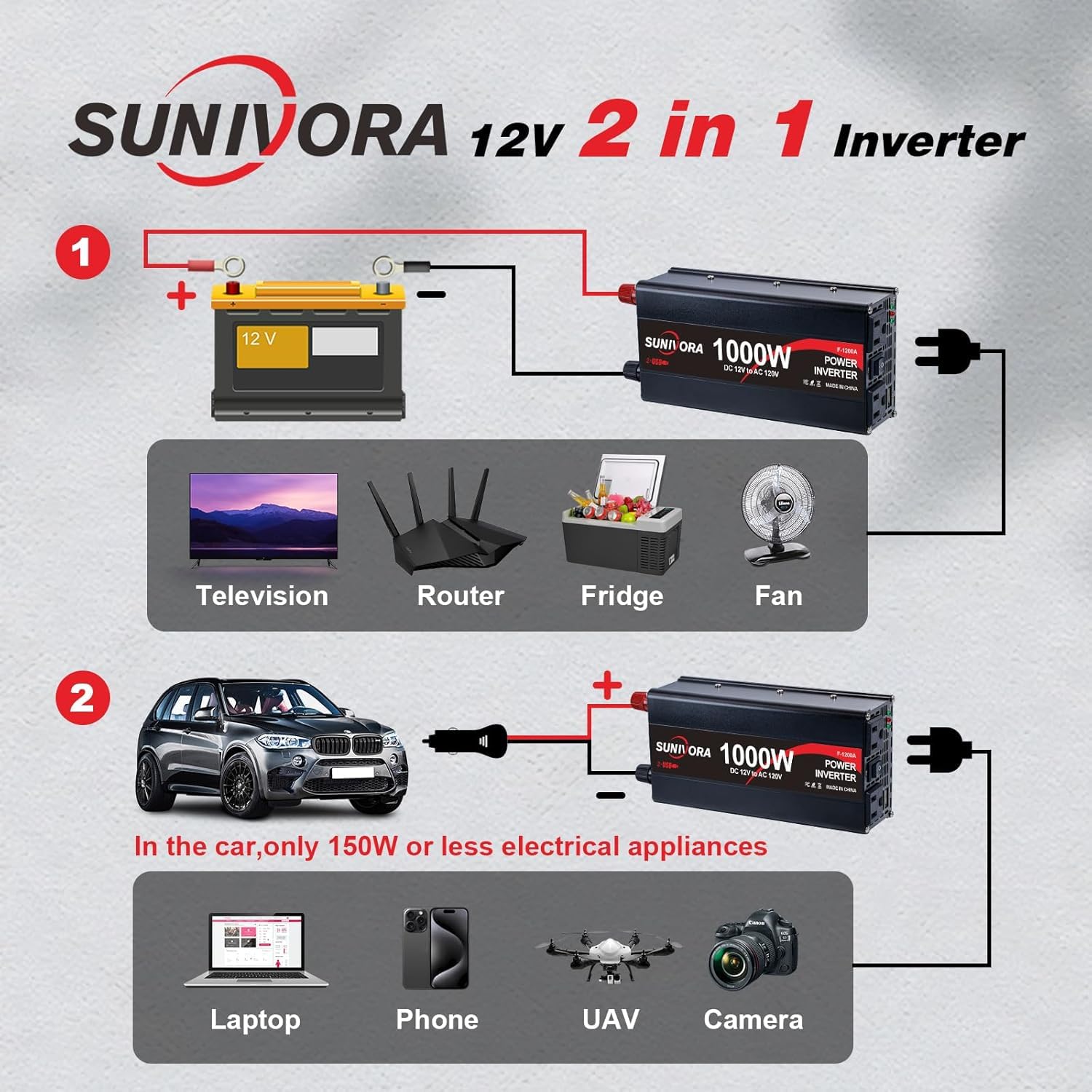 【What You Will Get】: Sunivora 1000W Power Inverter with 20-inch cigarette lighter plug,1 set of battery cables (1x red, 1x black), user manual, 12-month warranty, and friendly customer service. If you aren't satisfied with the product, please feel free to contact us, and we will solve it for you in the first time.
