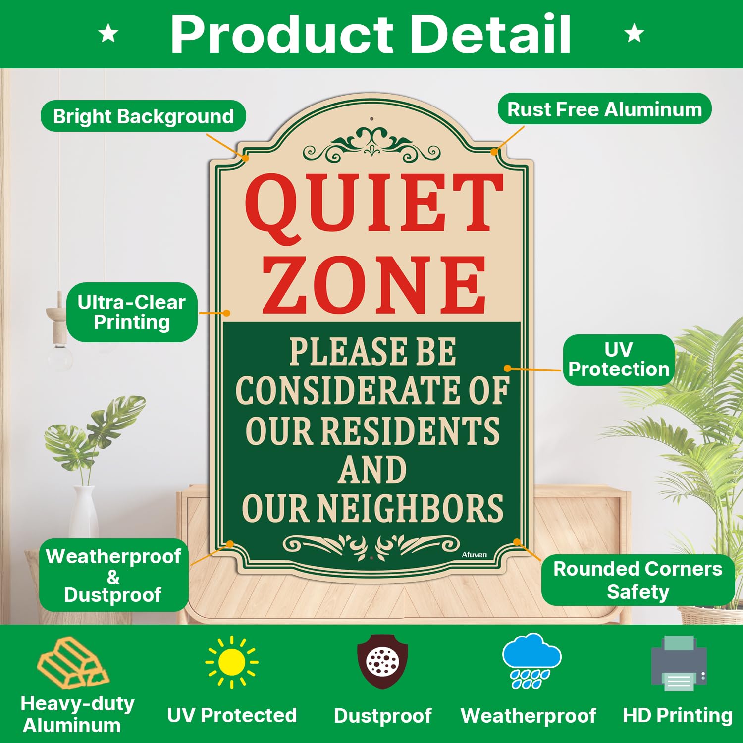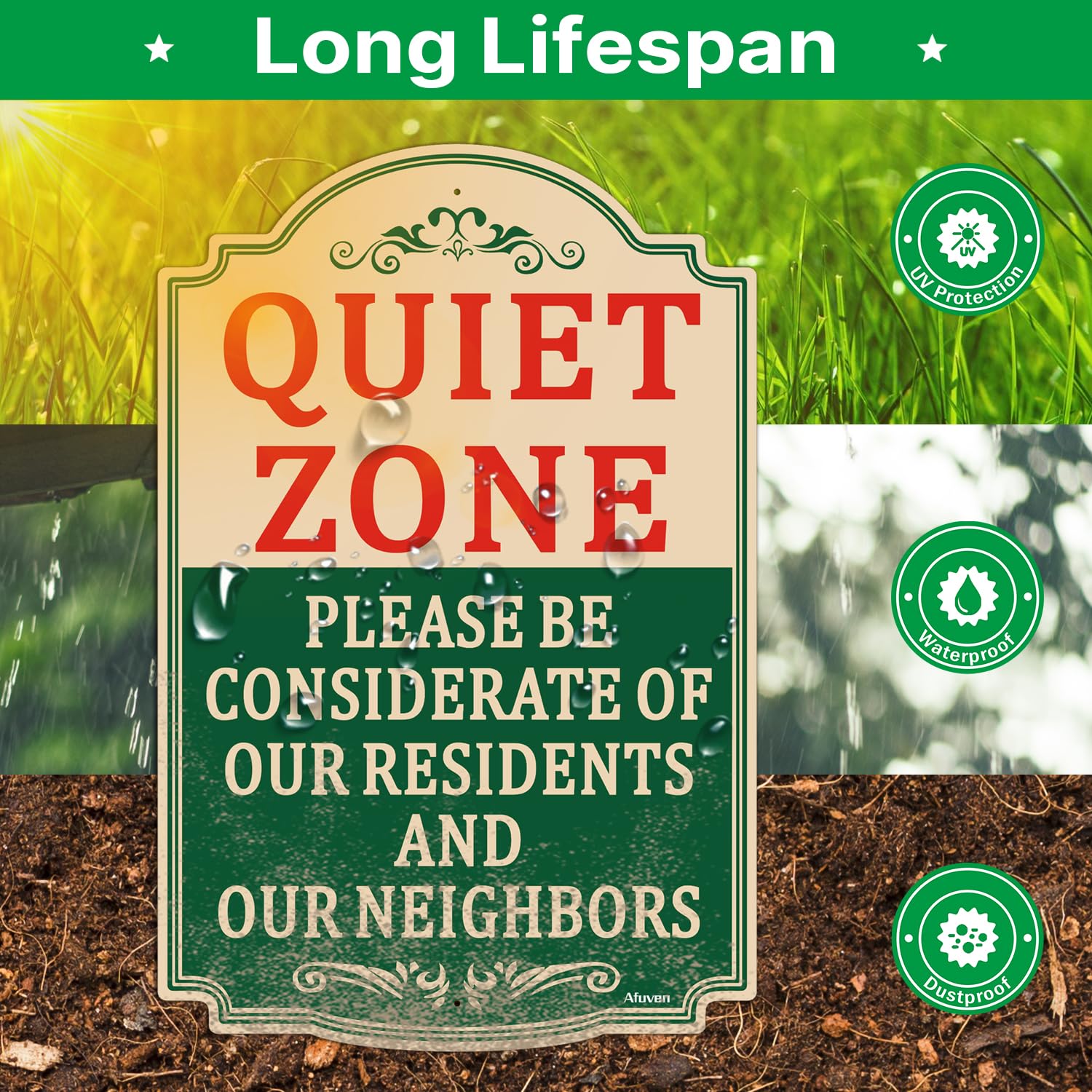 [Sturdy and Durable]: Quiet Zone Please Be Considerate of Our Residents and Our Neighbors Signs is made of Rust-Free Aluminum material. This Quiet Signs can be easily used outdoors