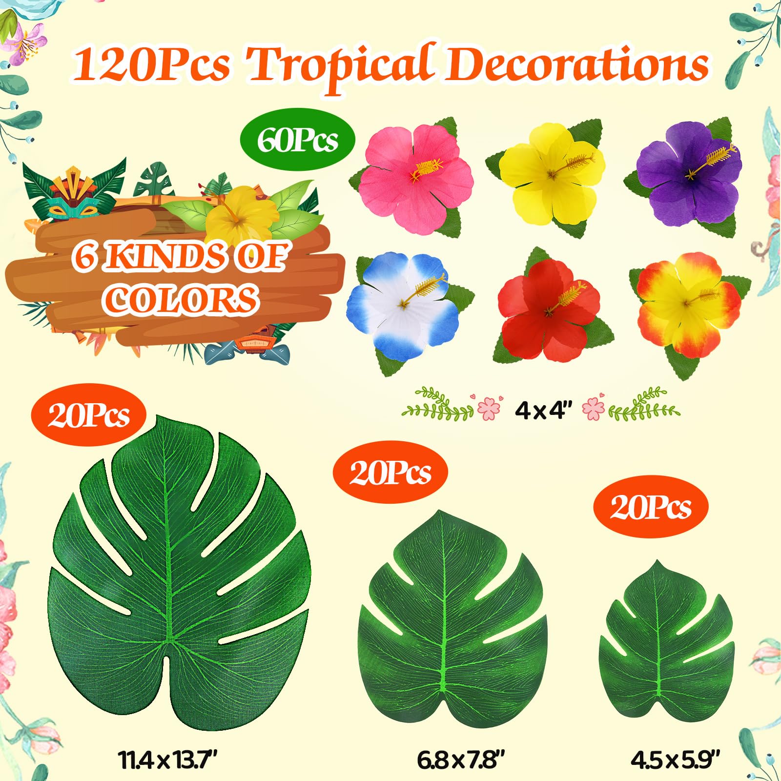 HUGE PACK PALM LEAVES FLOWERS: 120 pcs vibrant tropical decorations fake plants, including monsteara palm leaves 20pcs(11.4x13.7in), 20pcs(6.8x7.8in), 20pcs(4.5x5.9in), hibiscus flowers 60pcs(4x4in). Decent artificial flowers come in 6 pretty color combinations. Made of soft lightweight polyester material, look like real leaves with comfortable touch