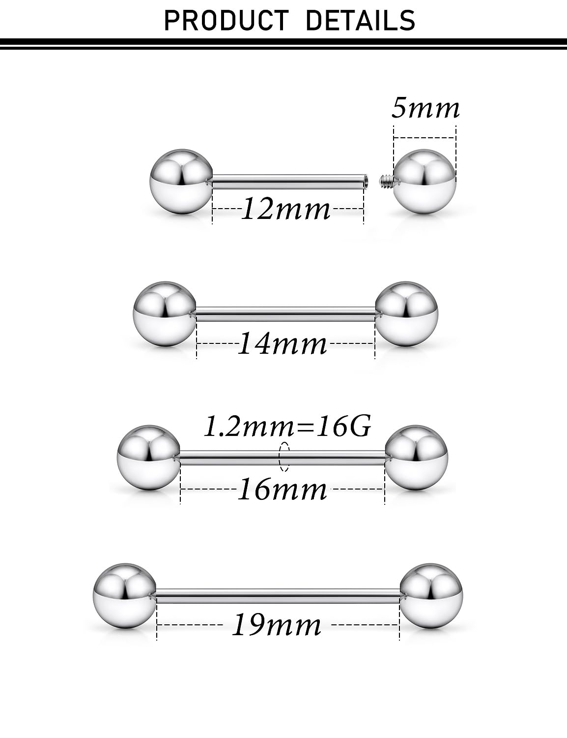 SIZE:Nipple Piercing Tongue Rings Bar Thickness: 16G=1.2mm, Wearable Length: 12mm 14mm 16mm 19mm, The Ball Size is 5mm.