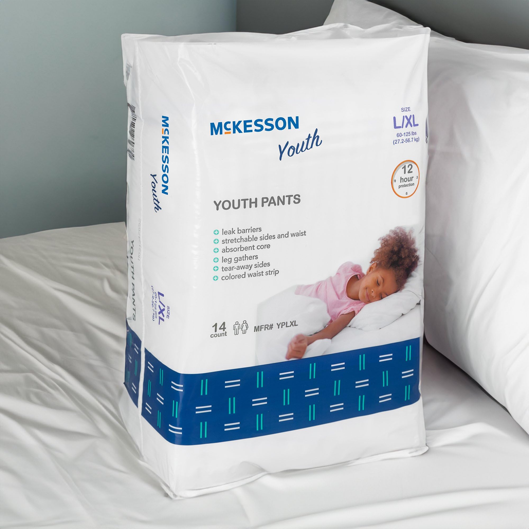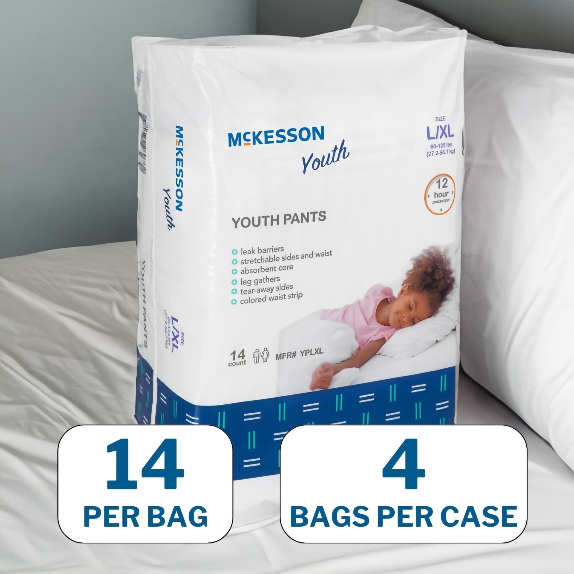 Pull-up pants are a size large/XL and fit children weighing 60-125 lbs. Please do not flush.