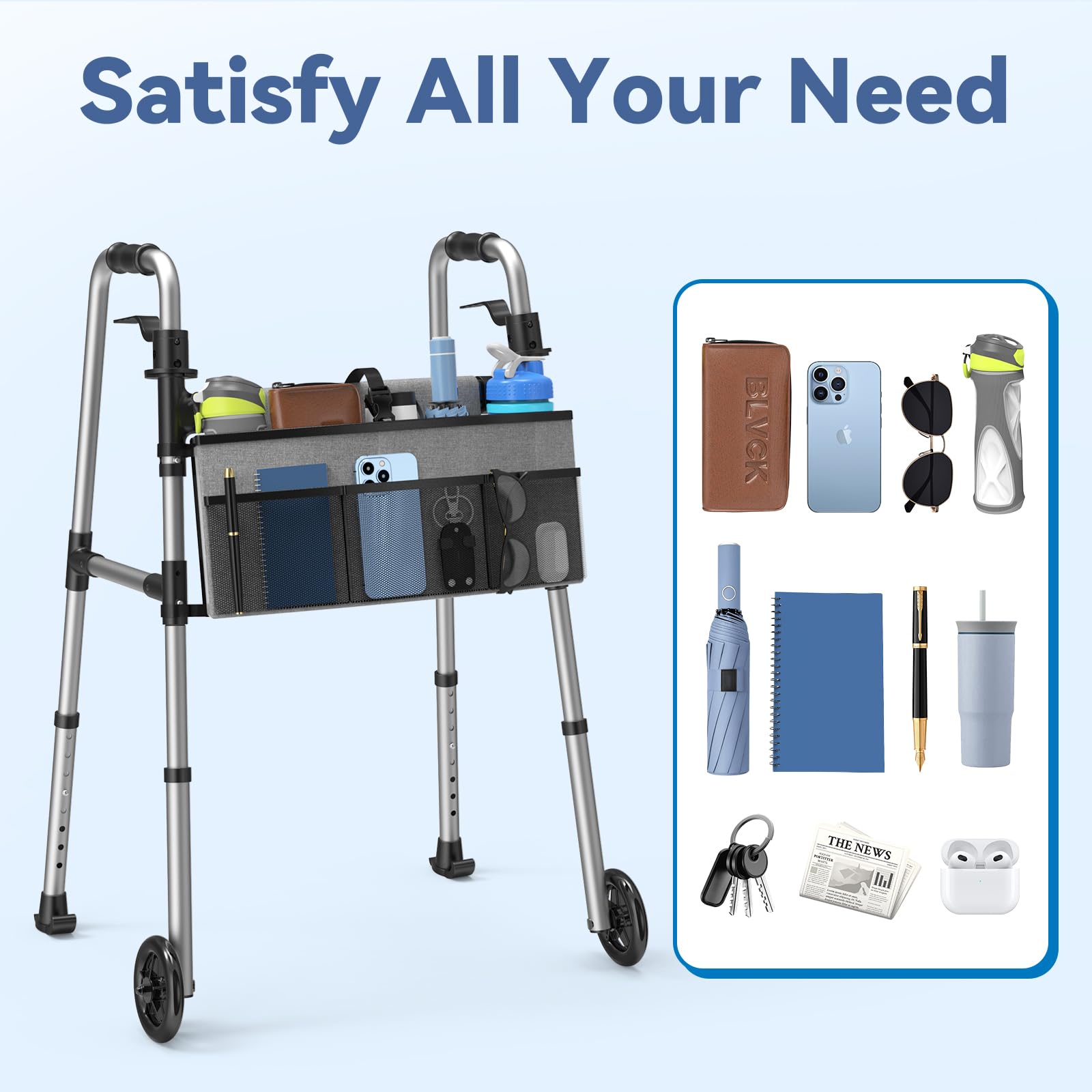 Keeps Your Hands Free: The walker basket features a spacious compartment for essentials like a purse or medical supplies, plus 3 outer pockets for your phone, glasses, and other devices. The 5" wheels and 2 skis ensure smooth movement on different surfaces