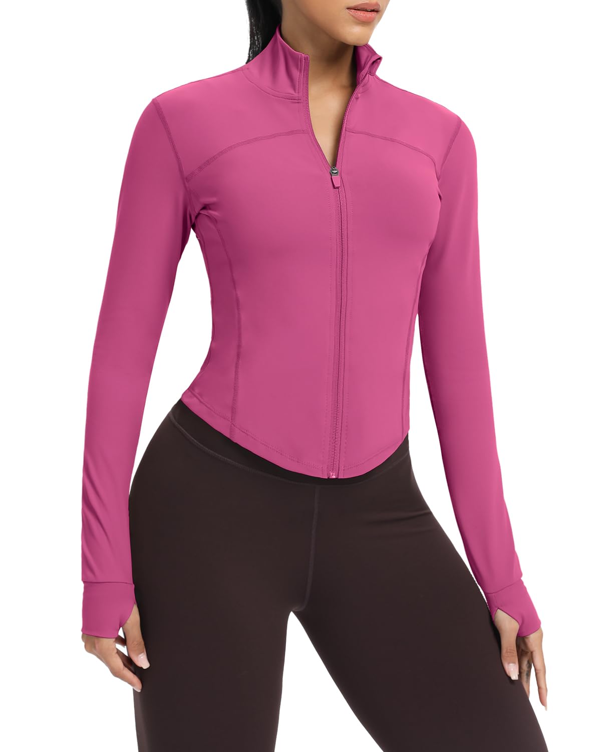 Women‘s Workout Tops - Unique Design: The sports jacket showcases a sleek, contemporary design, featuring a streamlined back profile and gracefully curved hemline. Its windproof stand collar serves as an effective barrier against gusts, ensuring warmth is maintained throughout outdoor activities. The thoughtful inclusion of thumbholes in the BBL jacket keeps the sleeves securely in place. The sewing process ensures exceptional resilience against thread breakage and the formation of holes