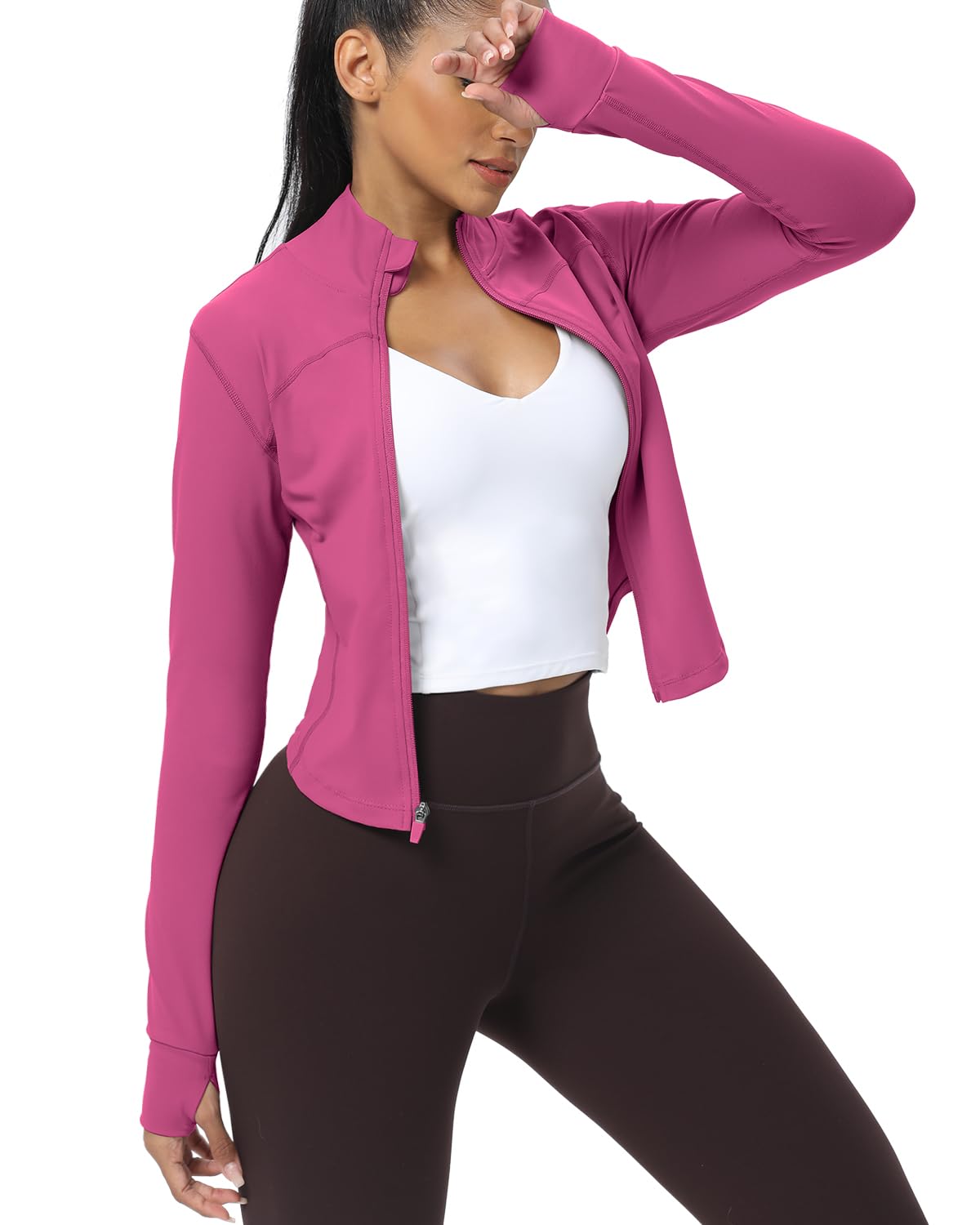 Workout Tops for Women - Zip details: A full-length zipper design simplifies both donning and doffing the garment, while an integrated zip garage ingeniously prevents any discomfort caused by contact between the zipper and the wearer's chin. Furthermore, the meticulous choice of a zipper hue that seamlessly matches the cropped workout jacket's color enhances its overall aesthetic appeal