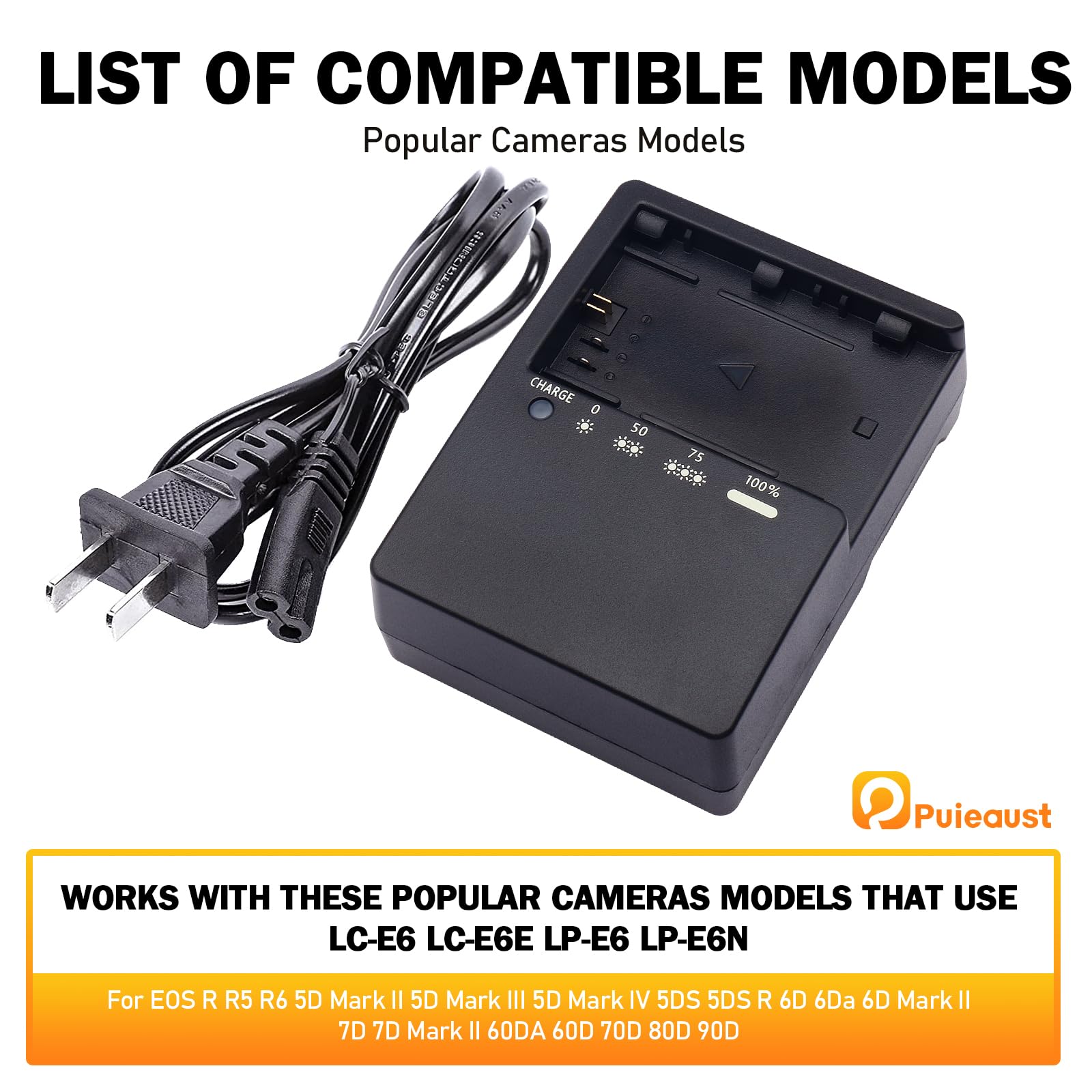 COMPATIBLE MODELS: The LP-E6 battery charger compatible with Canon battery EOS 90D 80D 70D 60D 60DA 7D Mark II 7D 6D Mark II 6D 5D Mark IV 5D Mark III 5D Mark II 5Ds 5DSR EOS R5 R5 C R6 R6 MarkII R7 digital SLR cameras and more. Keep your camera powered up with the LP-E6 replacement charger, a reliable and convenient perfect solution for Canon camera enthusiasts who are always on the go. Reminder: Please check compatibility before purchasing