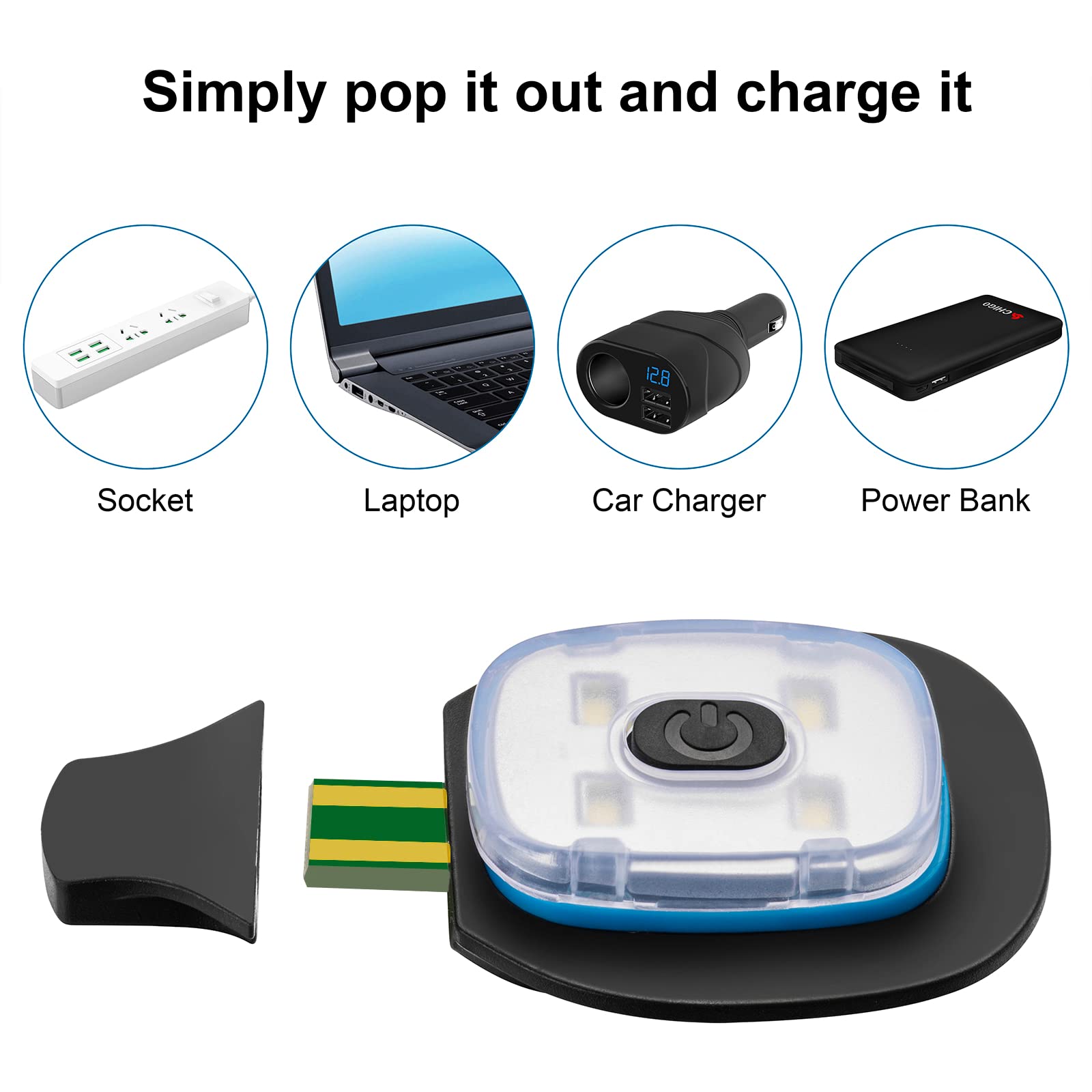 Super Powerful--The LED lighte inserted into the light hat contains four (4) bulbs and is easily removable.With three (3) adjustable brightness settings. Offer a standard USB port for charging battery,You can charge it in car charger, computer or portable power bank.