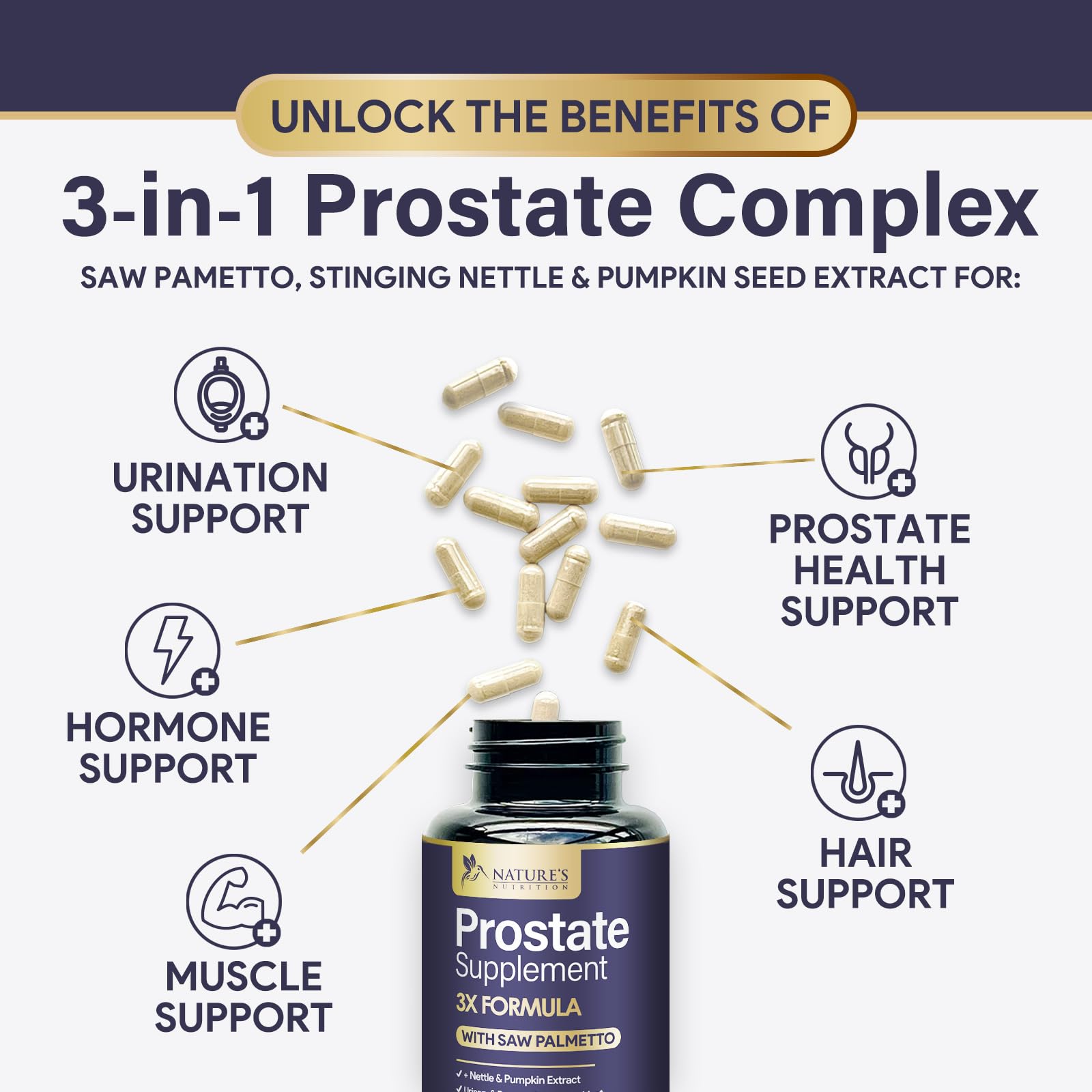 Advanced Prostate Support Formula for Men: Our prostate health supplements for men are made with a powerful 3x support complex, combining Saw Palmetto Blend, Stinging Nettle Root, and Pumpkin Seed Extract to support discomfort and long term prostate health