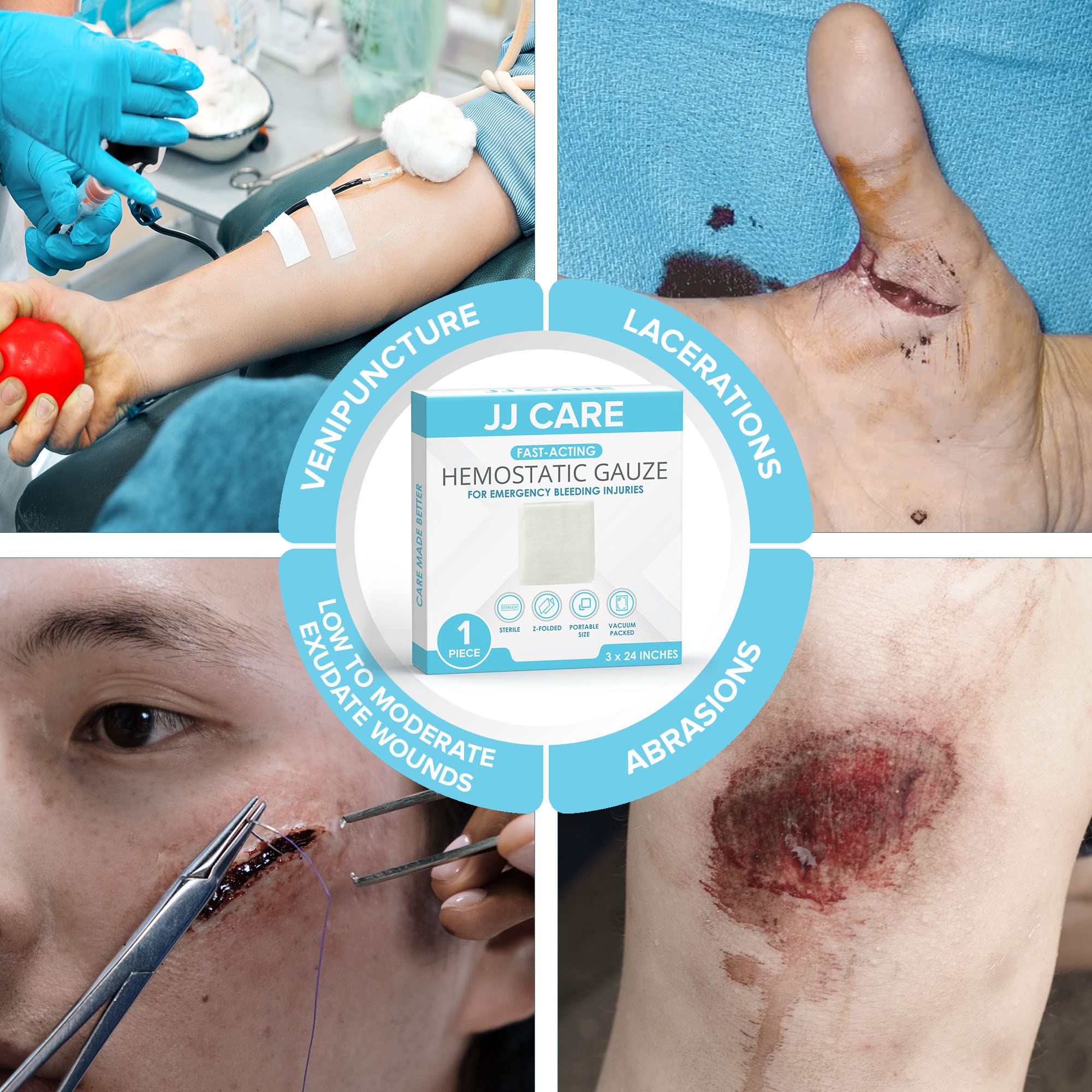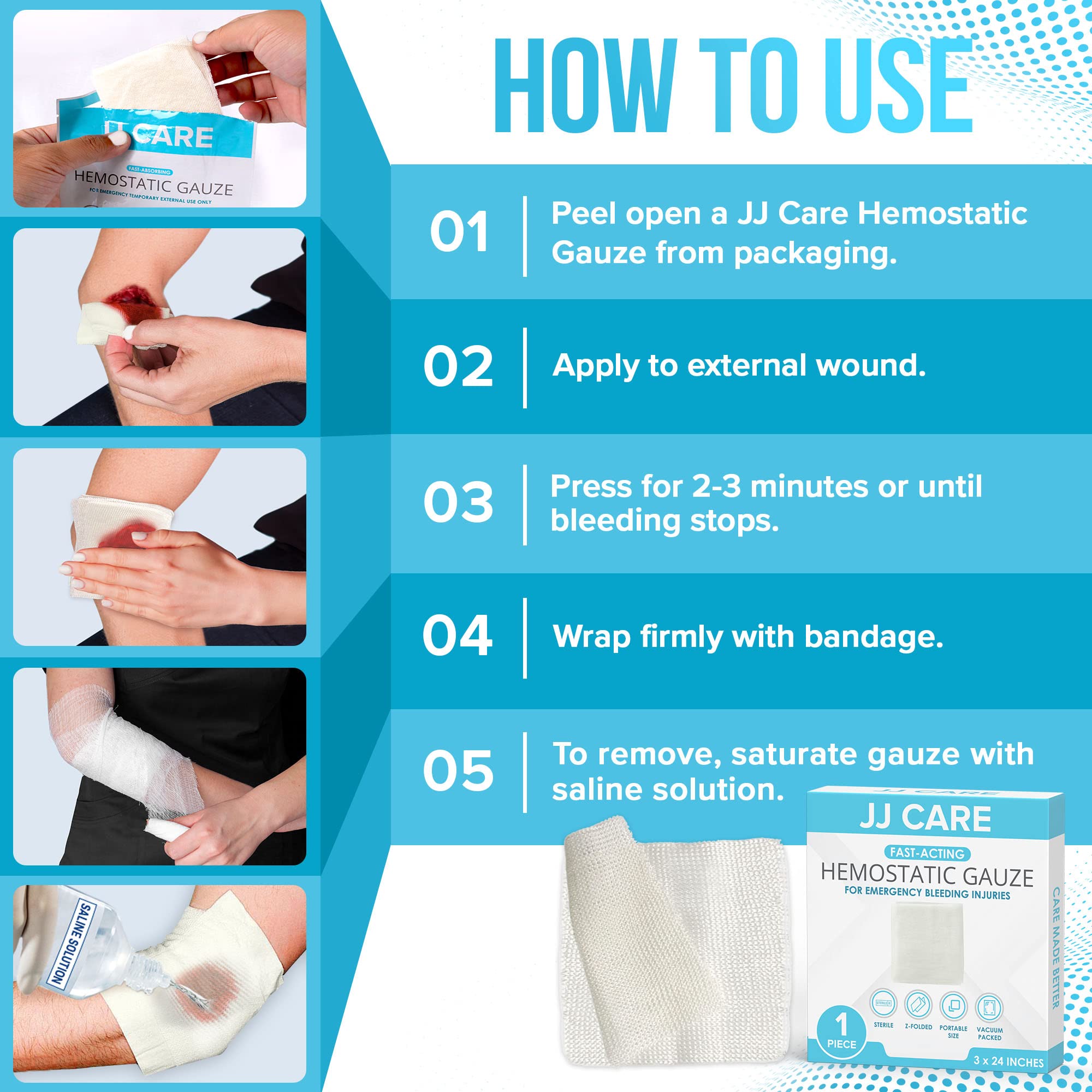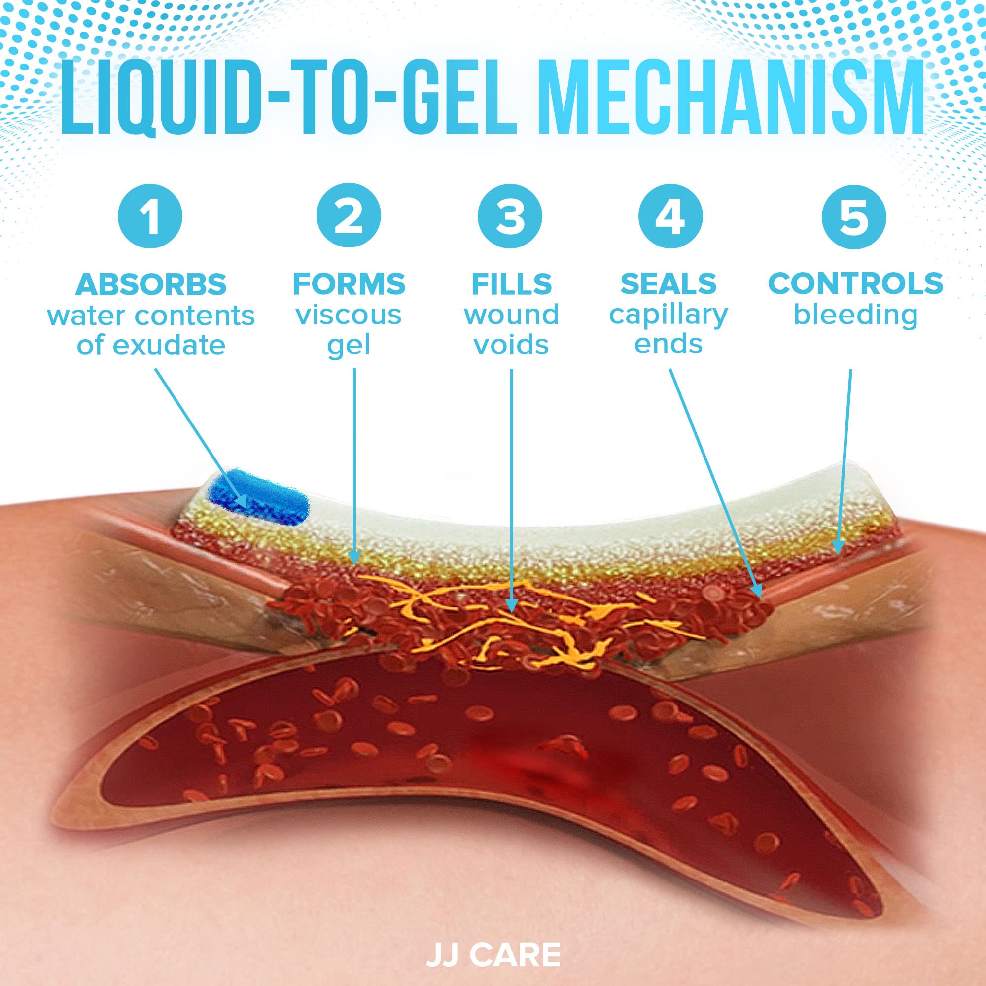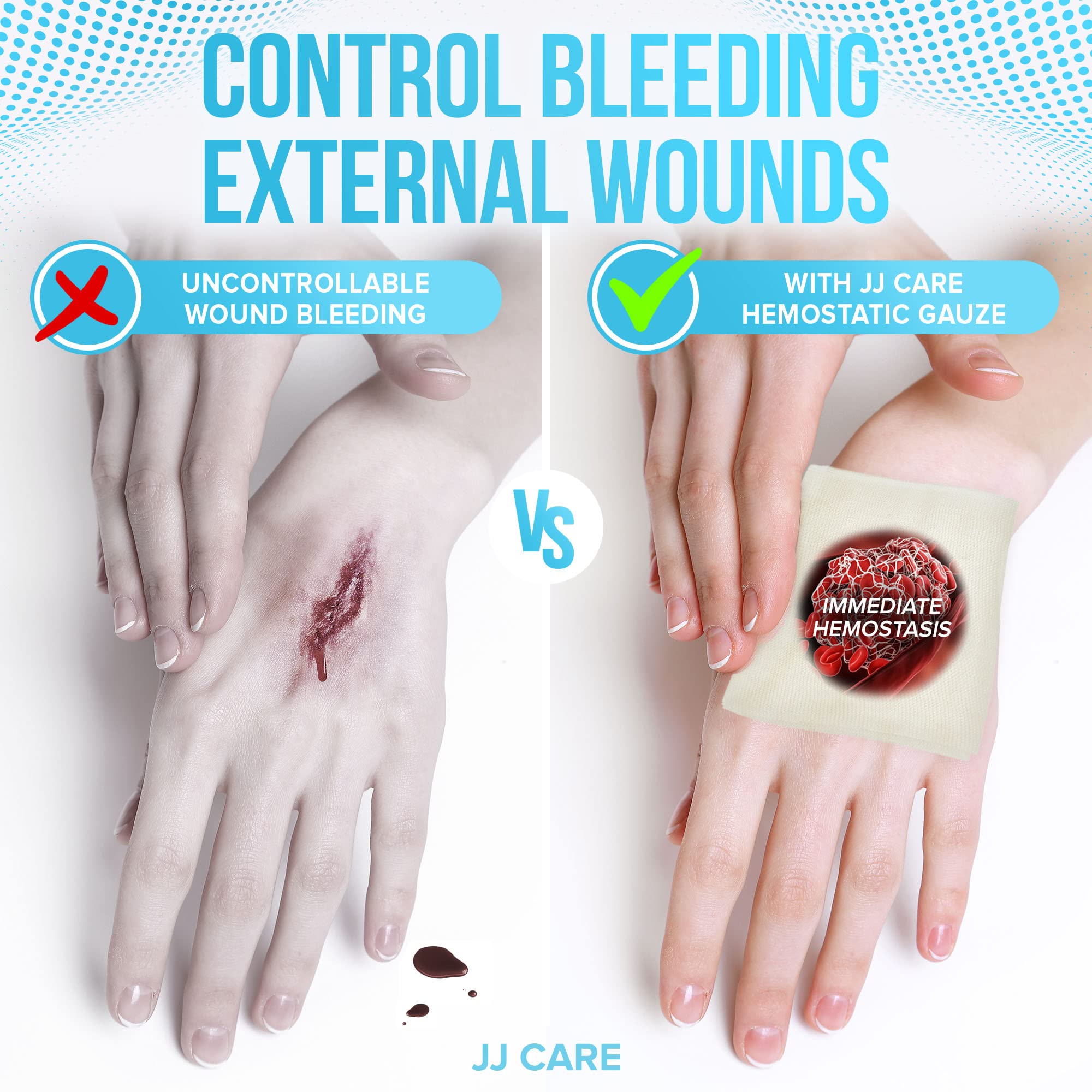 ✅ HOW DOES IT WORK? – Every JJ CARE knitted hemostatic gauze is made with sodium carboxymethyl cellulose. This professional-grade gauze creates a liquid-to-gel mechanism in the wound. First, it absorbs water contents of the wound exudate to form a viscous gel. This gel will fill wound voids that will seal capillary ends to help control the bleeding.