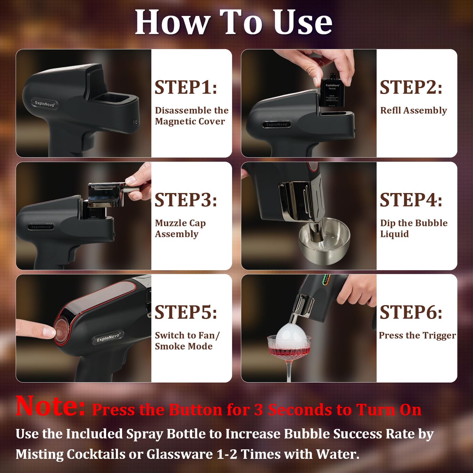 Effortless to Use - This aroma blaster 2 cocktail smoke bubble machine is perfect for use anytime, anywhere—whether on bar counters, at outdoor events, or during home gatherings. Easily create impressive smoked cocktails and dishes. For better bubble effect, lightly spray the included mist bottle on the glass rim before use.