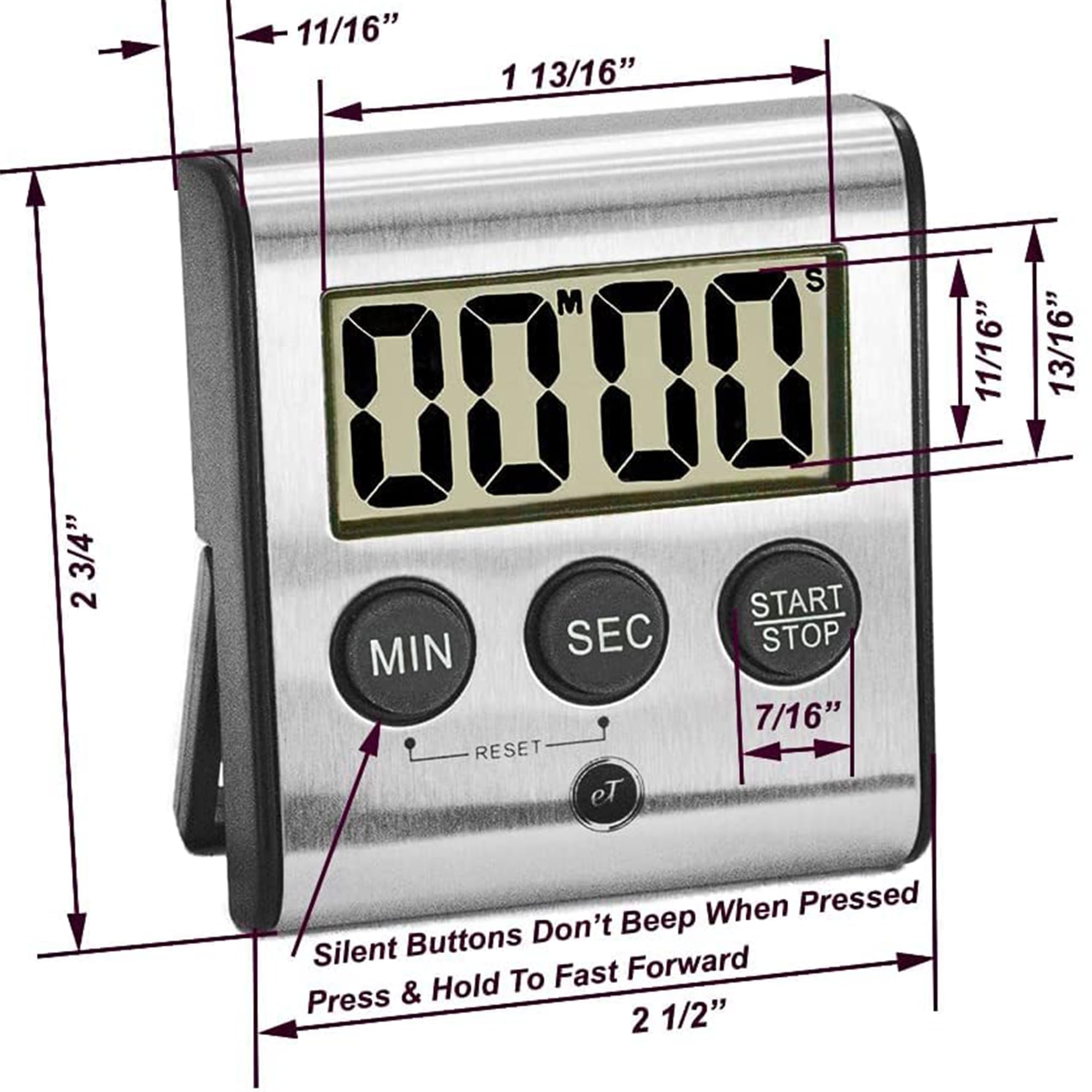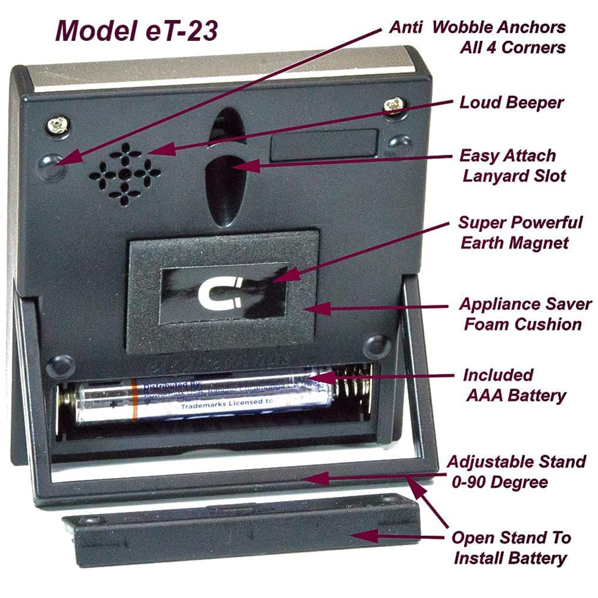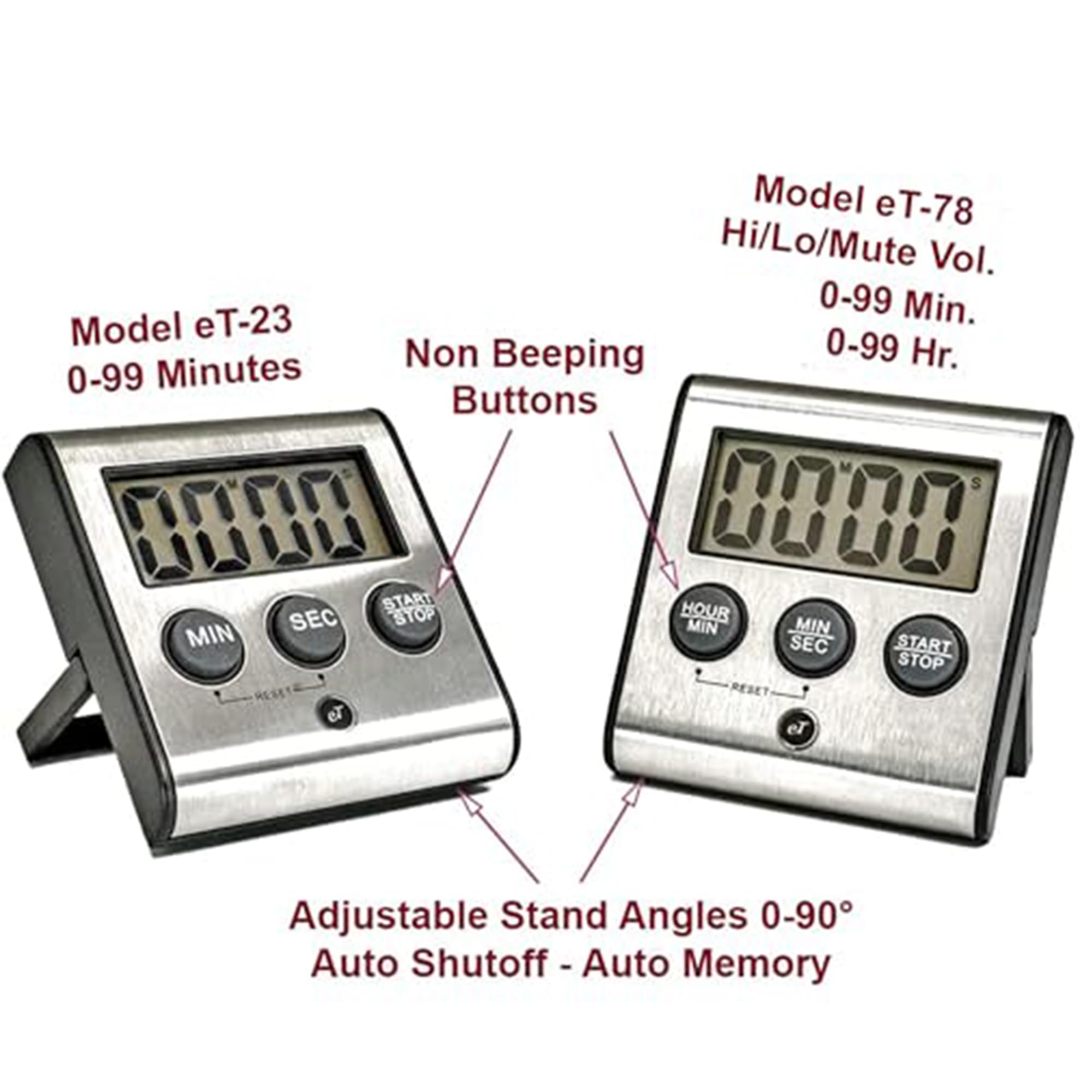 Model eT-23 Timer Strong Magnet: Flat back surface (no pivot points) & upgraded magnet with foam appliance scratch protector. It' won't pop off the fridge with the wobble factor when front buttons are pushed. It sticks and stays stuck. Auto Shut-Off: Convenient built in automatic on/off switch will turn off timer after 2 minutes of being idle. Save on batteries. Auto Memory: Memory recalls last setting used and holds thru auto shutoff. After auto-shutoff, the previous countdown setting is displayed. Perfect for repetitive tasks. Just hit the start button and it will count down exactly like your last setting. Also easy to set if you need different settings each time. Multiple Applications: Favorite timer for kitchens, salons, homework, taking medication, barbecue, workout, sports, competitions meetings, medical/dental exam rooms, yoga, meditation. One finger operation: No need to hold this timer in your hand when setting or stopping which is a requirement in most economy minded timers. Unconditional Lifetime Guarantee: If it fails to function properly we will replace it free and pay for shipping. ✔ Counts Up or Down 0-99 Minutes and Seconds ✔ Hold Min and Sec simultaneously to clear back to 0000 ✔ Hold buttons down 2 sec. for fast forward digit advance ✔ Auto Memory holds time setting through Auto Shut Off ✔ Large Display can easily be seen across the room ✔ Loud 75-80db mellow beeping easily heard in next room ✔ (1) AAA Required Battery and Instruction manual included