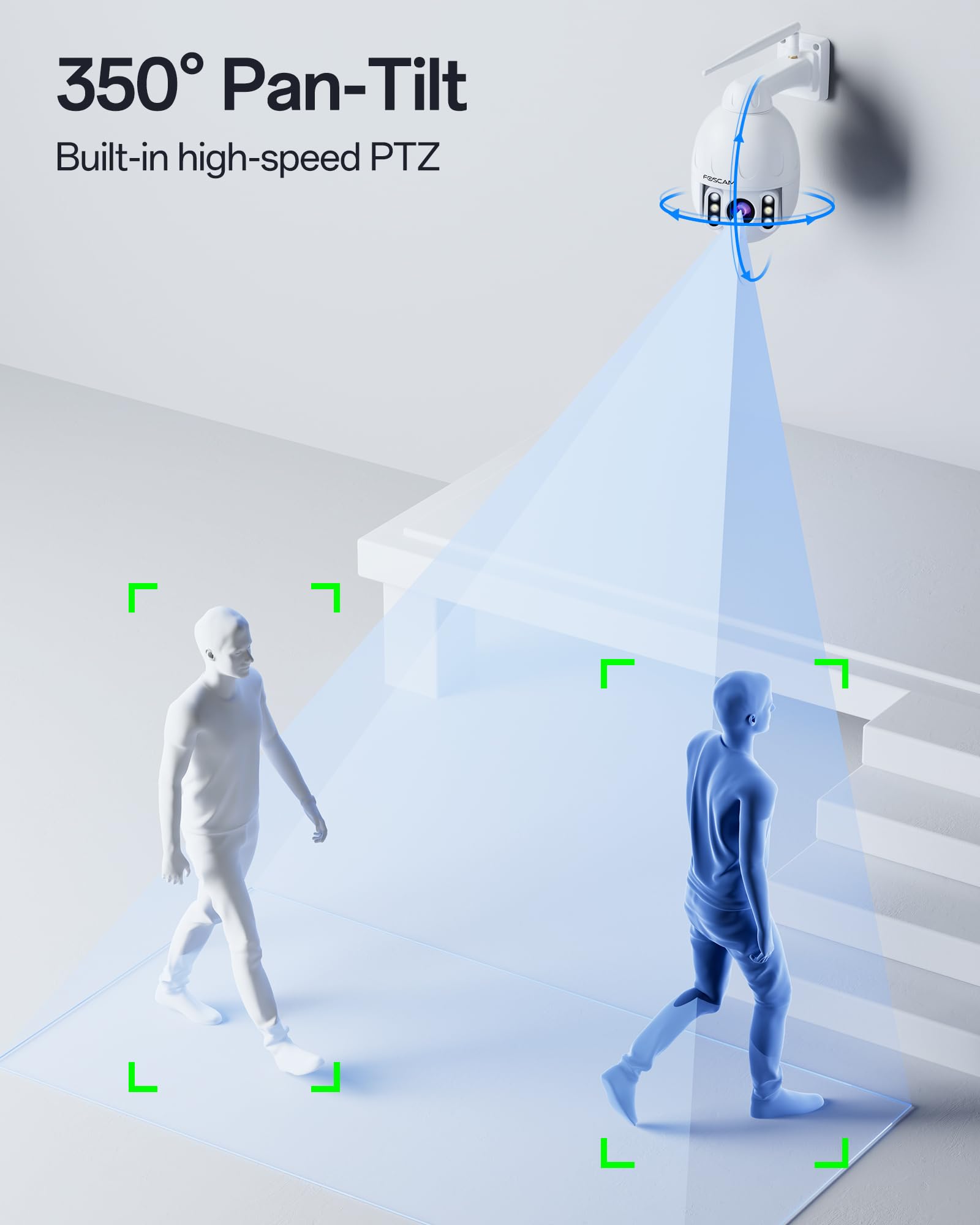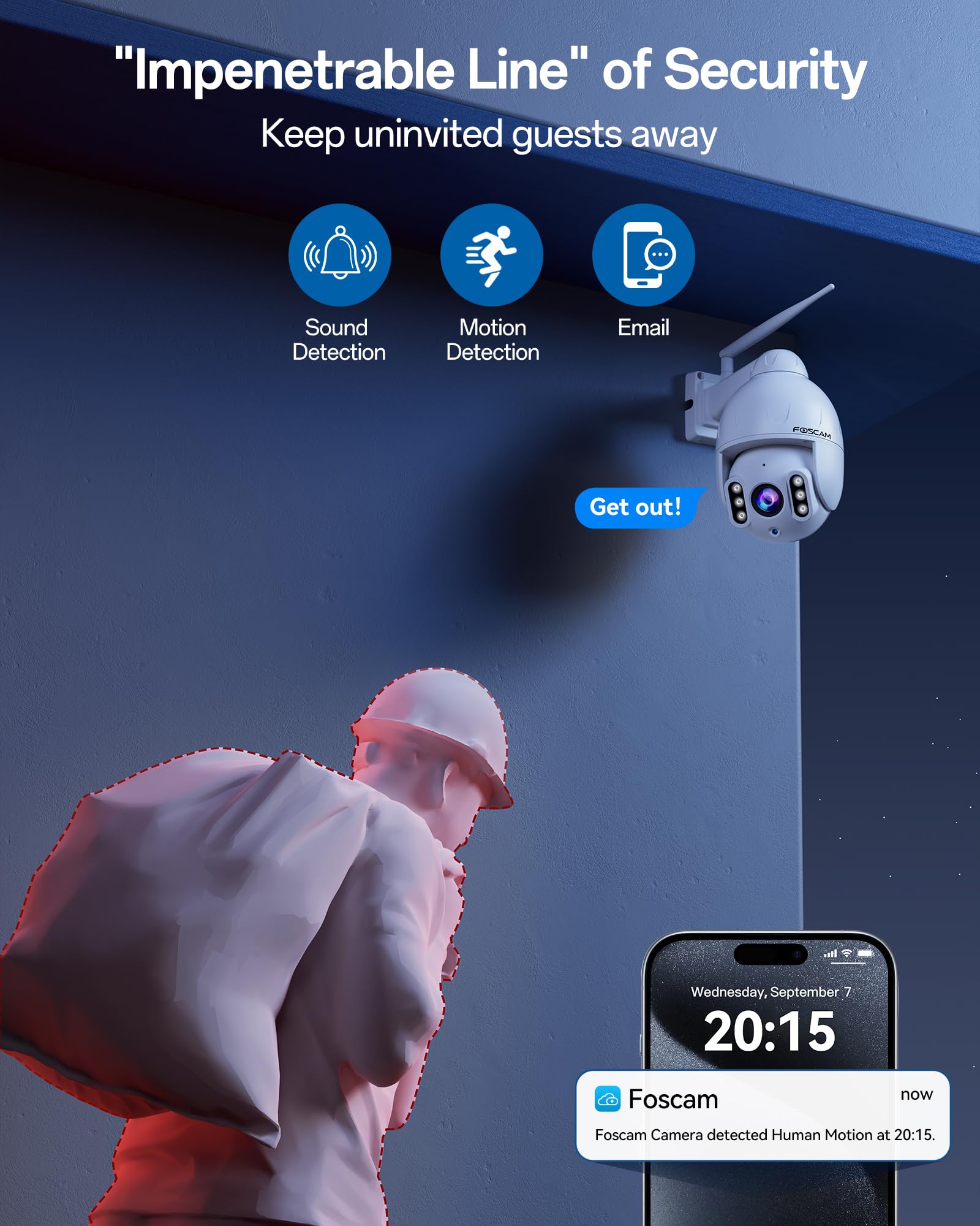 【AI Human/Car Detection & Instant Alerts】A Motion Detection Camera with advanced AI distinguishes humans, vehicles, pets, and packages, minimizing false alarms from wind or shadows. Triggers siren + blinding spotlight to scare off threats instantly upon Motion & Sound detection. Receive real-time alerts via app/email/FTP—ideal surveillance & security cameras for stores, construction sites, or vacation homes.