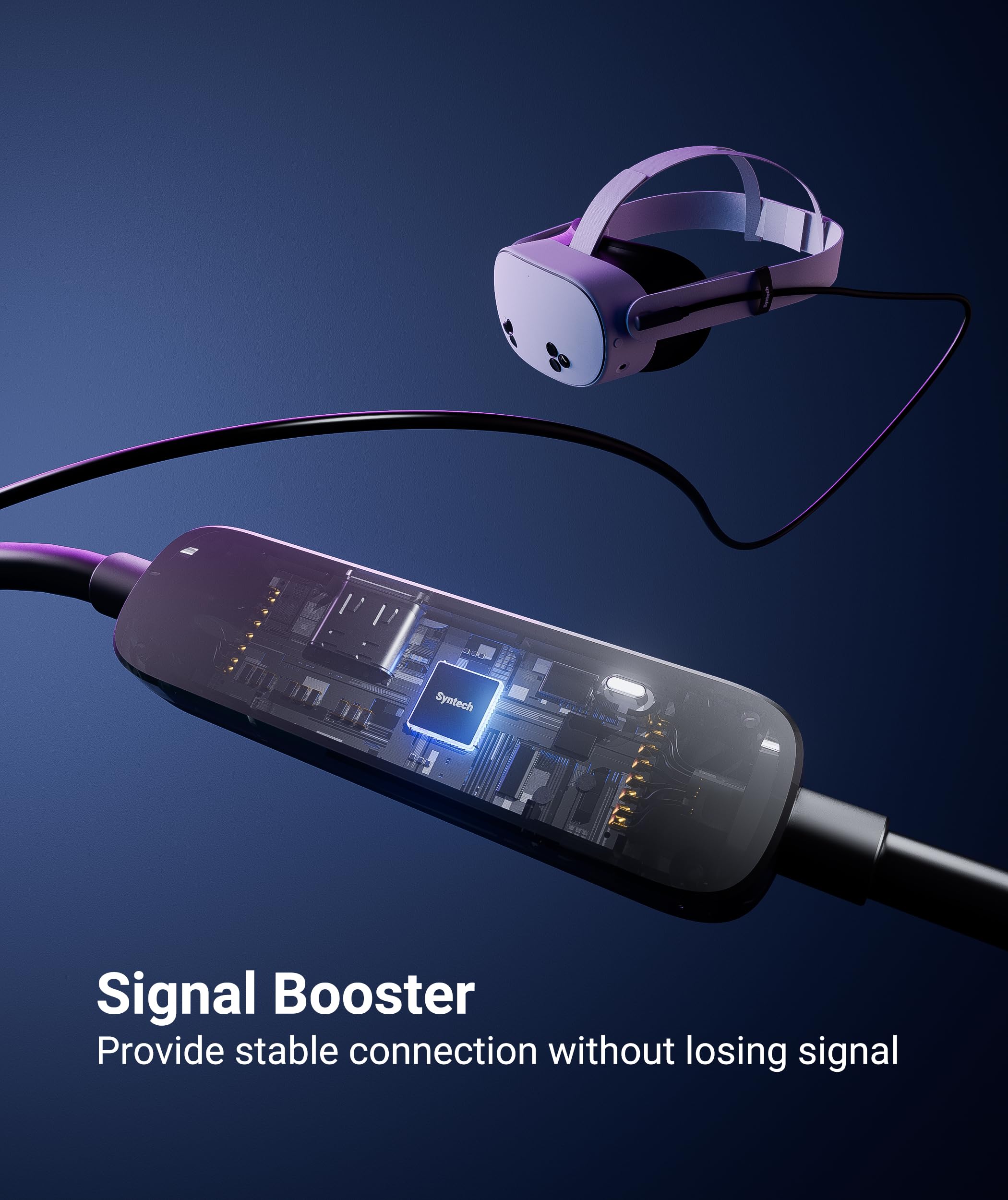 Upgraded Link Cable: The Syntech VR cable 26FT is thoughtfully designed with a built-in signal booster. This innovative feature effectively minimizes signal loss and avoids attenuation during long-distance data transfer, ensuring an uninterrupted and seamless gaming experience. This cable ensures a seamless and dependable connection between your VR device and computer, providing effortless PC connectivity.