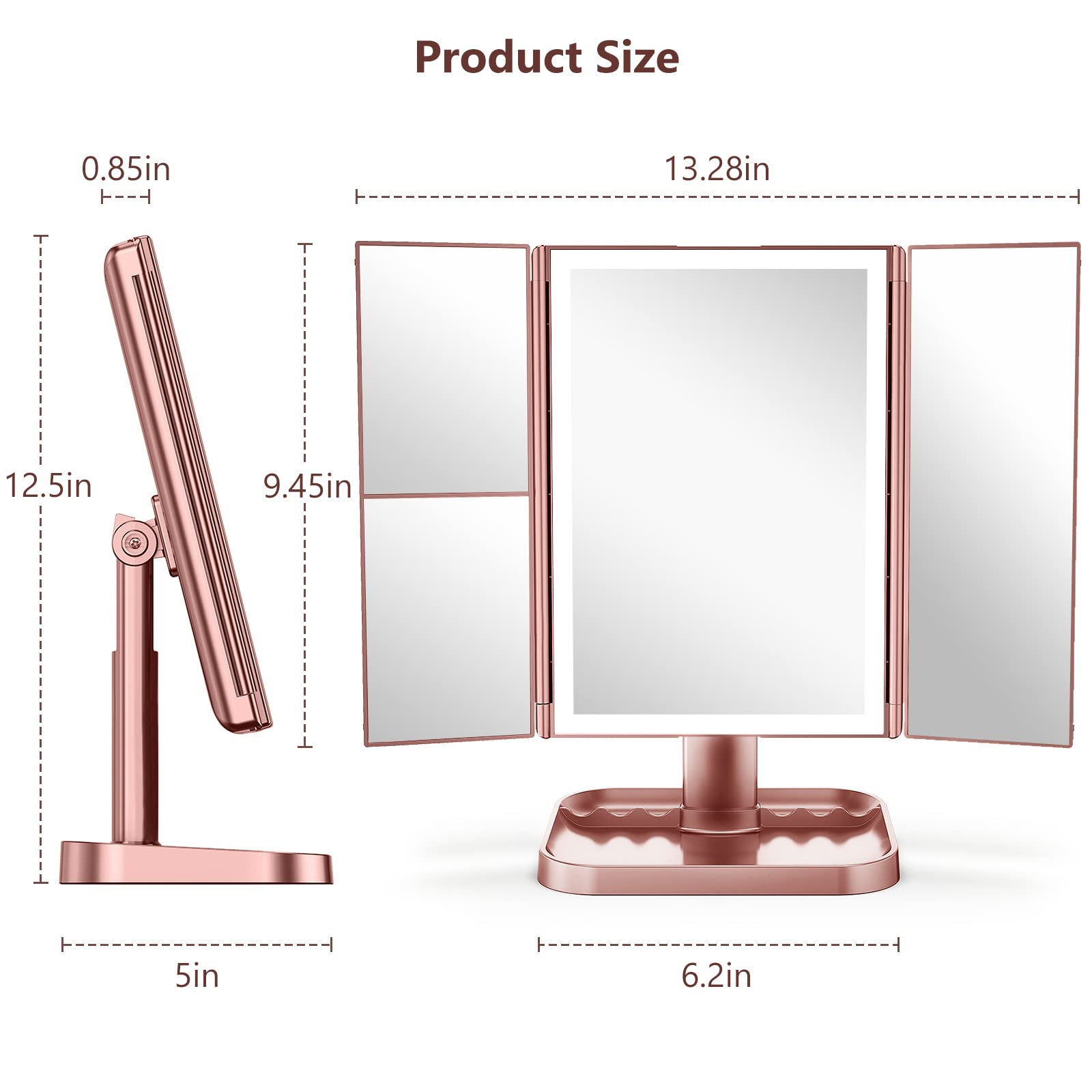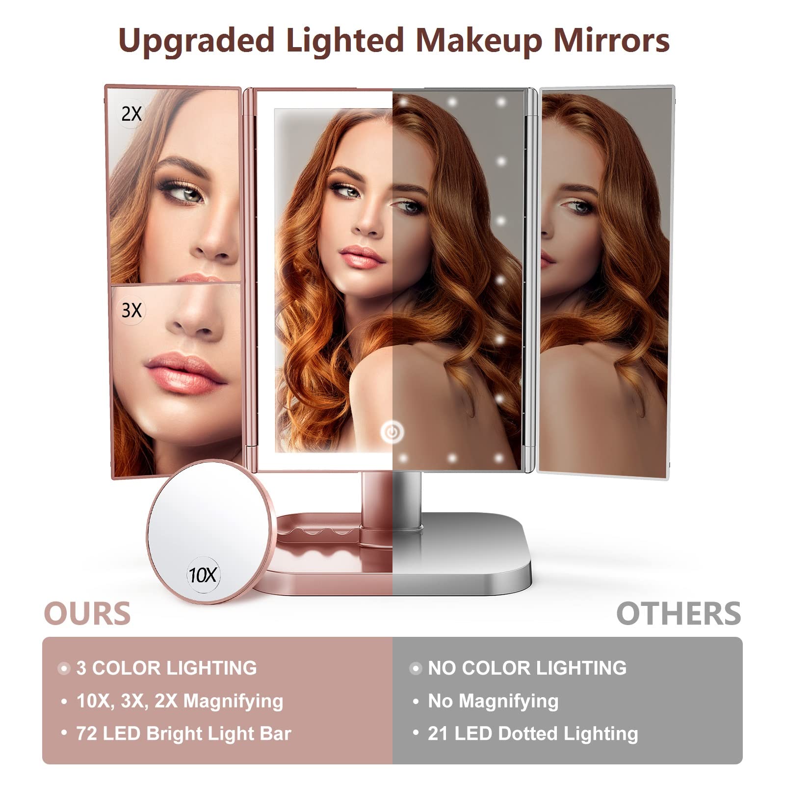 3 color lighting and adjustable brightness; this makeup mirror has 3 color lighting, cold, warm, and natural light, providing 3 light scene; Press the touch screen switch, changing the color of light; hold the touch switch longer, brightness dim or bright