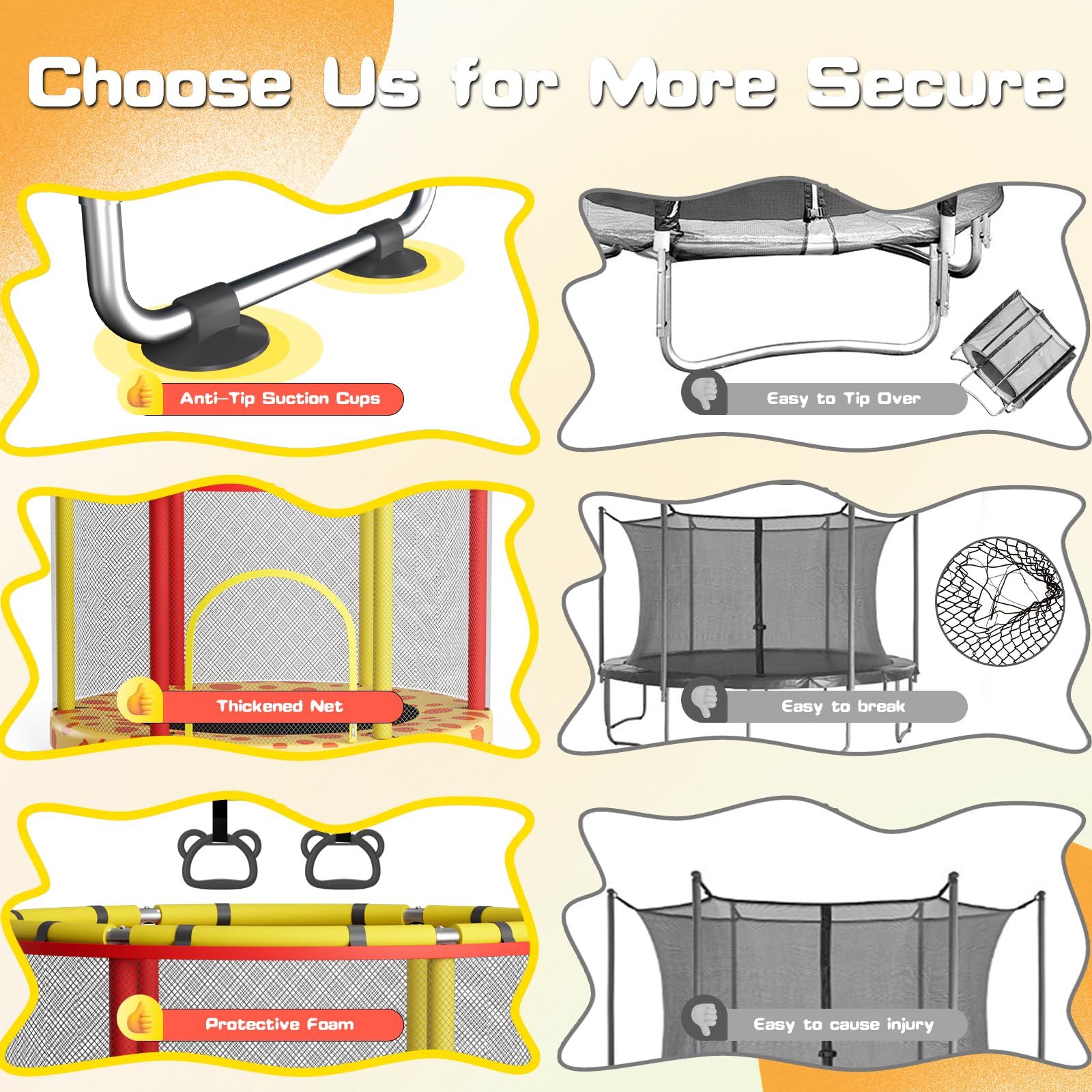 Safe & Sturdy - Indoor trampoline for kids is built to last, with a thickened steel frame, 3 U-shaped legs with non-slip suction pads, and a 360° wrap-around safety pad. Plus, with dense safety netting and upgraded foam, it's a robust and secure space for your little ones to bounce and play.