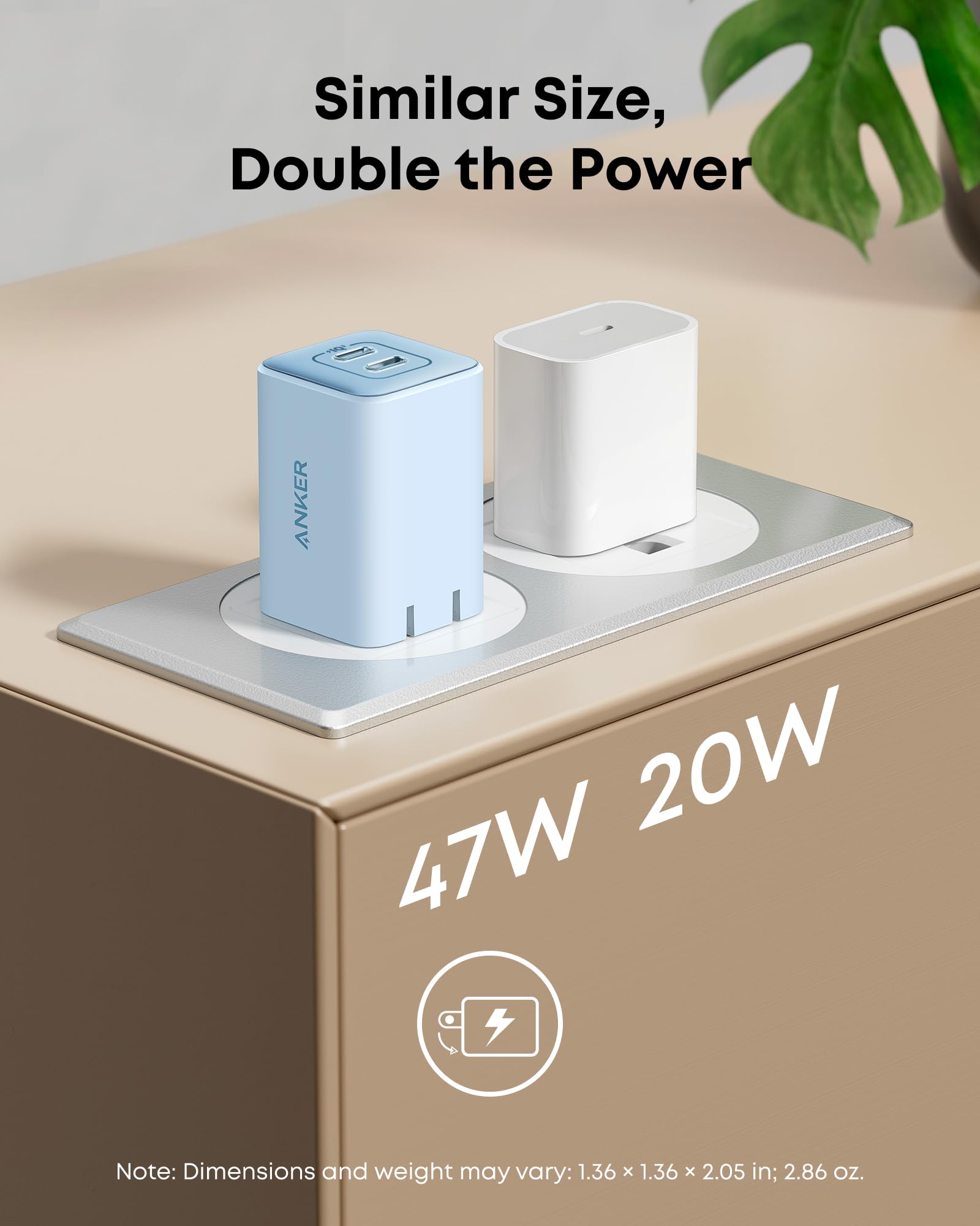 Small Yet Powerful: Get 47W of power and charge 2 devices from a charger that's roughly the same size as an original 20W charger.