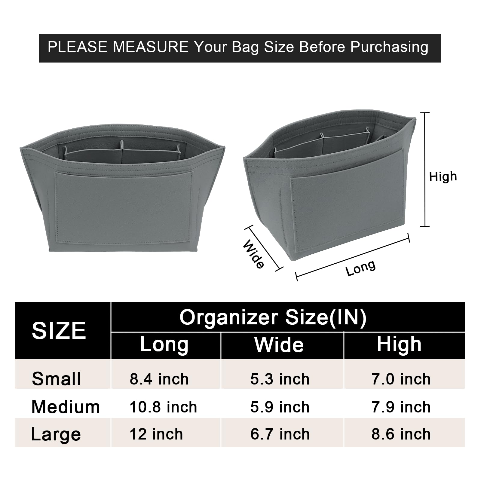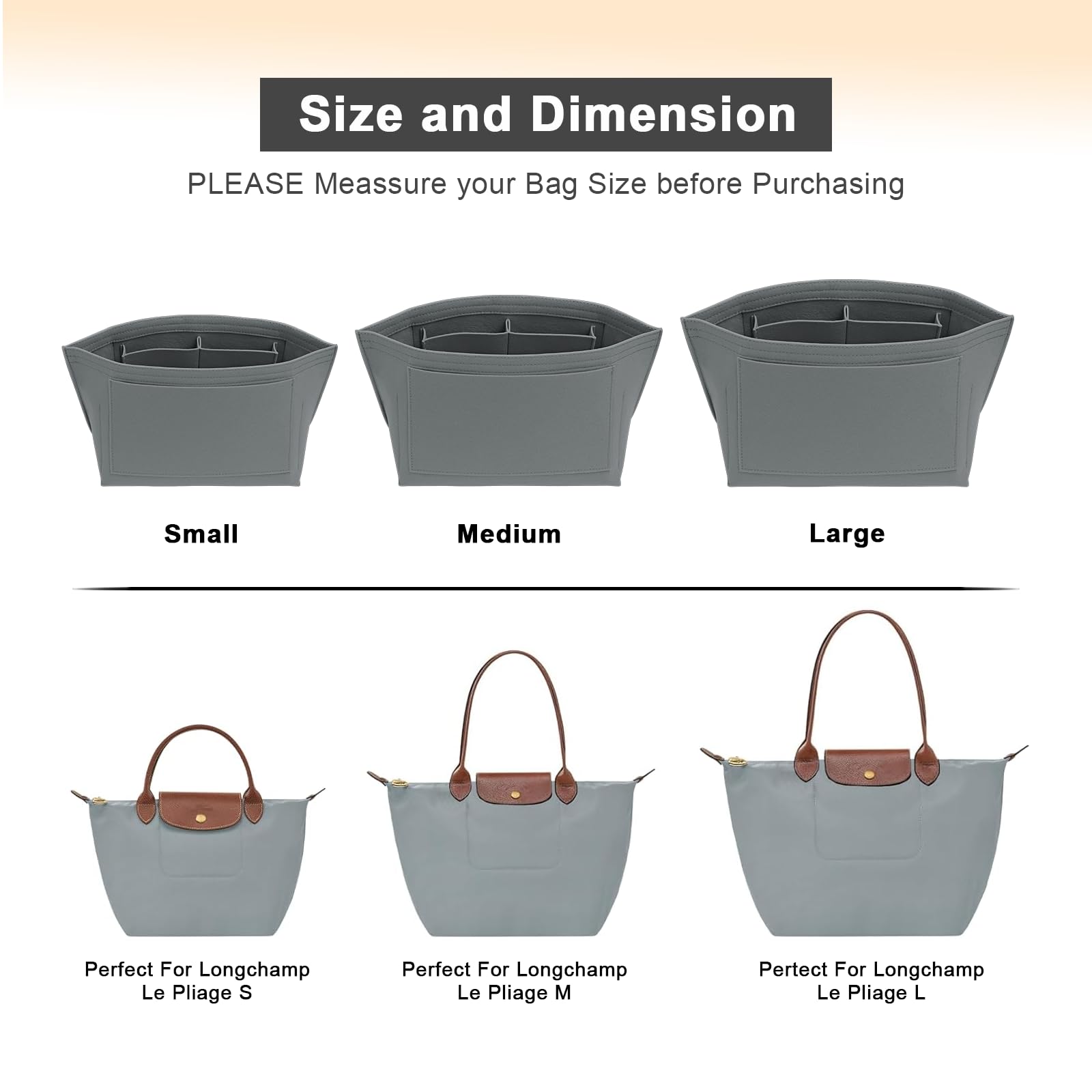 SIZE OF THE FELT PURSE ORGANINZER INSERT - Large: 12.00"(L)*6.7"(W)*8.6" (H) , suitable for Large Size of long handle of Le pliage handbag, or similar size Tote Handbag,It will be more suitable if it is LESS than 0.5-1 inches to ensure a perfect fit,Please comfirm your bag size before purchasing again, thanks.