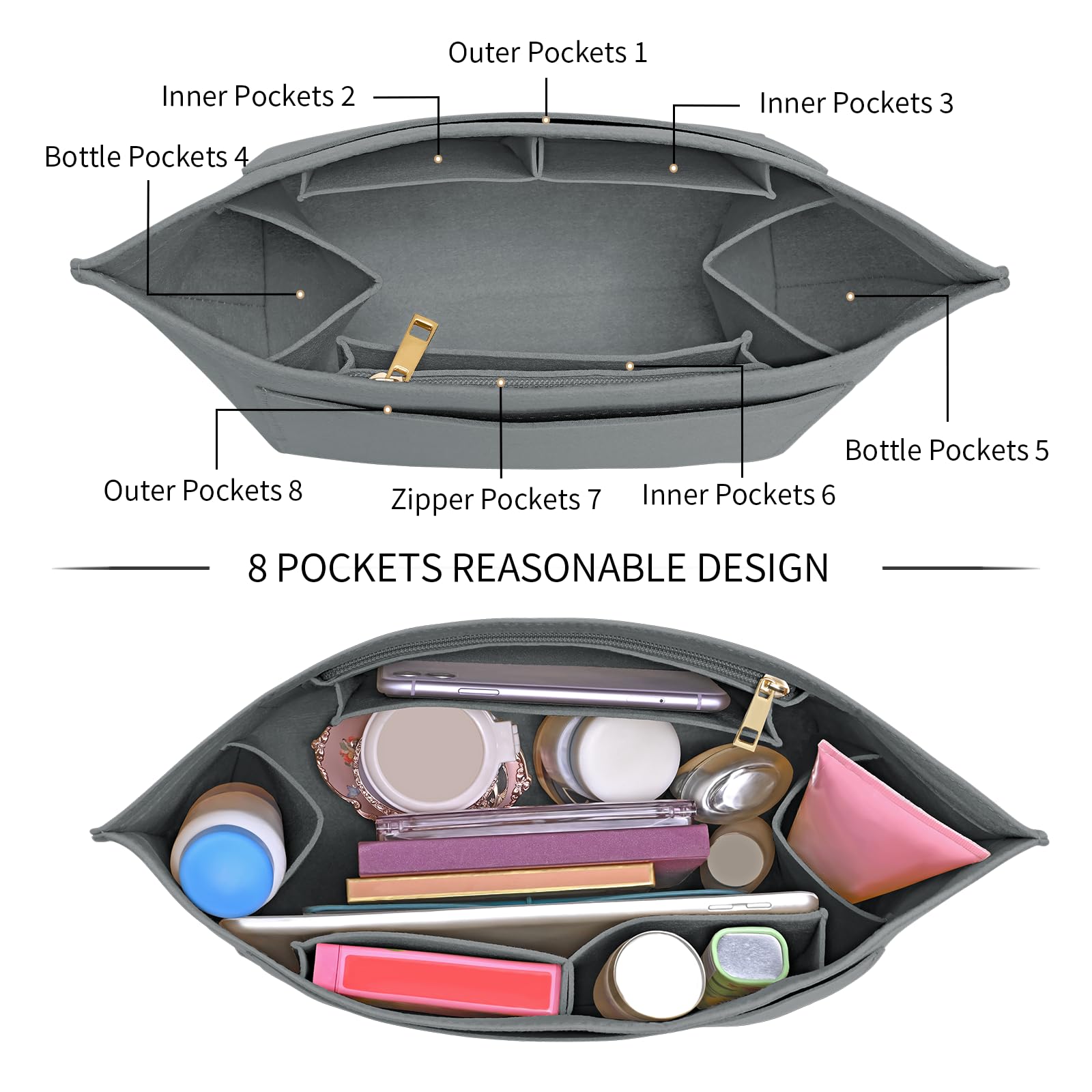 NEW design: There are 8 compartments, two of which are external pockets for large items, and the remaining 5 pockets, two double side pockets (for mugs and various small items, solving the problem of insufficient pockets) and one zipper pocket (with high-quality metal zipper head for durability), allow you to store your cell phone, wallet, cosmetics, glasses, and other personal belongings in the wallet organizer, making it easy to change bags throughout the day without rearranging. and no need to reorganize.