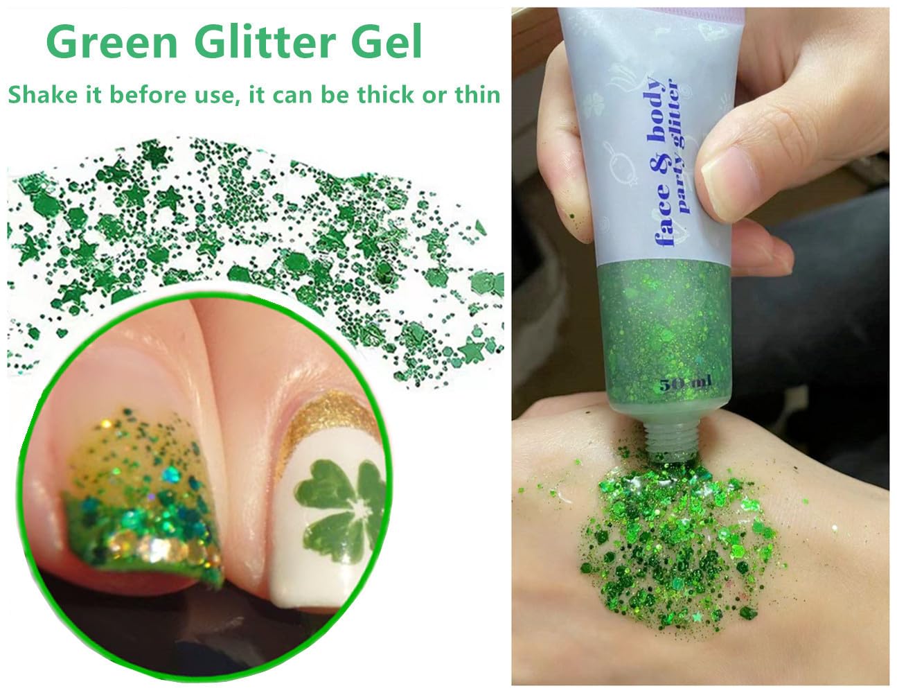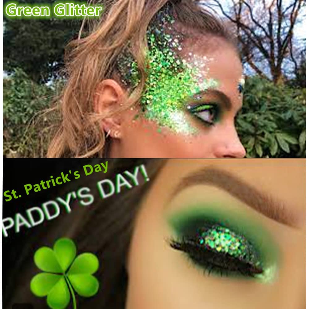 Mardi Gras/St Patricks Day Accessories Glitter Makeup Wildly Use:This cosmetic chunky and fine glitters can be used to either complement your makeup look or just add some sparkle to other parts of your face and body.Great for face, body, eyeshadow, lips, cheeks, hair, nail art, and more.Great accessories for Singer Concerts,Music Festival,Rave,music festivals, weddings, parties, parades, football tailgates, and on stages around the world.