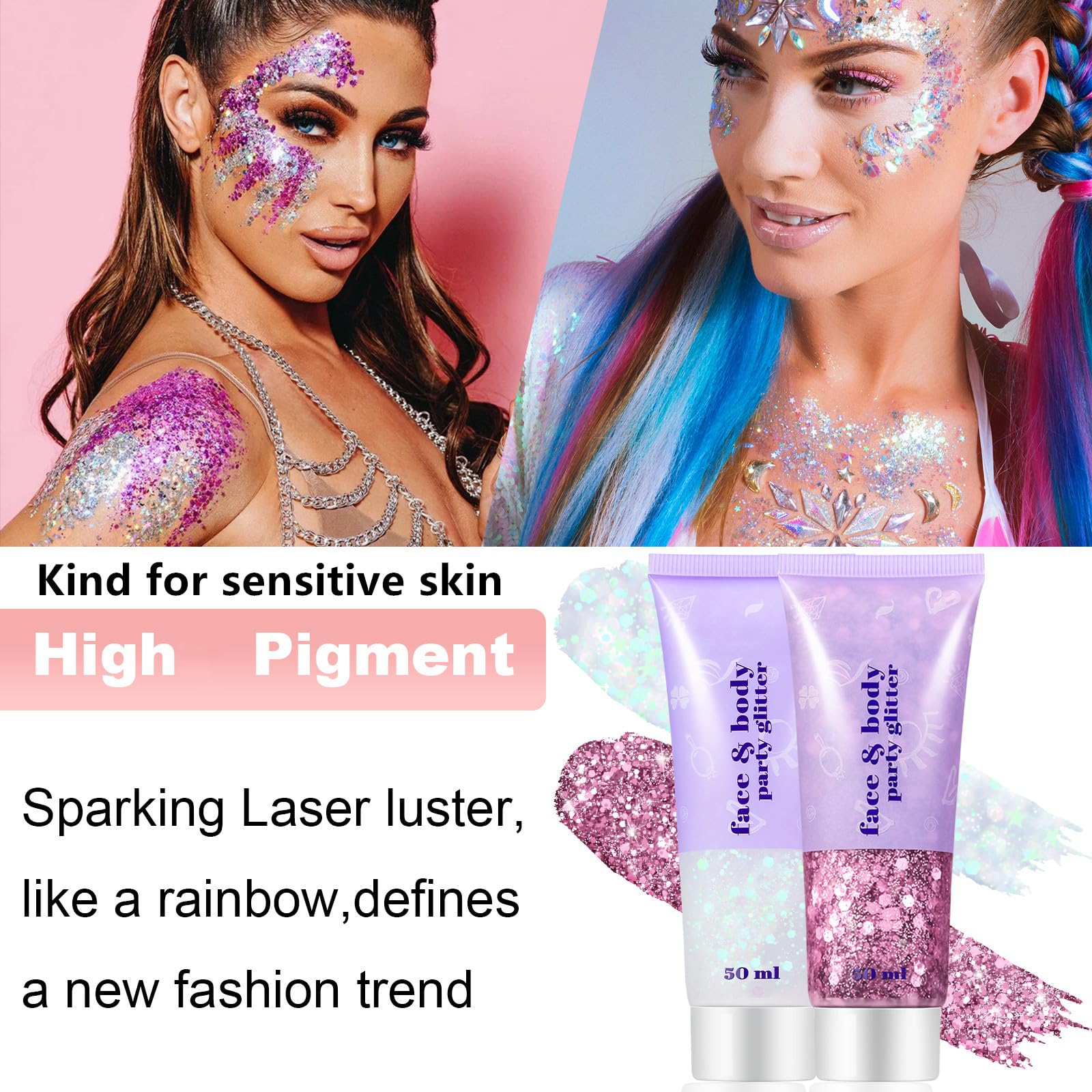 Easy-on,easy-off:Has a stick adhesive,goes on smoothly with a quick swipe of a finger or brush after easy squeezing out.Can be applied over face paint designs or body shimmer without smearing them.For ultimate glitter effect apply in layers letting each layer dry before applying the next.Easily remove with soap and water.