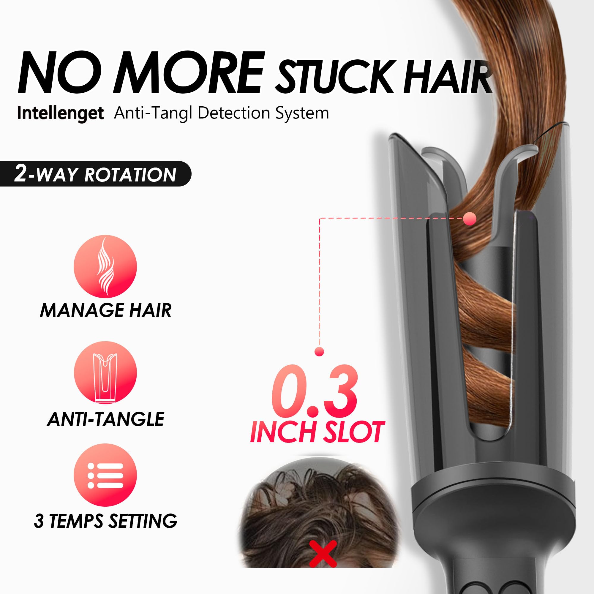 【Unique 0.3 inch Slot Anti-Tangle】 The unique 0.3-inch slot and hair guide of the automatic curling iron ensure that the hair adheres closely to the tube without tangling, making it very friendly to beginners and providing you with a perfect curling experience