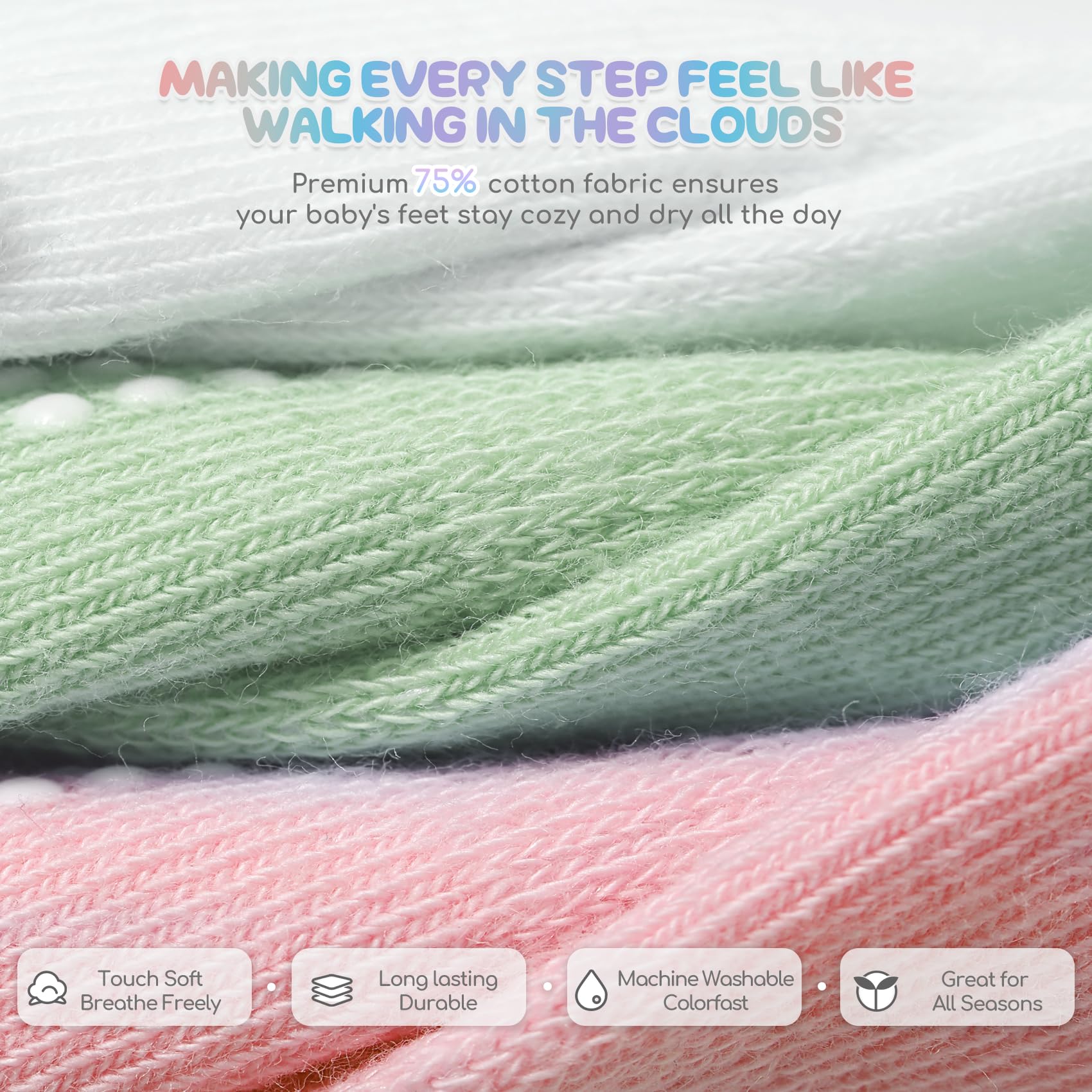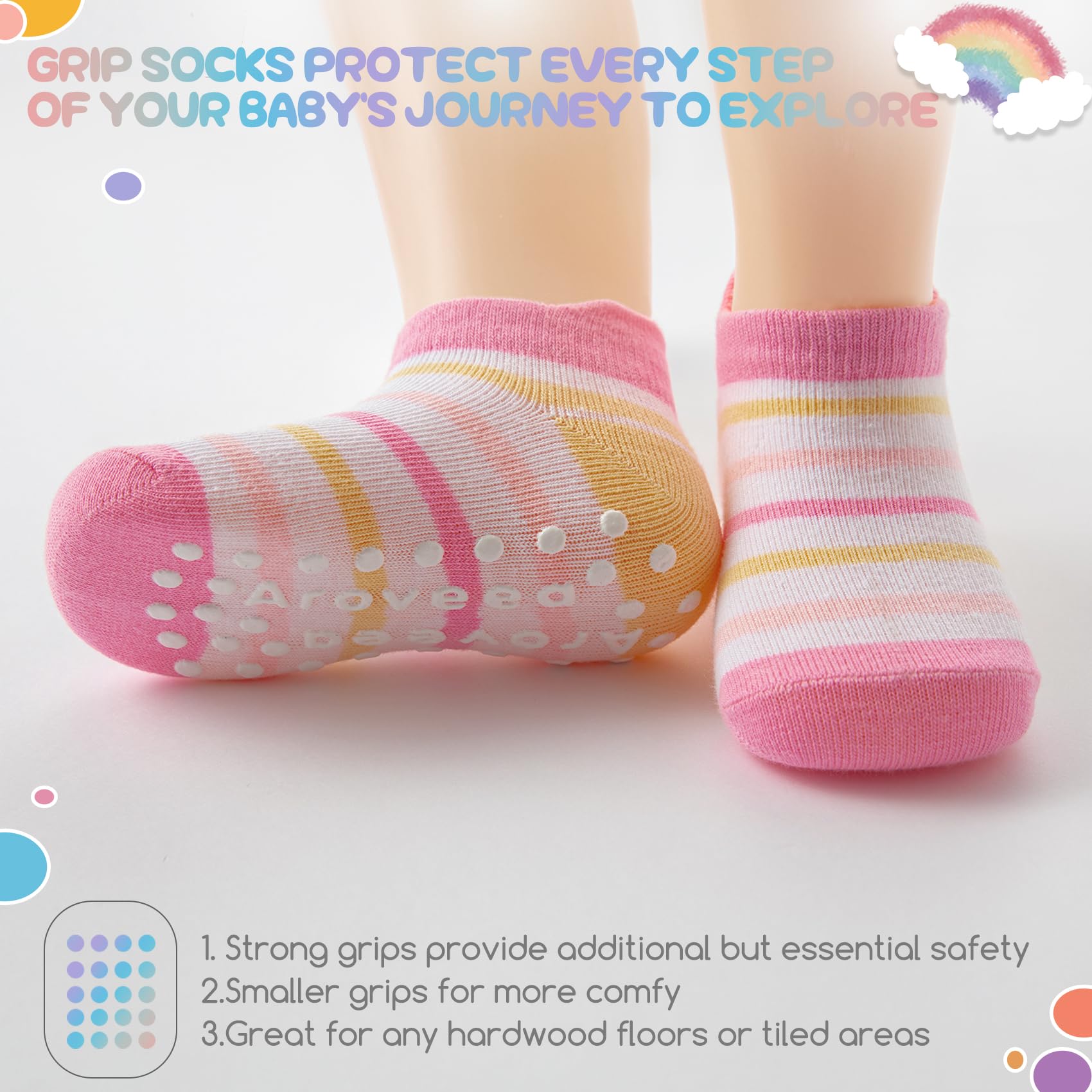 🌈PREMIUM COTTON FABRICS:These socks are made of superior cotton and synthetic fibers, providing a balance between comfort and durability. Elastic and stretchable fabric confirms it won’t slip/fall off while snug fit as baby foot grows.The soft and breathable fabric ensures your kids feet stay cozy and dry throughout the day. The grips on the soles could still maintain their effectiveness even after multiple washes.