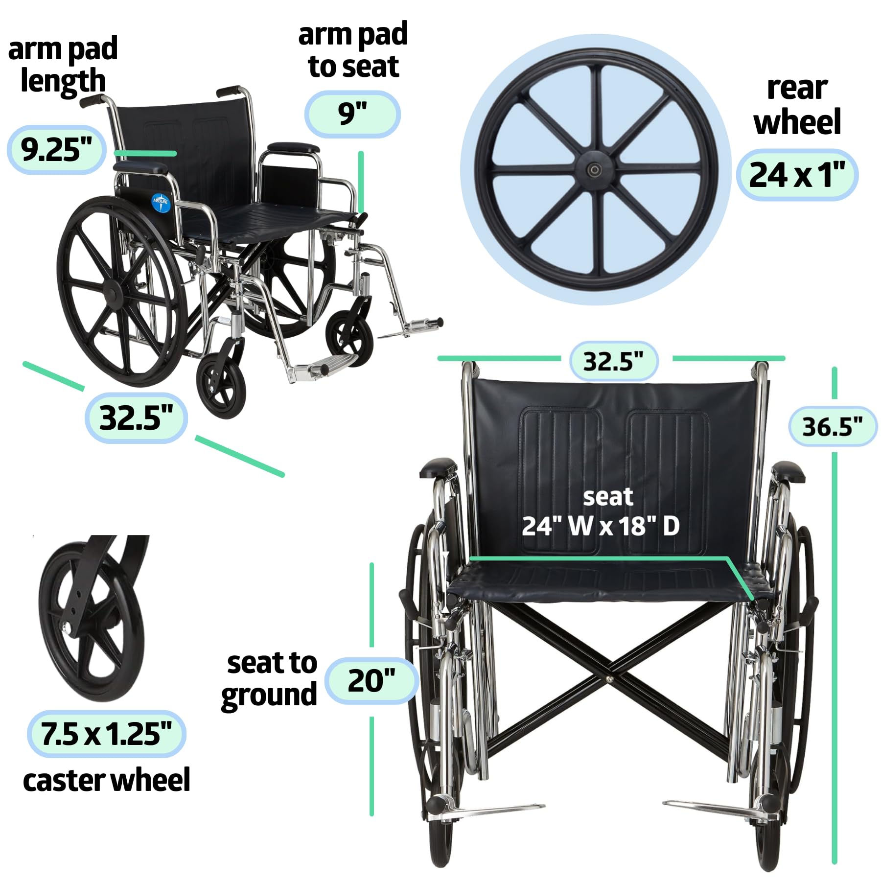 Product Description Medline folding extra wide bariatric wheelchair for adults and seniors features a 24""W x 18""D seat and a carbon steel frame with rust- and chip-resistant chrome plating. Adjustable axles raise and lower the seat 2"", and the comfortable wheelchair also features easy-to-clean vinyl upholstery and tool-free, push-button adjustable footrests. It can support up to 500 lbs. Dimensions: 32.5”L x 32.5”W x 36.5”H (assembled)/32.5”L x 13”W x 36.5”H (folded). Manufacturer Contact Information 800-633-5463
