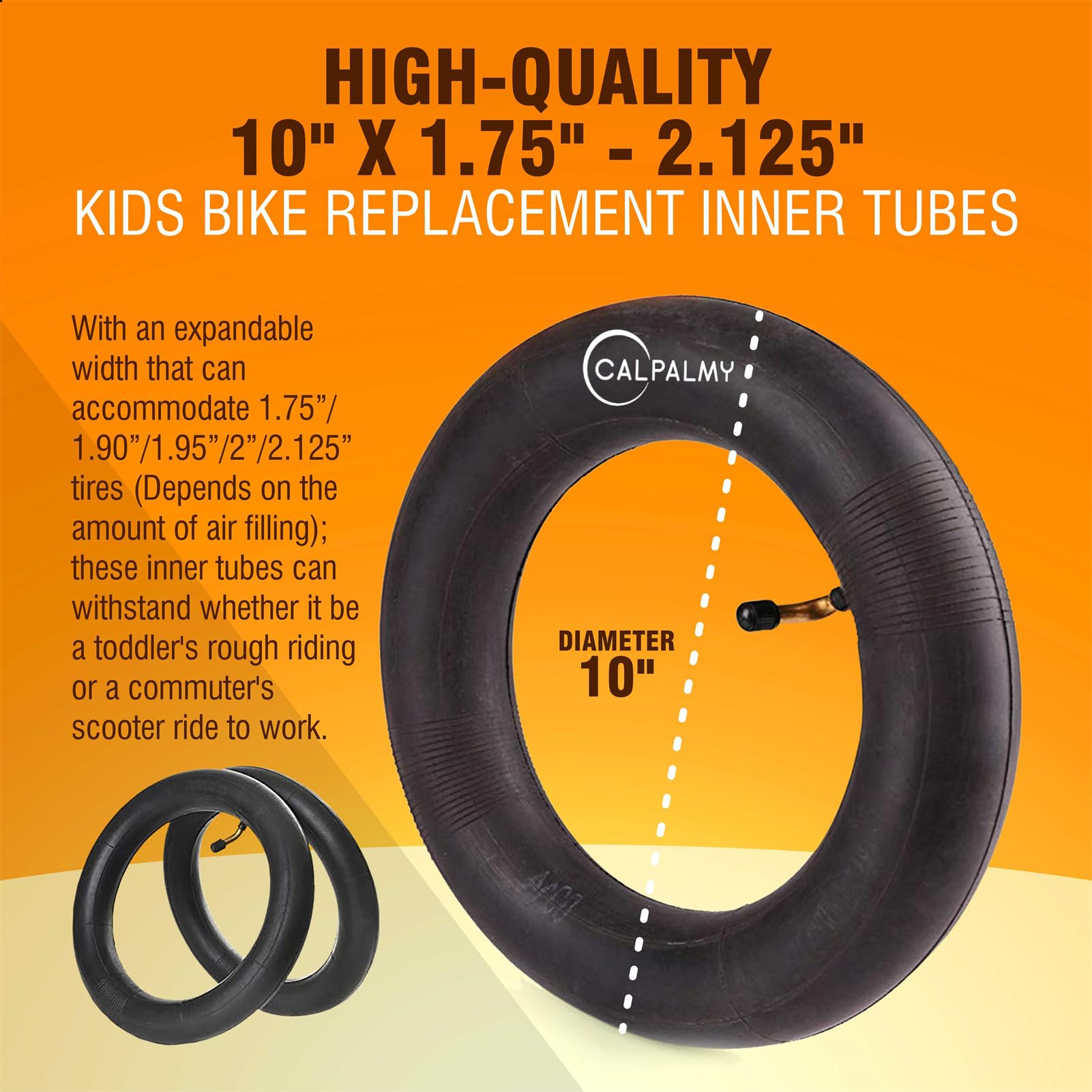 HIGH-QUALITY 10" X 1.75" - 2.125" KIDS BIKE REPLACEMENT INNER TUBES - Thick, heavy-duty, and dependable, these inner tires are perfect for numerous applications including inner tubes for toddler bikes, inner tubes for strollers, and inner tubes for electric scooters. With an expandable width that can accommodate 1.75“/1.90”/1.95“/2”/2.125“ tires (Depends on the amount of air filling); these inner tubes can withstand whether it be a toddler's rough riding or a commuter's scooter ride to work.