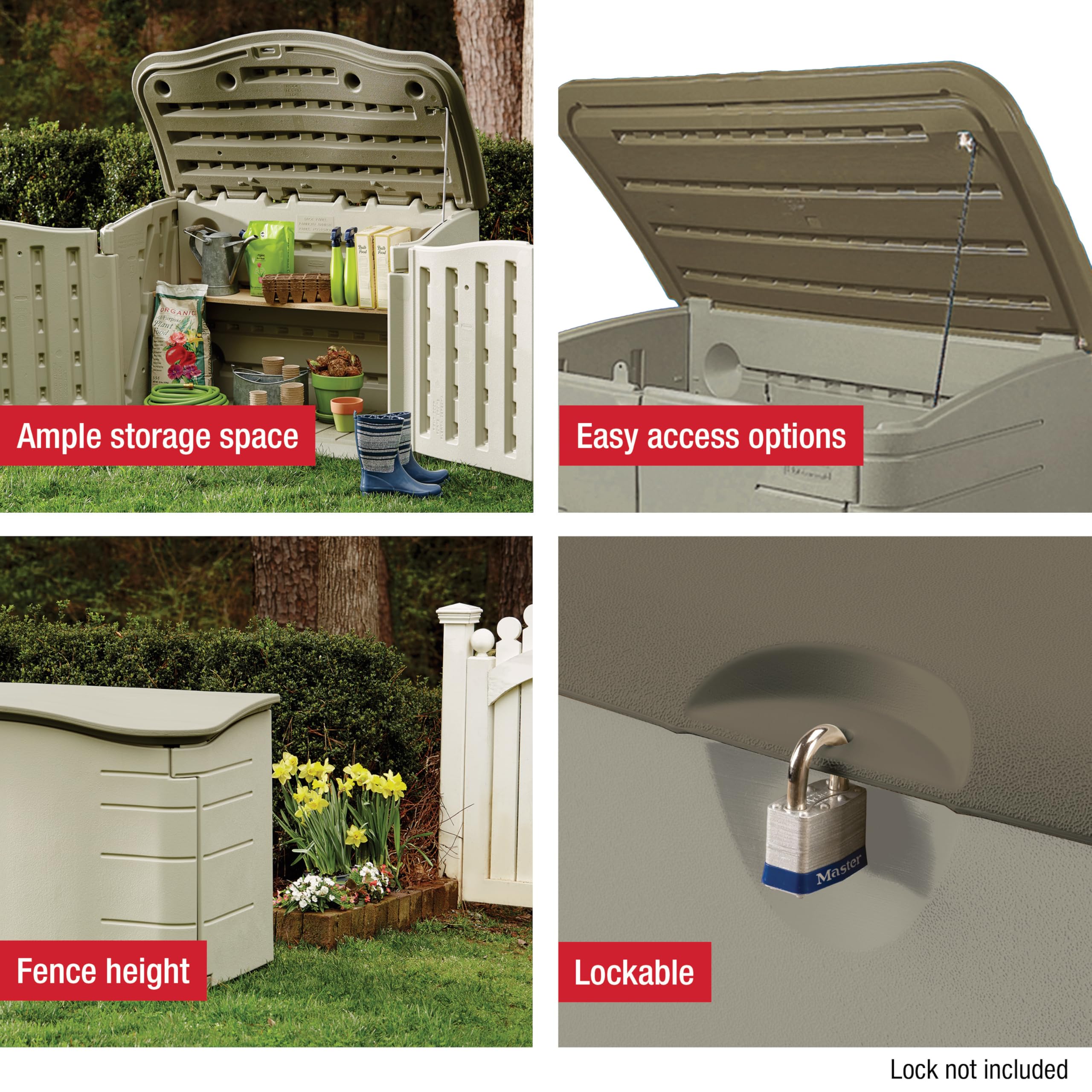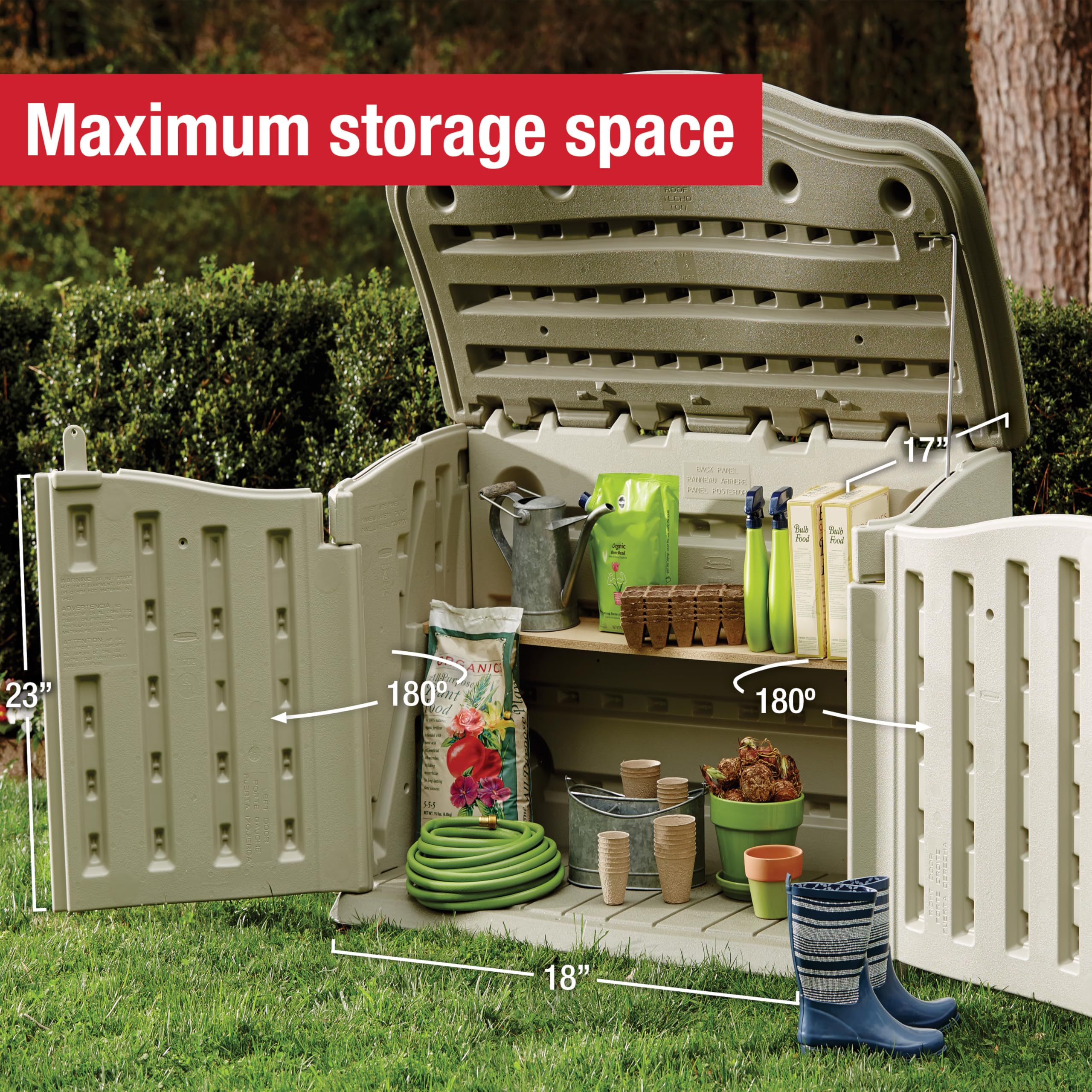 The Rubbermaid Small Horizontal Storage Shed won't be visible over common backyard fences and stores a vareity of items including small garden tools and supplies, firewood and more. Shed possesses various access points to enable quick and easy interior access through side doors and lid. The shed roof and siding are constructed of a durable resin for extra strength and security.