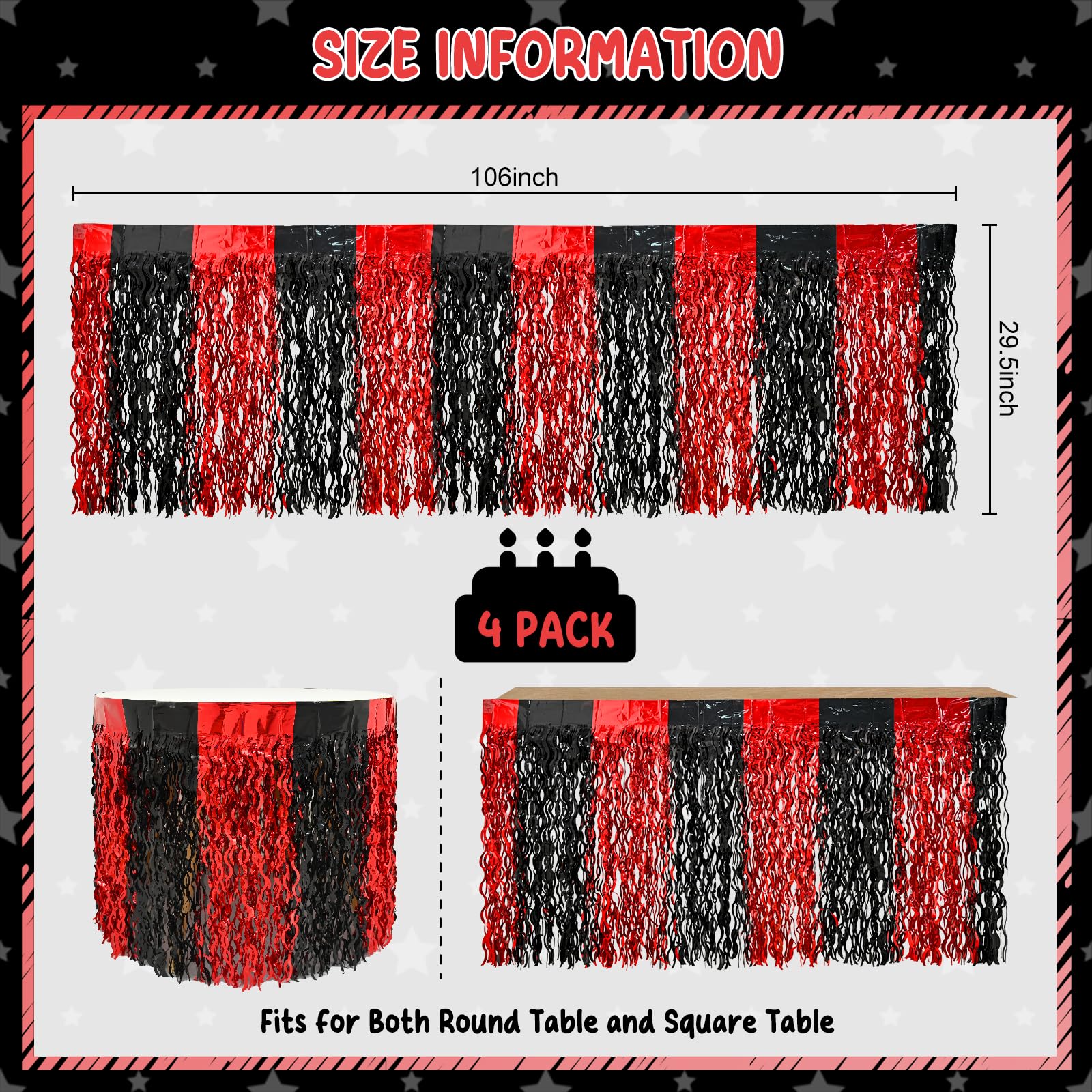 🎓【 PACKAGE 】: 4 pack red black foil fringe table skirts. Each skirt measures 106 x 29.5 inches (width x drop), providing you with ample coverage to adorn your party tables.
