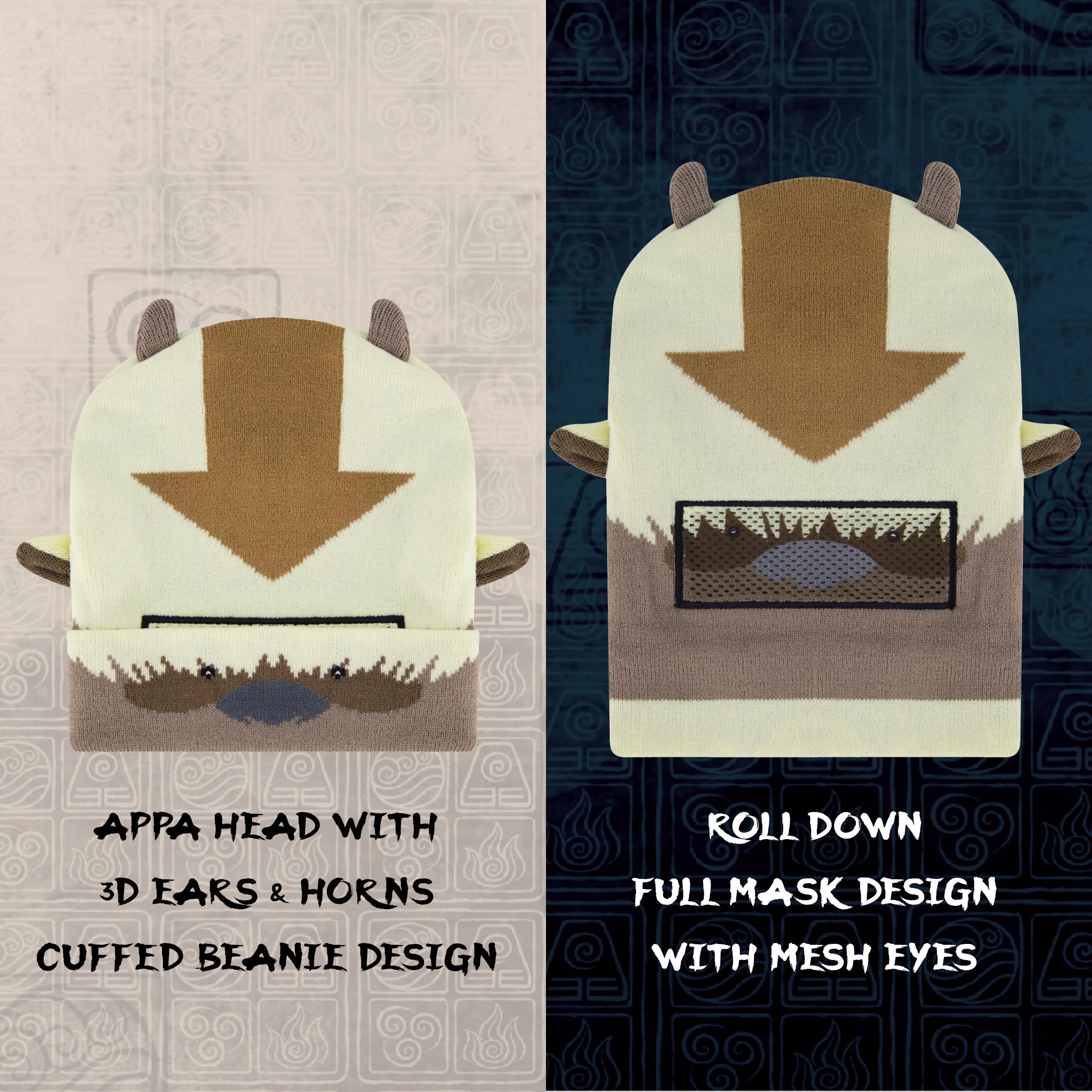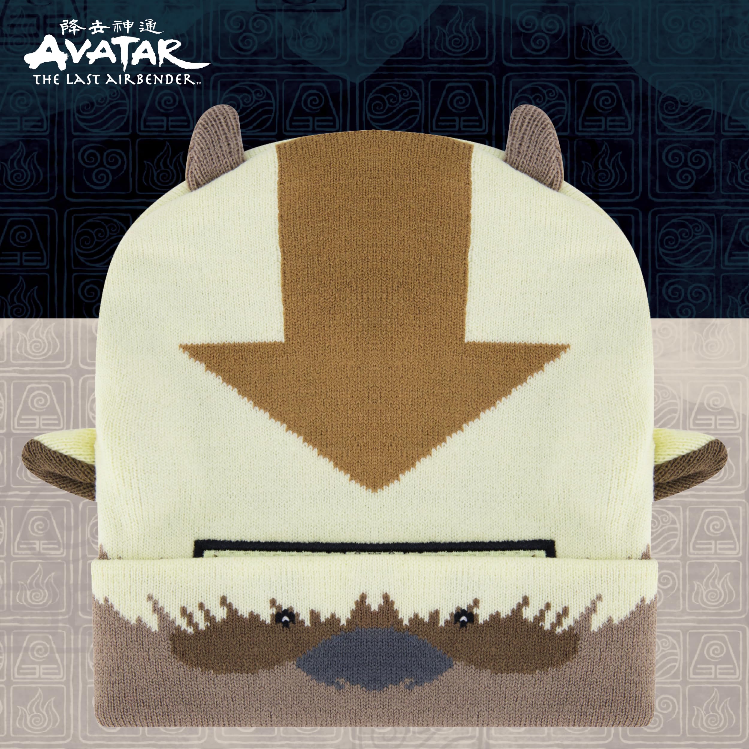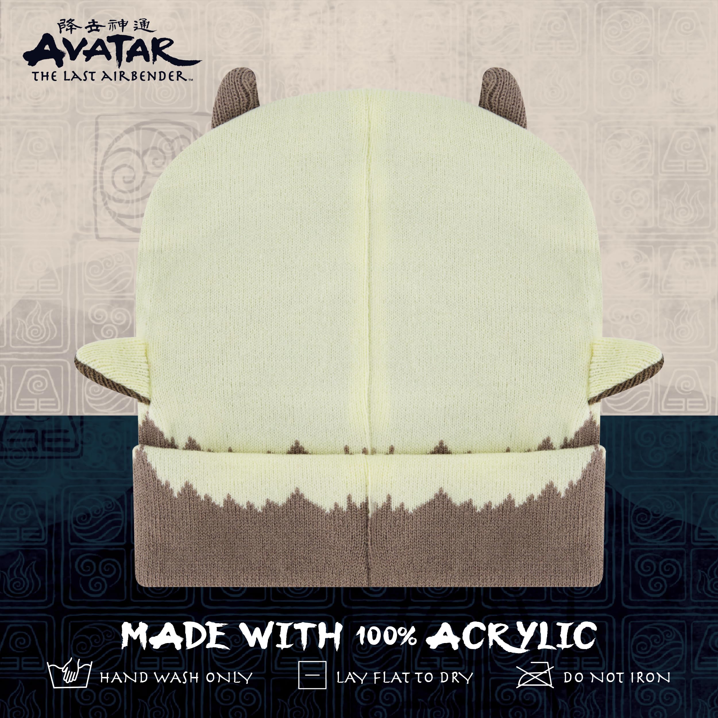 AVATAR BEANIE CAP: Knitted acrylic brimless cap featuring a cute and stylish Appa design with 3D ears and horns, and a convenient roll down design which allows you to wear the beanie in 2 different ways