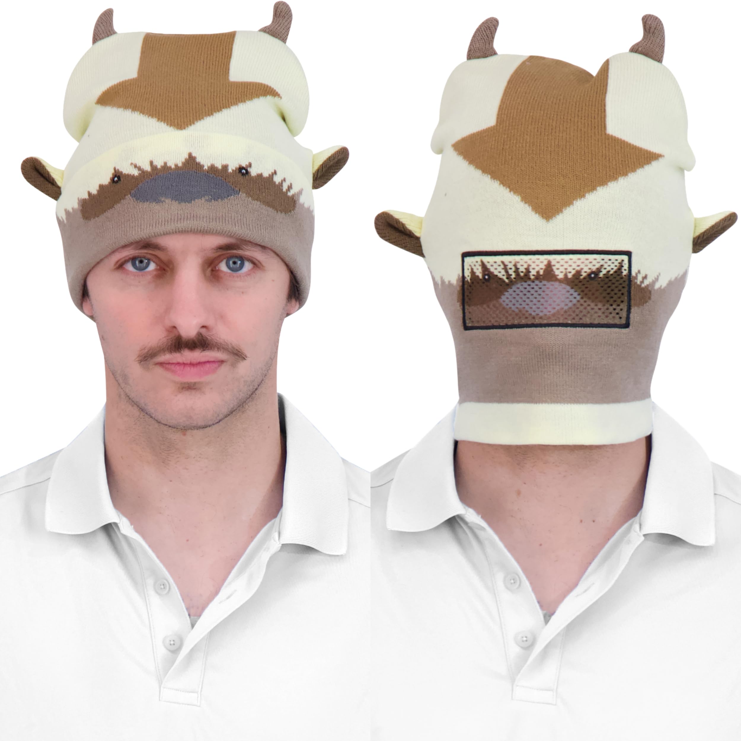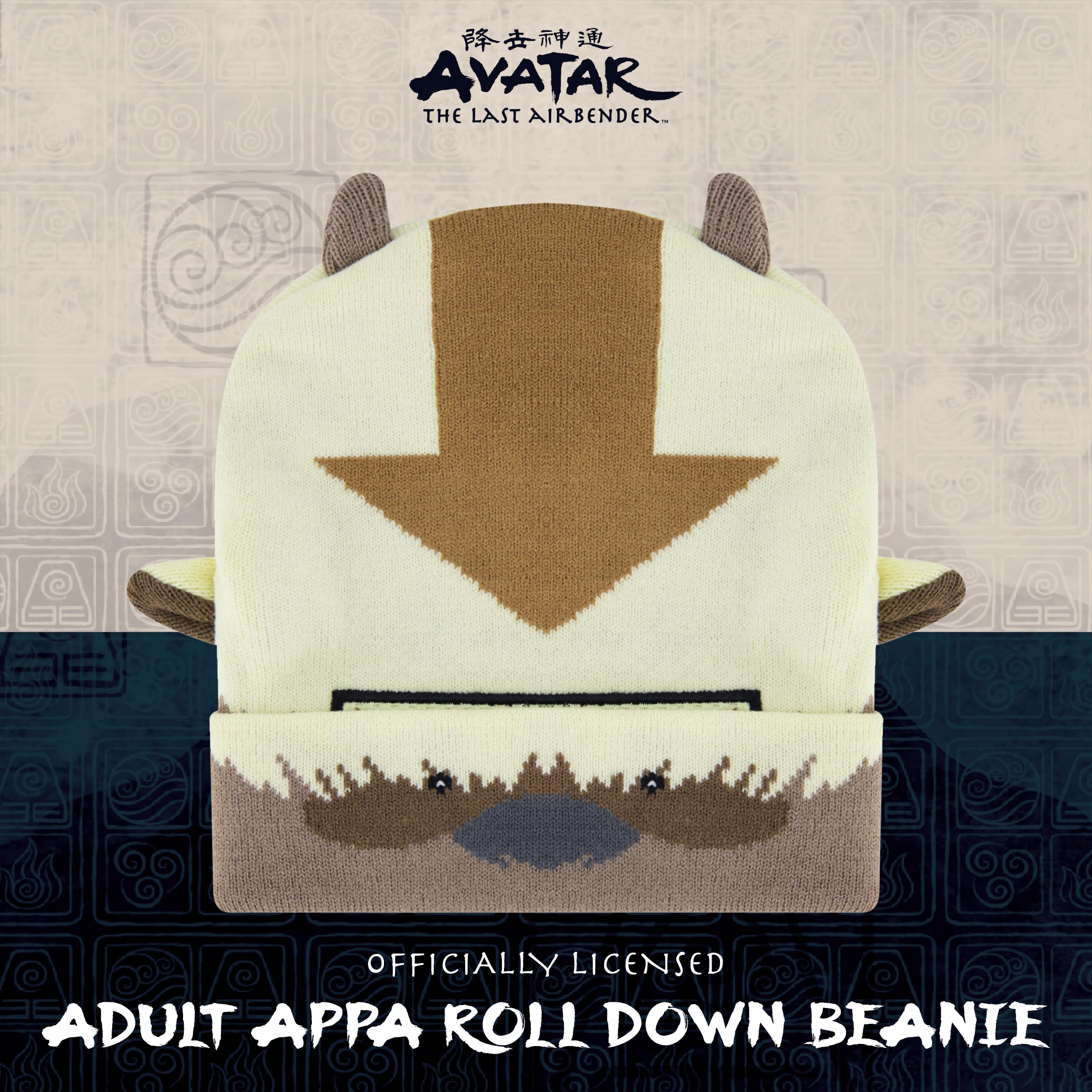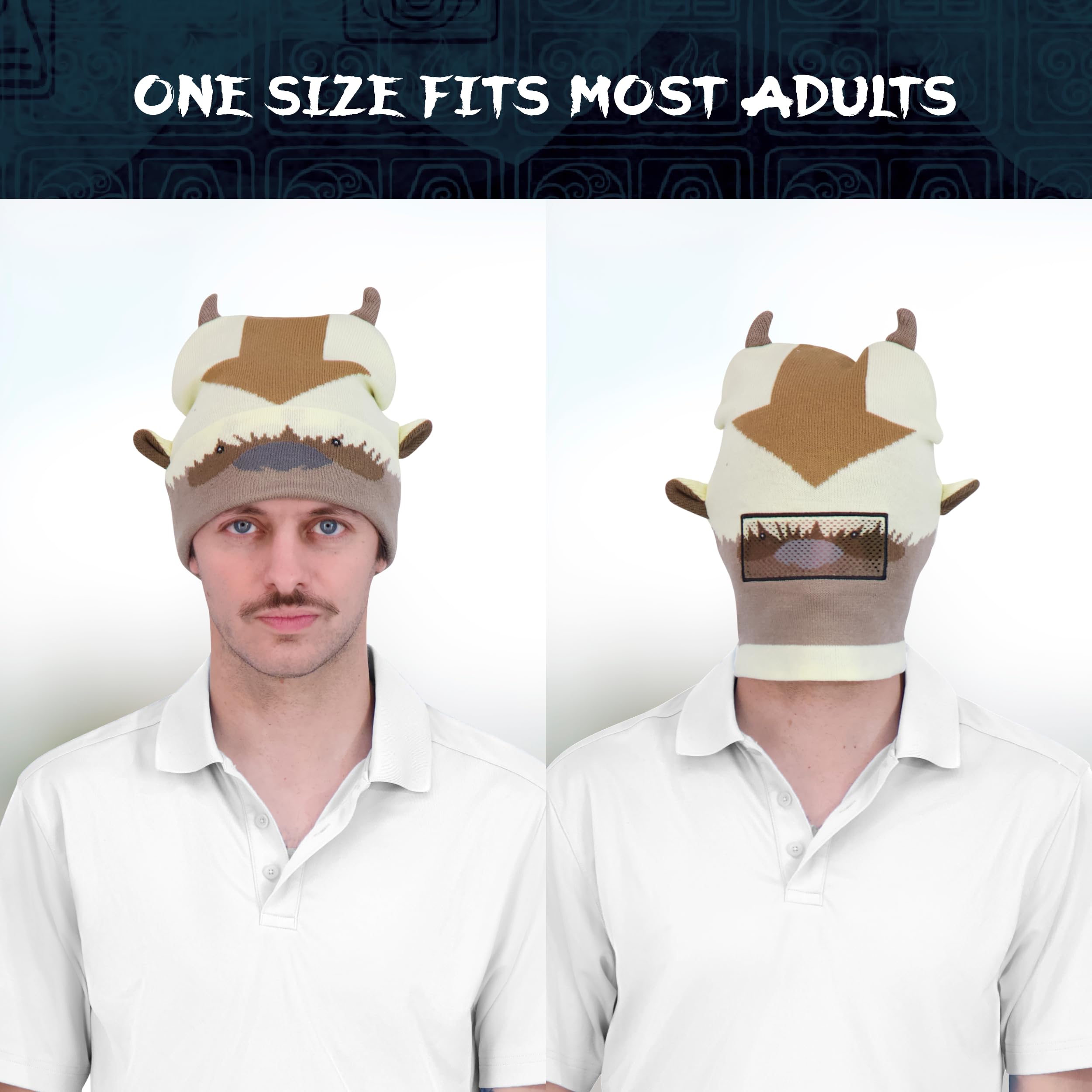 AVATAR BEANIE CAP: Knitted acrylic brimless cap featuring a cute and stylish Appa design with 3D ears and horns, and a convenient roll down design which allows you to wear the beanie in 2 different ways