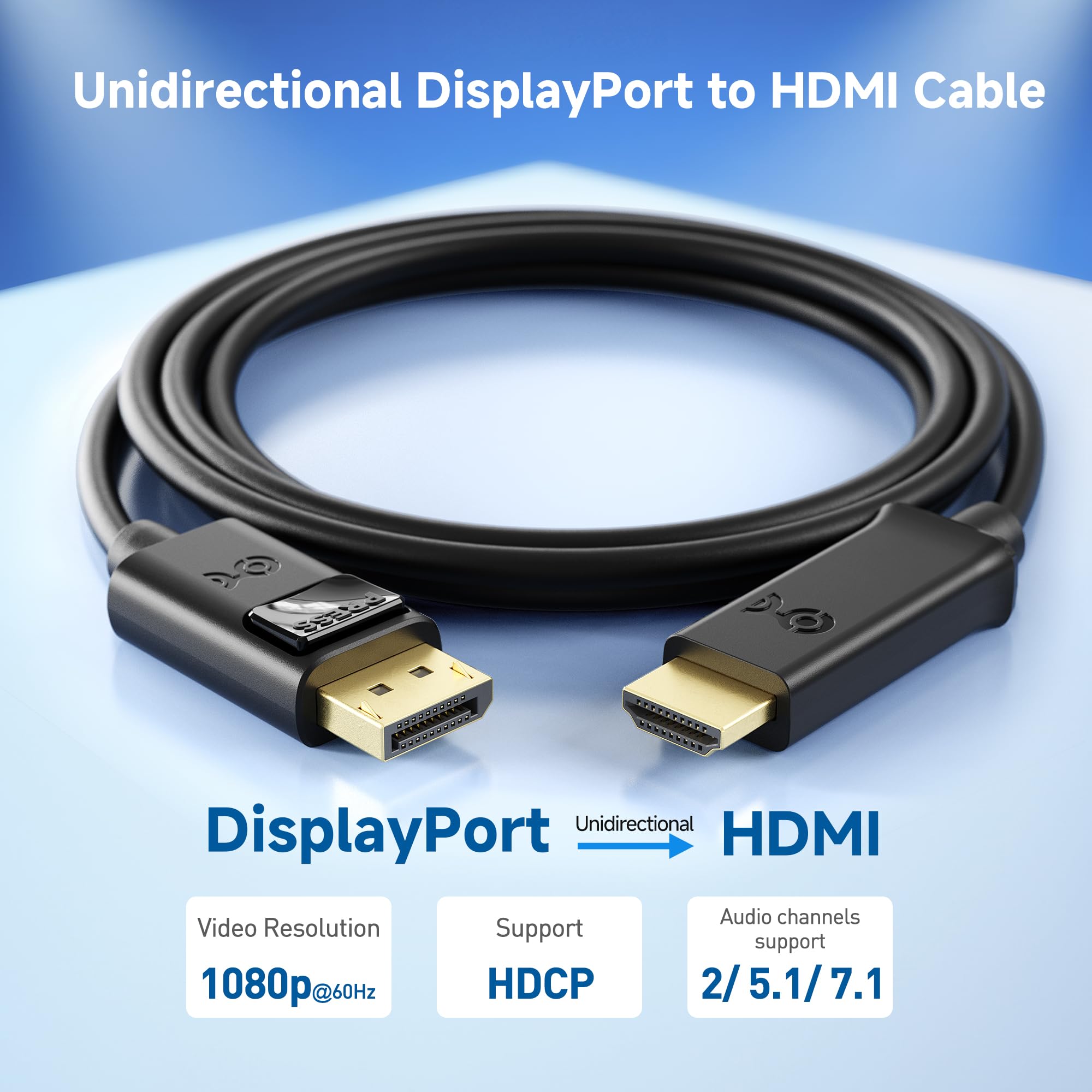 Full HD Resolution Support: The HDMI to DisplayPort adapter cable (HDMI to DP adapter cable) supports resolutions up to 1080p Full HD and flawless audio pass-through for uncompressed digital 7.1, 5.1, or 2-channel sound. Ideal for connecting DP-equipped laptops or desktops to HDMI monitors or TVs.