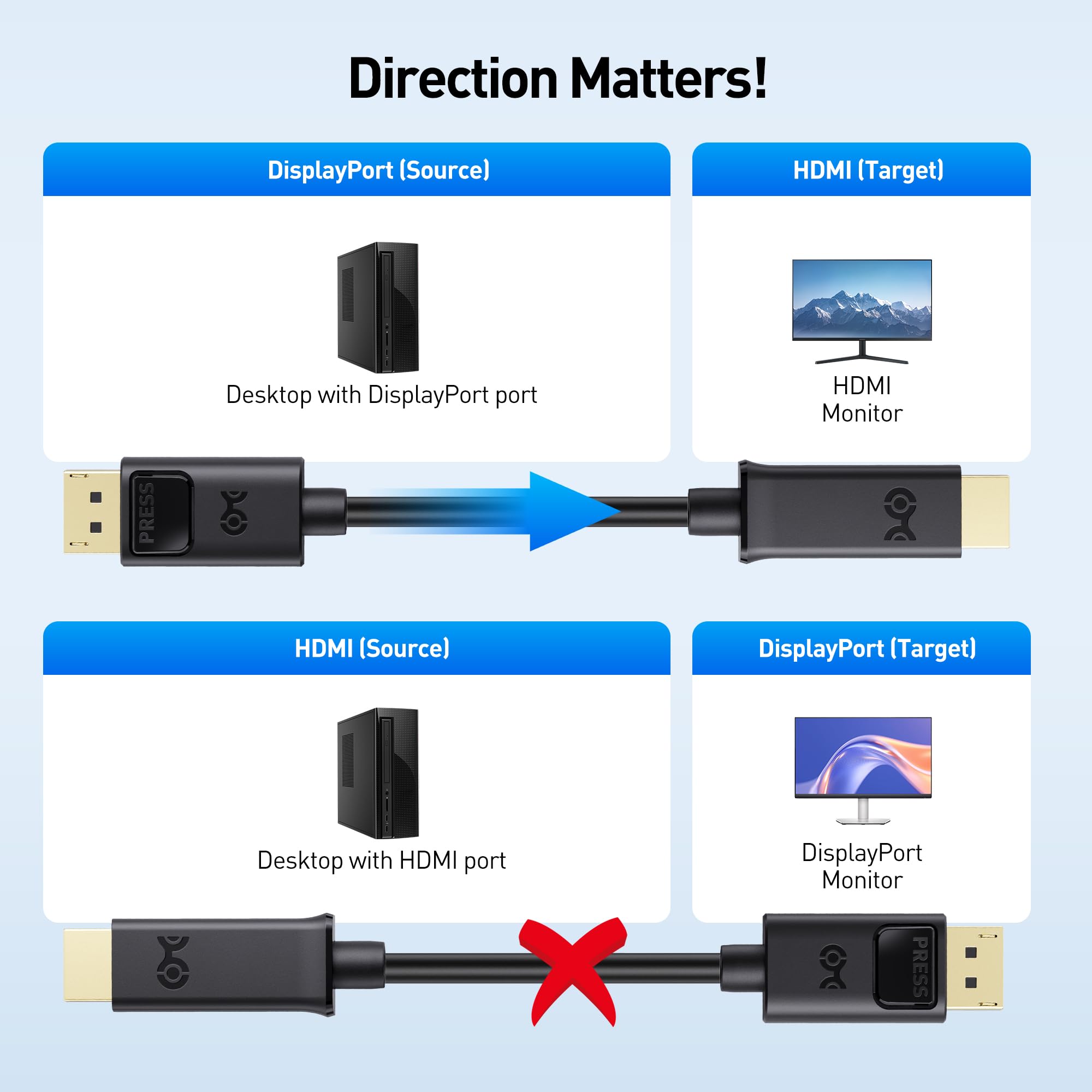 Reliable DisplayPort to HDMI Connection: This convenient DisplayPort to HDMI cable (DP to HDMI cable / HDMI to DP cable) directly connects a DisplayPort (DP, DP++, DisplayPort++) equipped computer to an HDTV, monitor, or projector with HDMI input—perfect for home entertainment, office setups, or classrooms.
