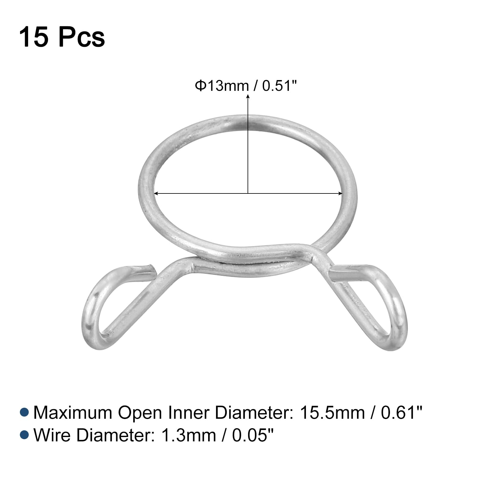 Package and Size: Material: 304 Stainless Steel, Maximum Open Inner Diameter: 15.5mm / 0.61inch, Inner Diameter: 13mm / 0.51inch, Wire Diameter: 1.3mm / 0.05inch, Package Content: 15 Pcs Fuel Line Hose Clips