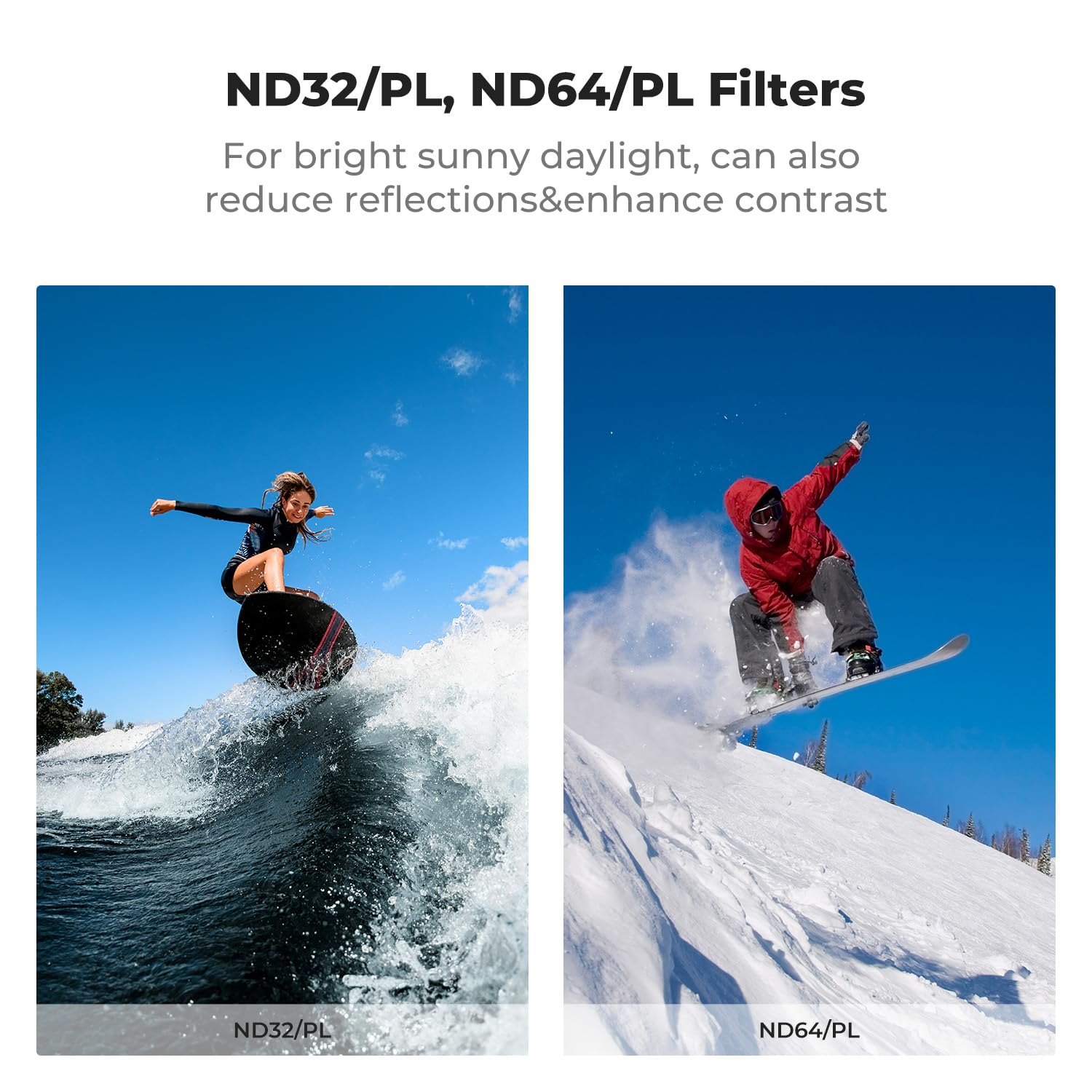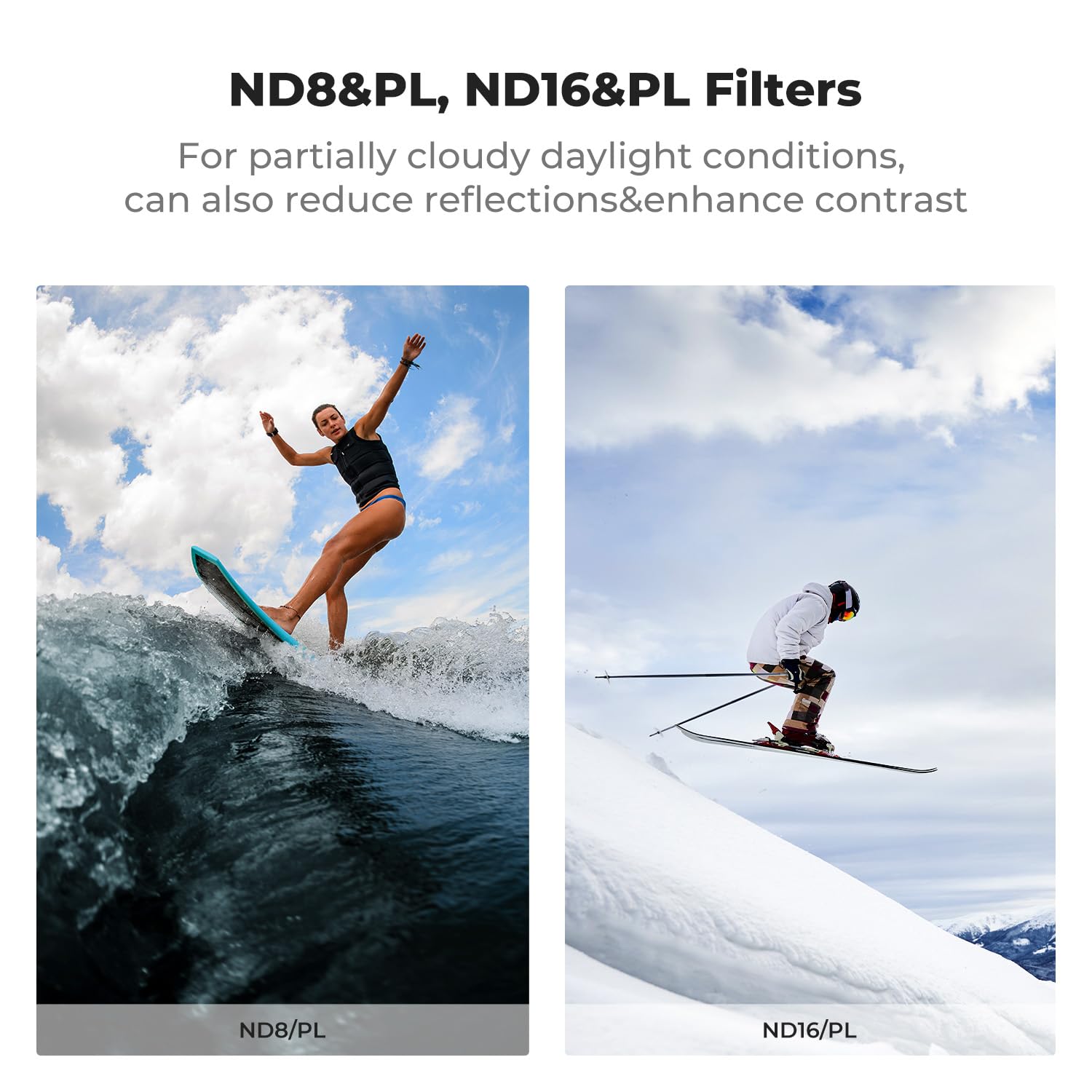 Compatible With DJI Osmo Action 5 Pro/Action 4: This latest ND/PL filter kit from K&F Concept is specially designed for DJI Osmo Action 5 Pro and Osmo Action 4, suitable for capturing sports at noon or in brightly daylight scenarios like snow fields. A lower shutter speed and reflections enhance motion blur and a more striking visual effect.