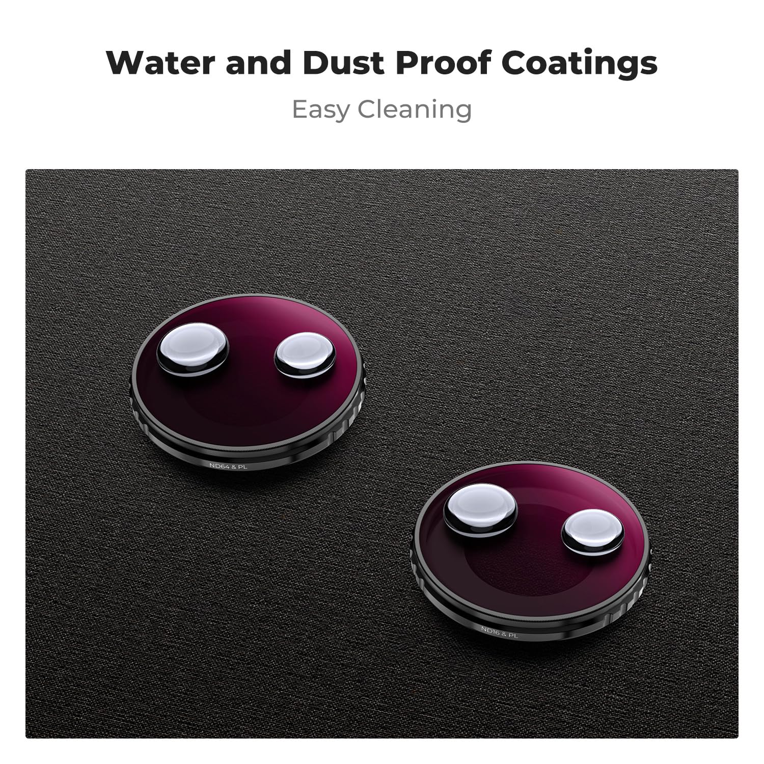 Hybrid ND&PL Filter 2-in-1: One filter combines the ND and CPL filter features, the ND8/PL, ND16/PL, ND32/PL, and ND64/PL offer 3,4,5 and 6 stops of light reduction individually, help get precise exposure control in different lighting conditions, and avoid unwanted reflections coming from non-metallic surfaces, such as water, glass, etc, and contribute to increasing the contrast and saturation in blue skies and white clouds.