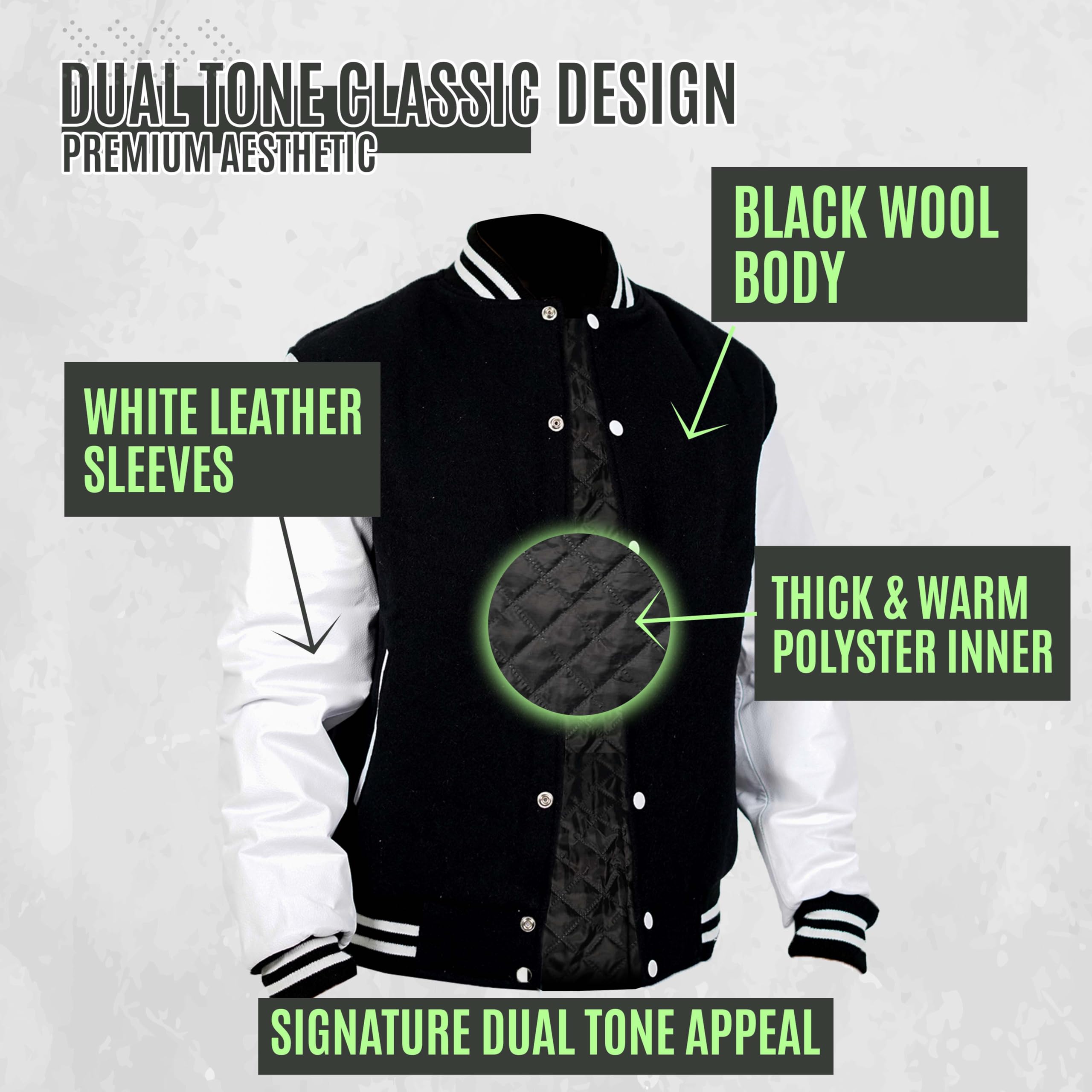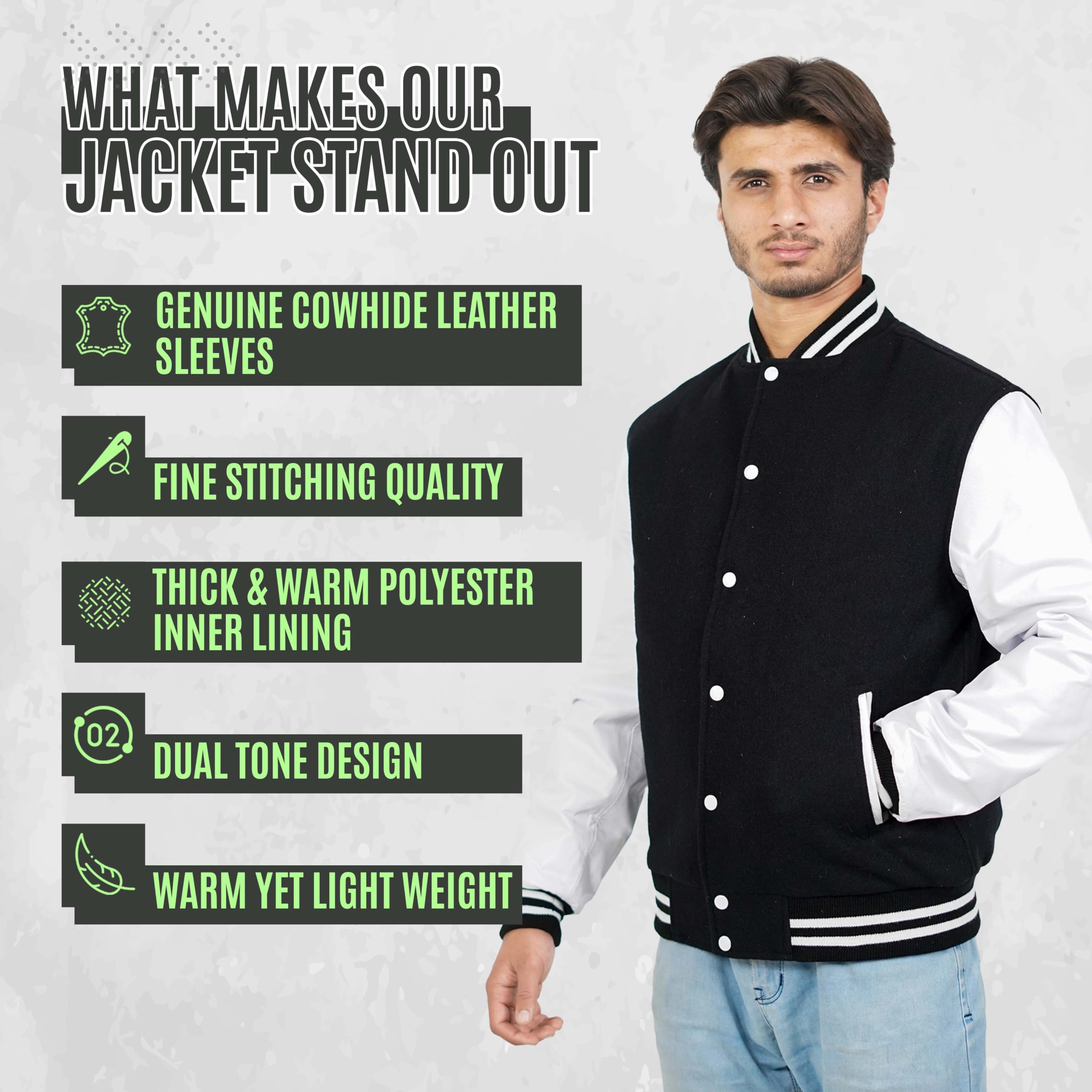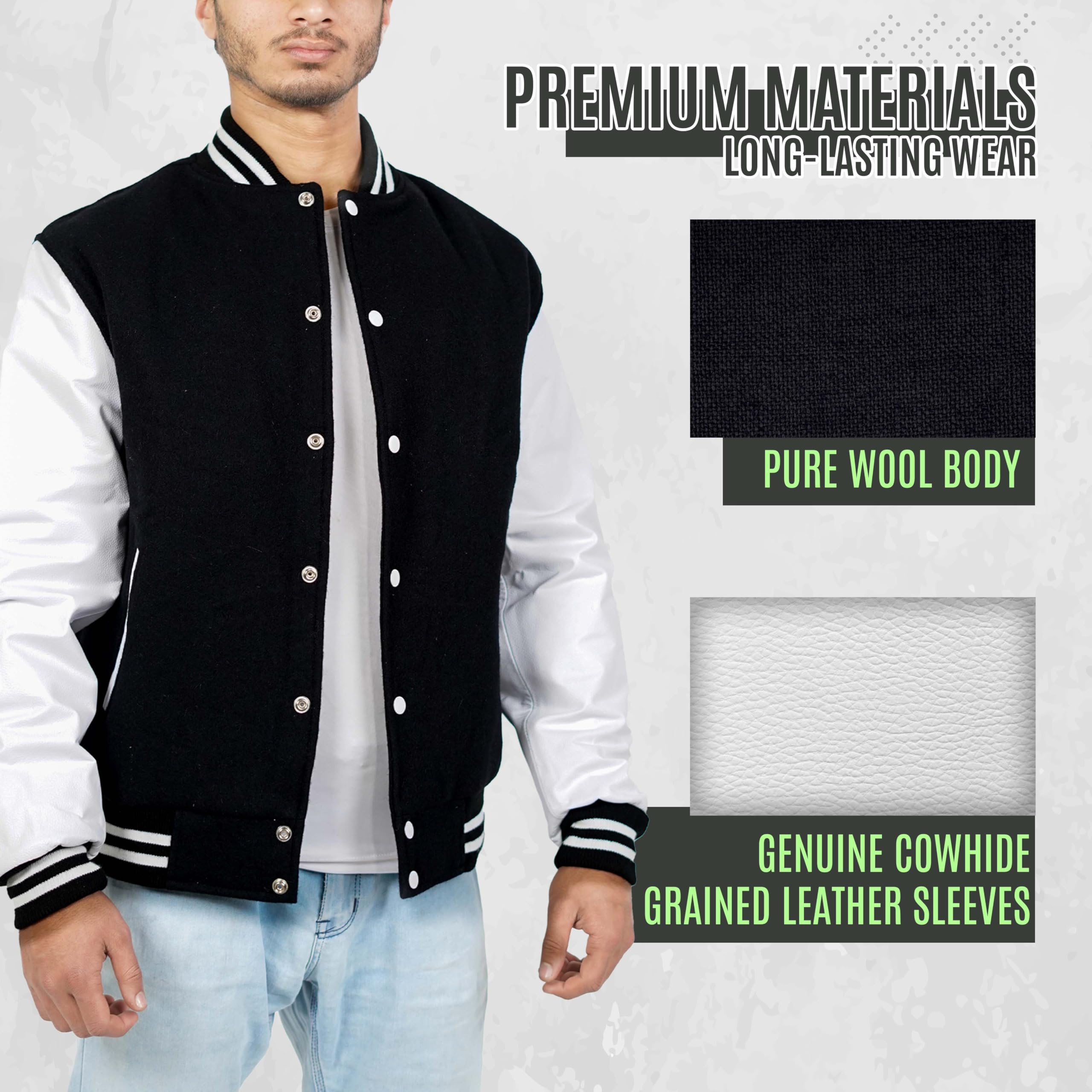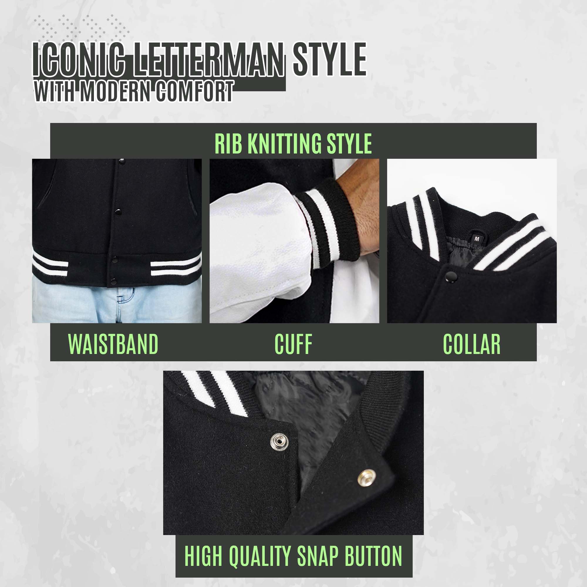 Timeless Varsity Design: This black and white jacket men combines iconic letterman style with a modern fit, featuring snap button closure, ribbed knitting on collar, cuffs and waist band, and a sleek design with white leather sleeves that works equally for casual outings, social events and athletic looks.