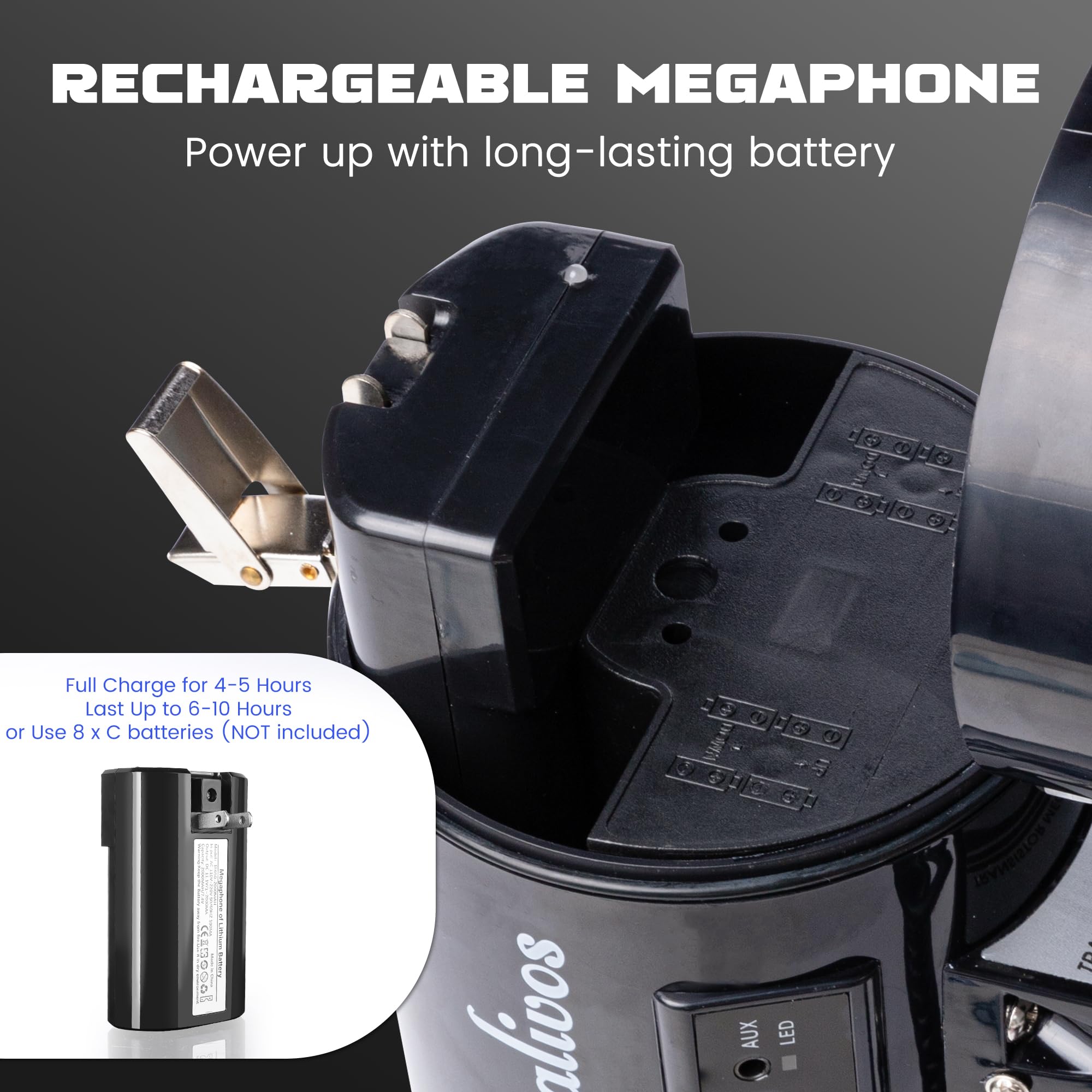 Two Power Supply: Powered by a 1800mAh rechargeable battery (included) or 8×C batteries (not included), the megaphone has long-lasting use life, prevent dead battery surprises during events