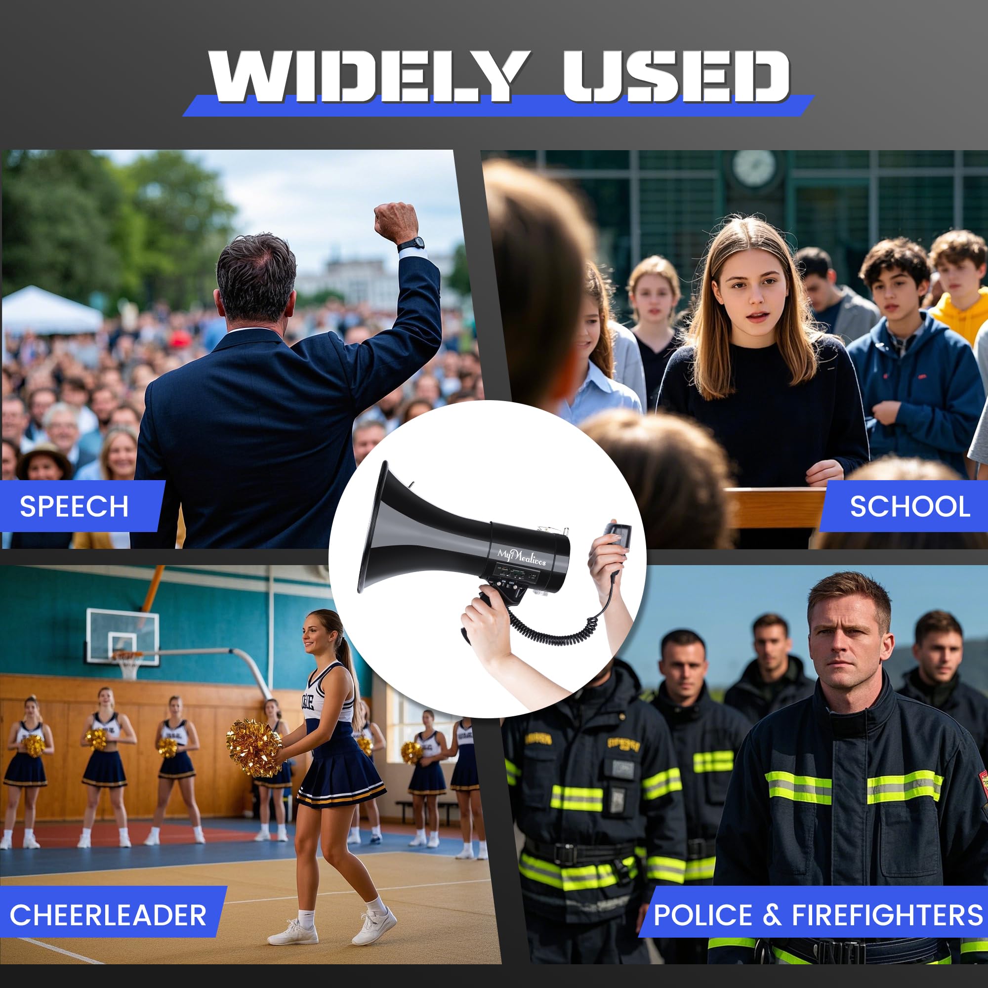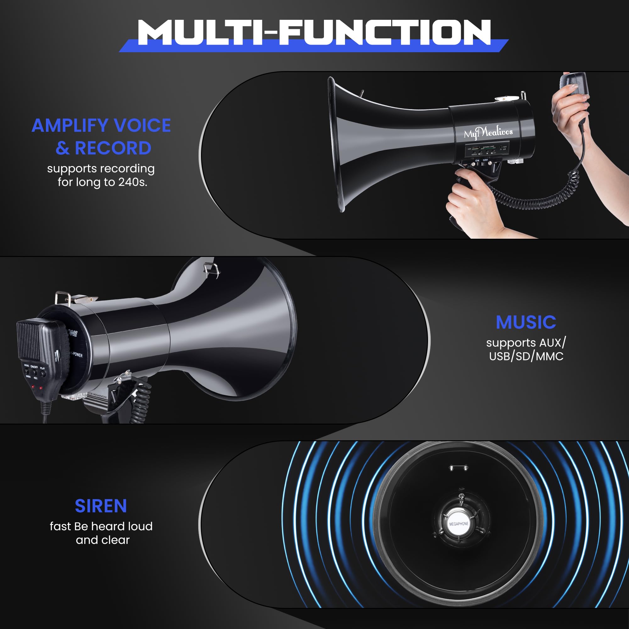 Siren Cover Up to 1200 Yards: Want to quickly attracts people's attention? This functional megaphone speaker bulits in sirens, fits for different large outdoor activities and emergency.