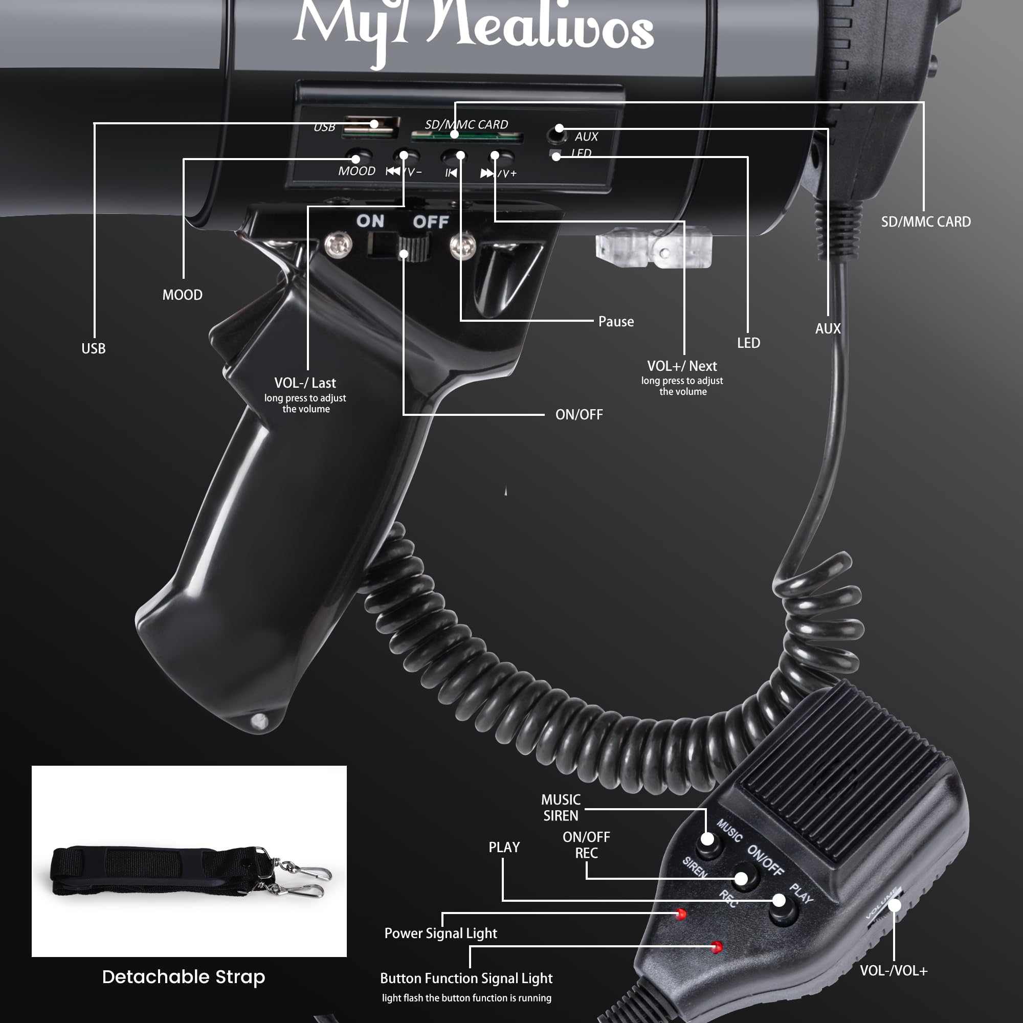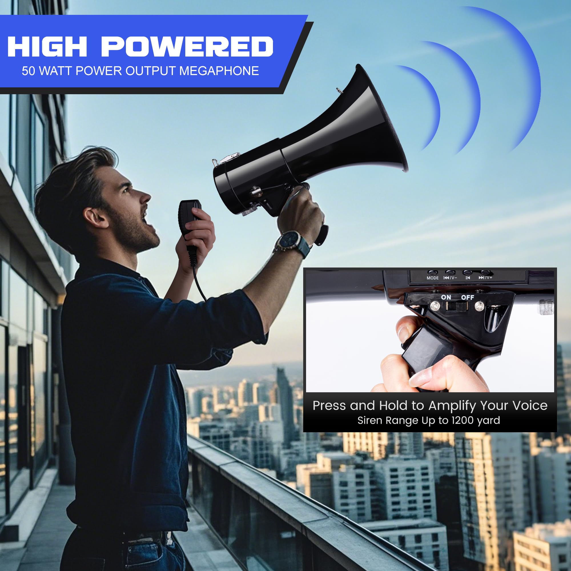 Attention Please: This megaphone is not Bluetooth style. Please do not purchase if you mind. Voice Cover Up to 1600 Feets: Providing clear voice across large stadiums or open fields, this professional 50W megaphone can help everyone hear you through crowd noise, ideal for coaches, event organizers. Siren Cover Up to 1200 Yards: Want to quickly attracts people's attention? This functional megaphone speaker bulits in sirens, fits for different large outdoor activities and emergency. Two Power Supply: Powered by a 1800mAh rechargeable battery (included) or 8×C batteries (not included), the megaphone has long-lasting use life, prevent dead battery surprises during events Portable & Ergonomic: Comes with a detachable strap and handheld MIC, making it more convenient to use, decrease the burden of use. While the ergonomic design at the handle ensures comfortable during extended use