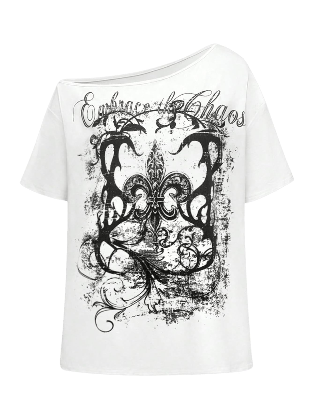 Features: graphic print, halfsleeve, boat neck, drop shoulder, goth tee shirts, y2k trendy tee tops