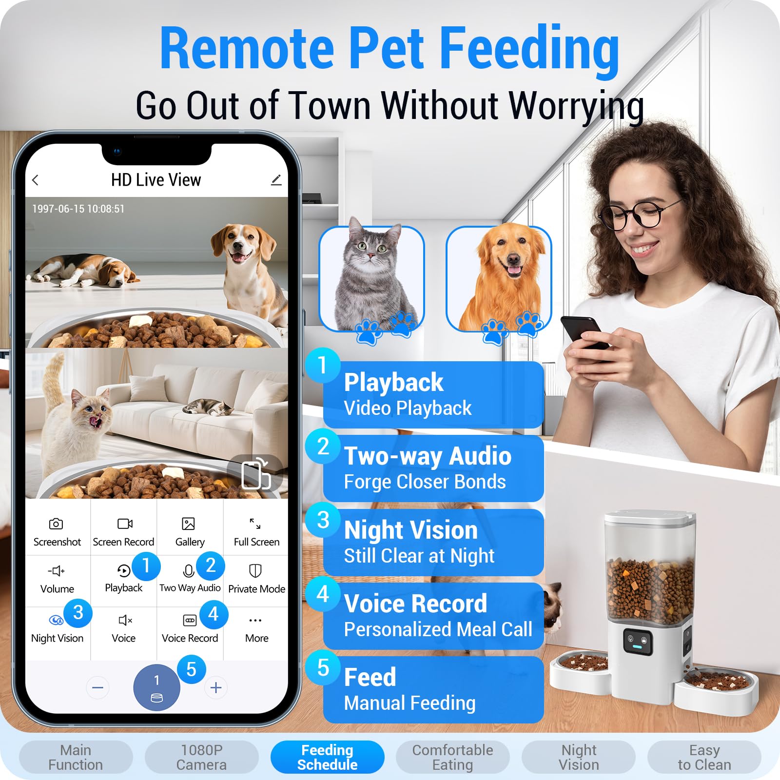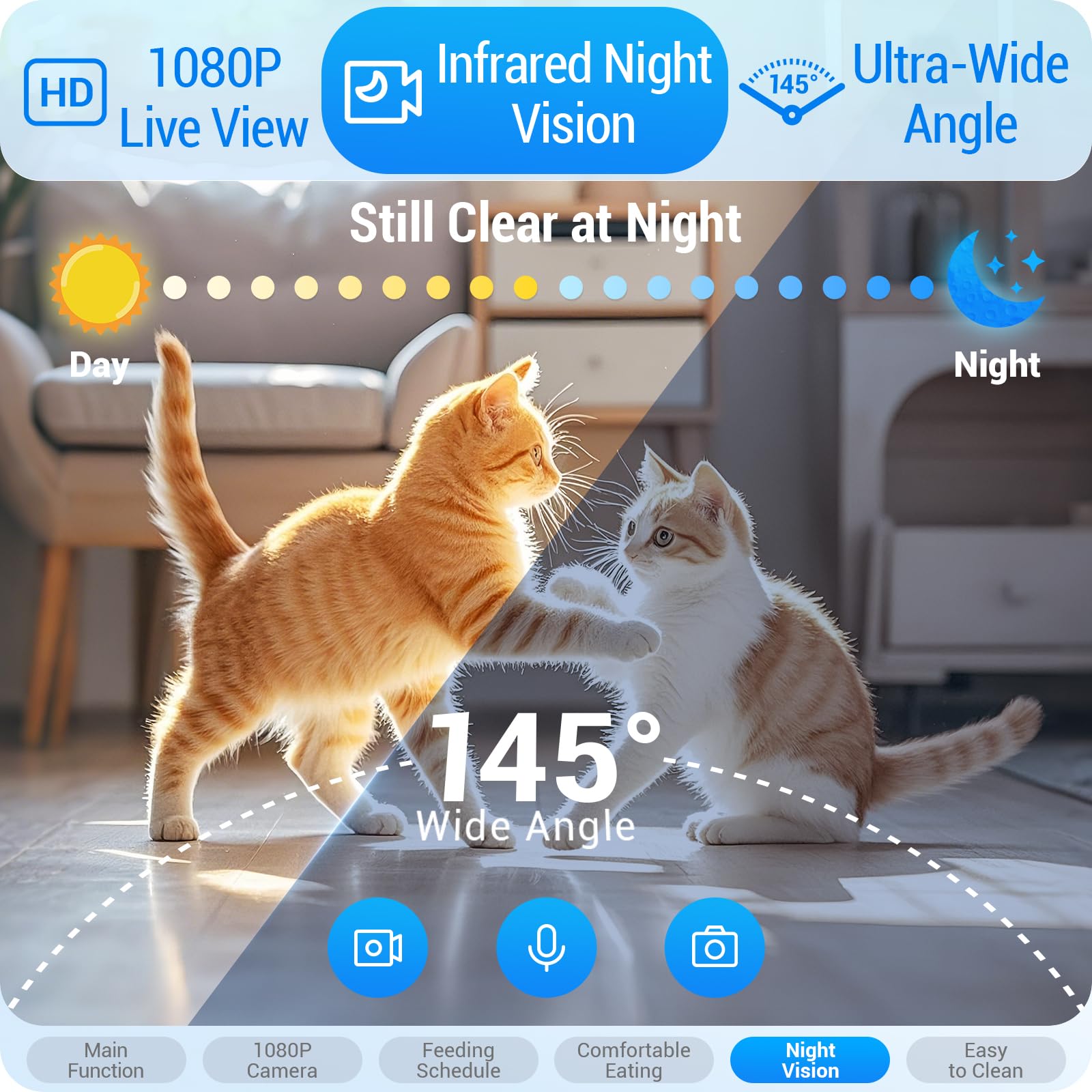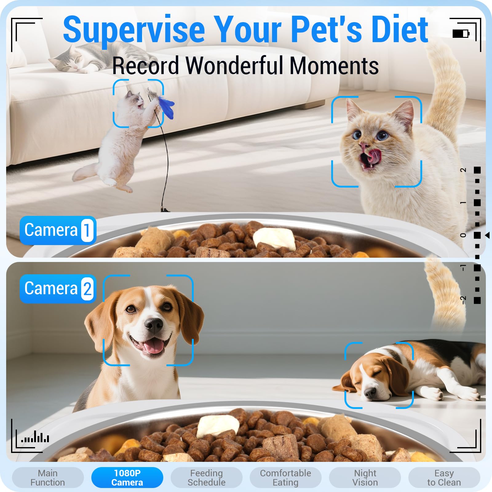 Record Wonderful Moments ( Life ) : More than just feeding, this automatic cat feeder with camera allows you to be there even when you’re away. Equipped with two Full HD 1080P lenses, it captures every playful antic and mealtime moment with crystal-clear clarity. Advanced infrared Night Vision ensures you can check on your pet’s safety even in pitch darkness. Triggered by smart motion detection, the App sends instant alerts to your phone whenever your cat is active. You can snap photos, record videos, and save those precious memories locally via a Micro SD card (up to 128GB) or use secure cloud storage.
