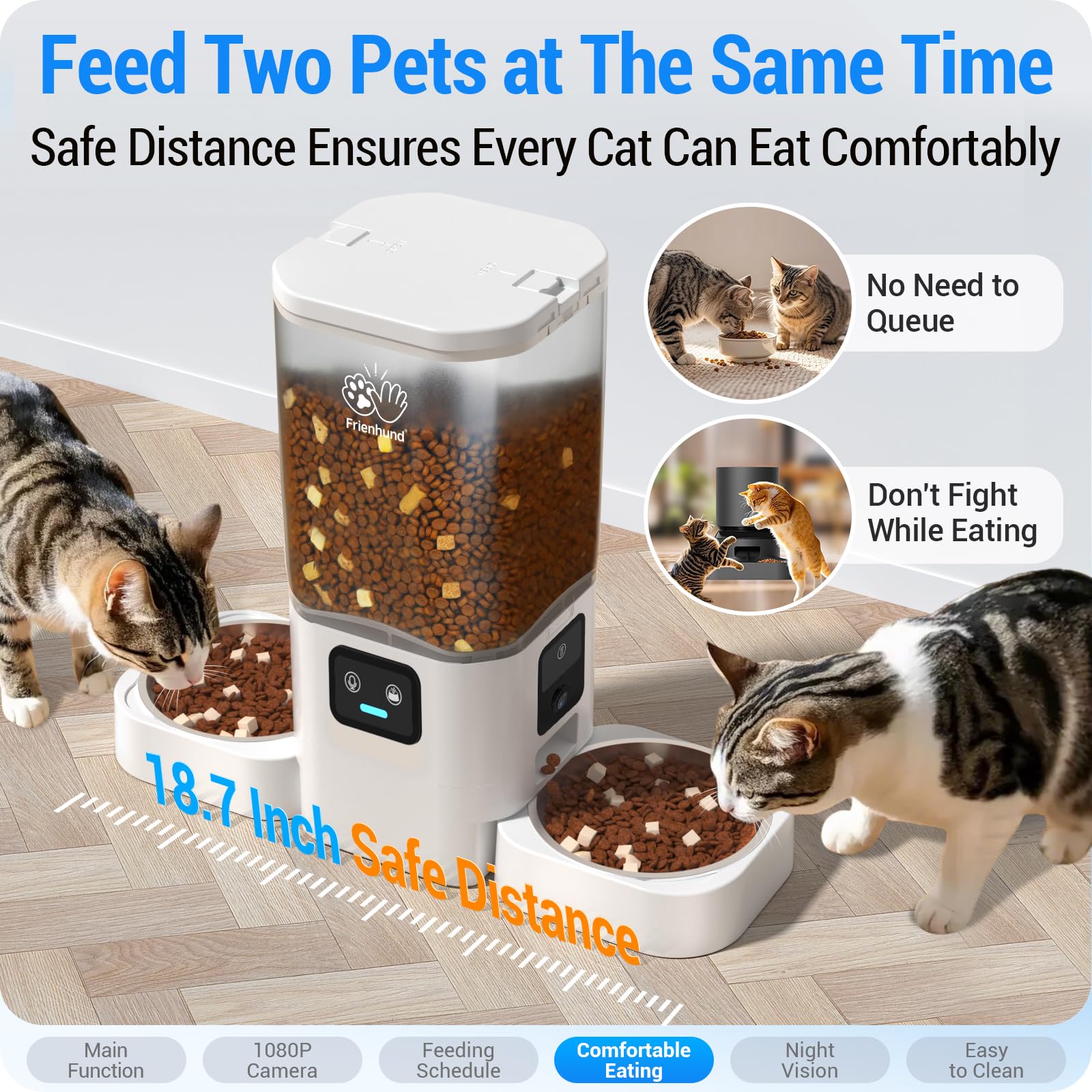 Personal Bubble : Say goodbye to mealtime rivalry. While standard cat automatic feeders often place bowls too close together, leading to food guarding and stress, our design features a spacious 18.7-inch separation. This generous distance ensures each pet has its own "personal bubble," allowing them to eat in peace without feeling threatened or waiting for the other to finish. It’s the perfect solution for multi-pet households looking to foster a calm, healthy eating environment.