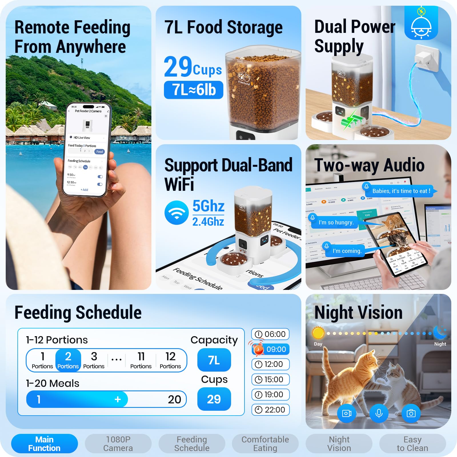 Pet Lovers : Frienhund offers a free one-year warranty and 24/7 online service for our automatic cat feeder 2 cats. The automatic pet feeder is designed for all pet lovers like me, if you have any problems, you can contact us by order, email, or phone. We will solve your problem until it is solved.