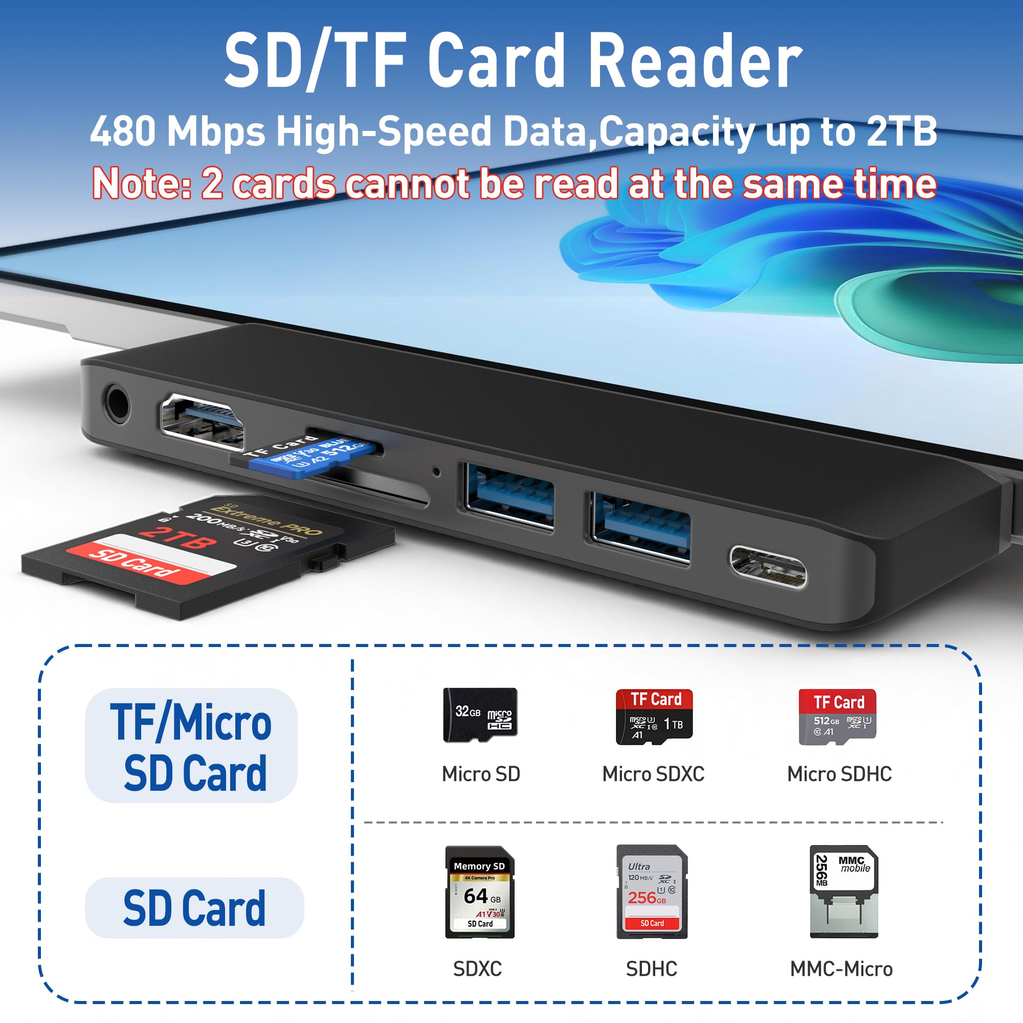 Ultra-High-Speed Data Syncing & Expanded Storage: Equip your Surface Pro 12 with versatile, high-speed data channels. Experience blazing 40Gbps bandwidth via the Thunerbolt 4 USB-C port—ideal for large files and high-performance peripherals. Two USB 3.0 ports support up to 5Gbps for quick connections to hard drives, keyboards, and more. A dedicated SD/TF card reader offers transfer speeds up to 480Mbps, supporting cards up to 2TB—perfect for photographers and creators. Note: The SD and TF card slots share one reader and cannot be used simultaneously.